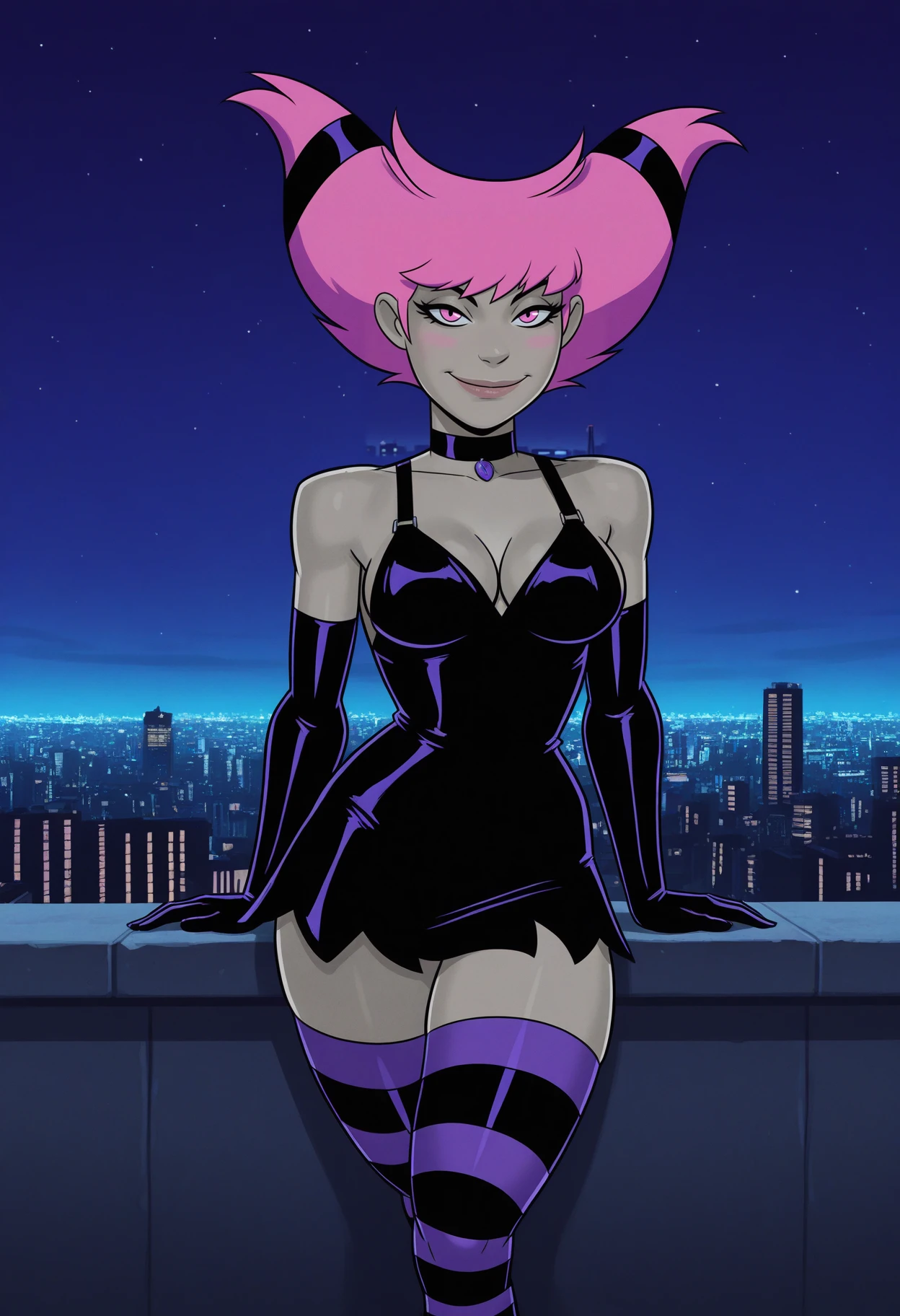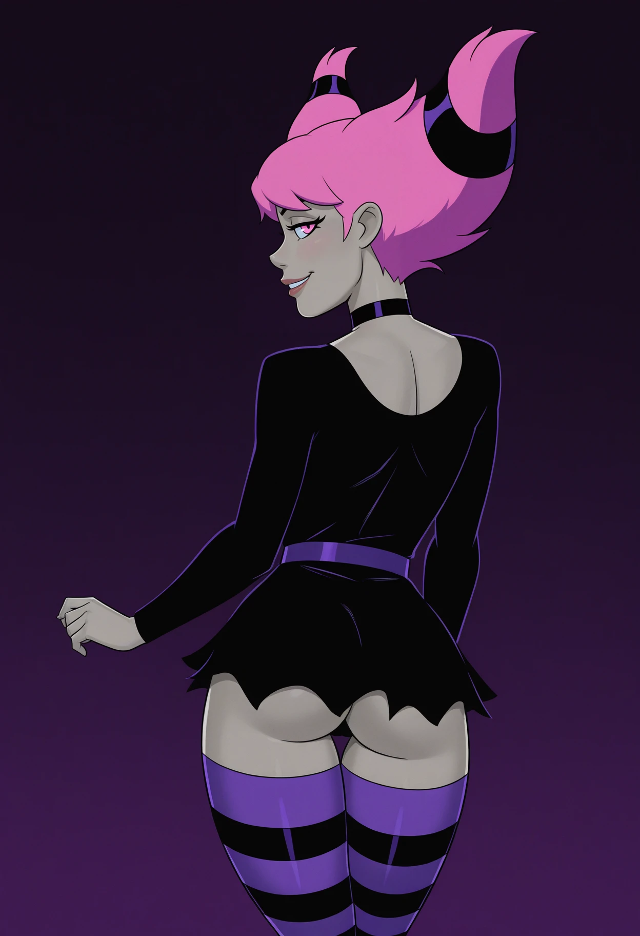 1girl, solo, colored skin, grey skin, pink eyes, pink hair, short hair, twintails, breasts, medium breasts, choker, black choker, dress, black dress, short dress, cleavage, gloves, black gloves, elbow gloves, zettai ryouiki, thighhighs, striped thighhighs,