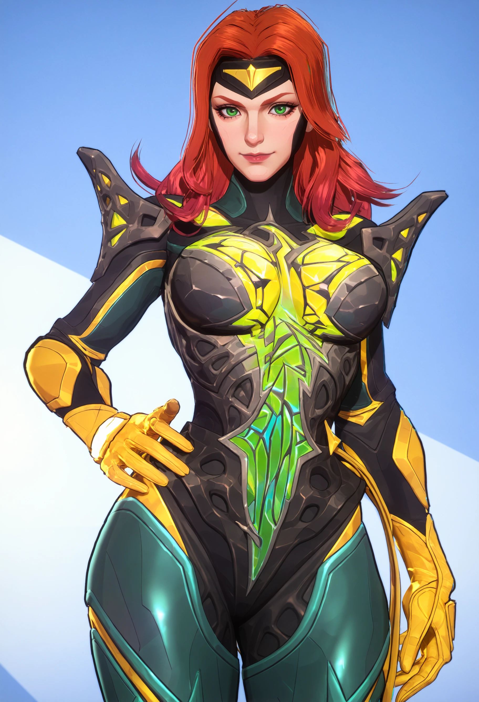 jgmr,3d,multicolored ,long hair,green eyes,red hair,armor,yellow boots,armored boots,parted bangs,forehead protector,yellow gloves