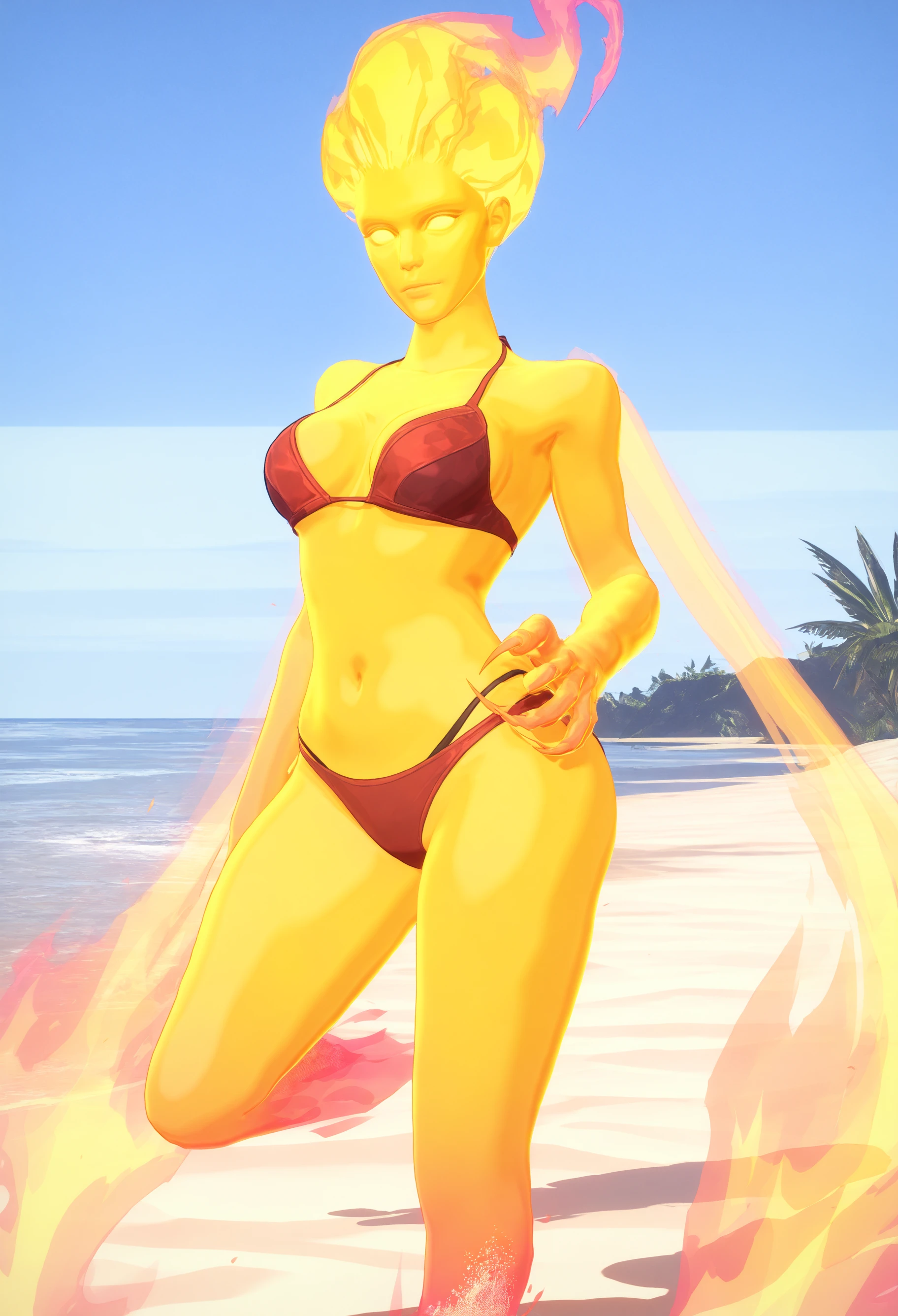 phoenixmr, 3d, fire elemental, monster girl, yellow skin, fiery hair, yellow wings, glowing eyes, no , no pupils,navel,no , , sharp fingernails,no feet, blank eyes