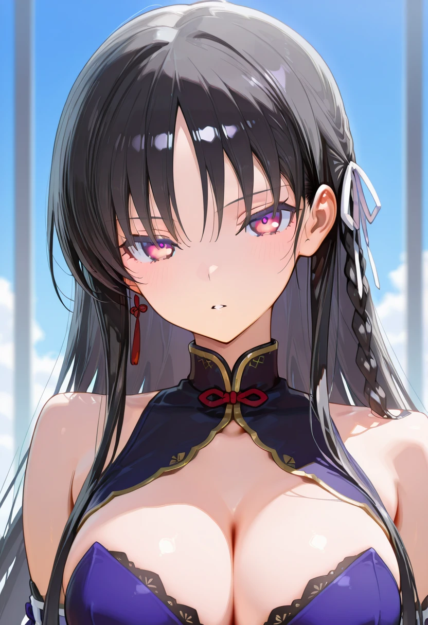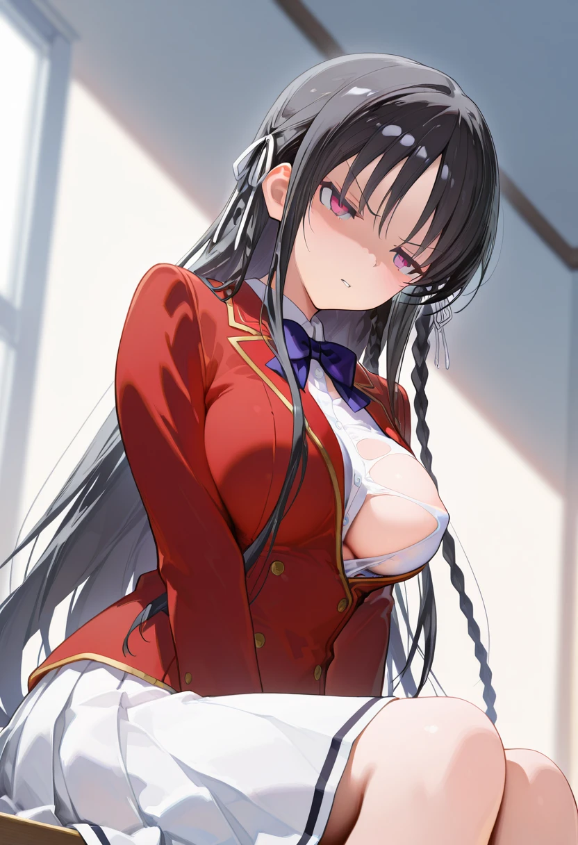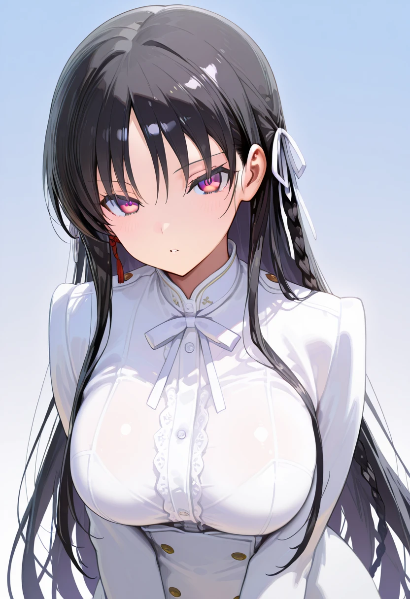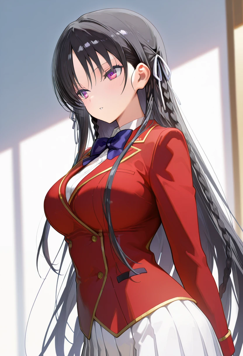 horikita suzune,long hair,black hair,hair ribbon,ribbon,braid,white ribbon,Colored pupils,red eyes,purple eyes,