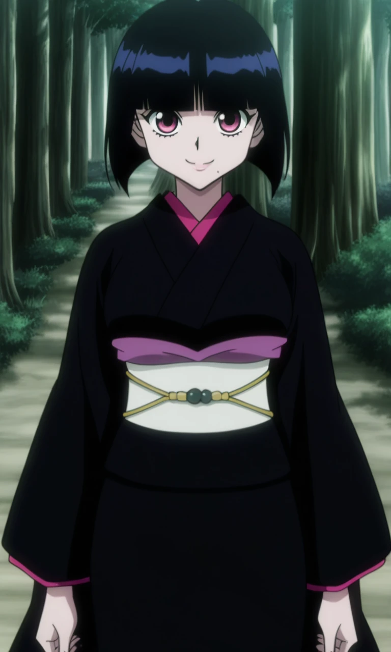 kalluto zoldyck,1girl,solo, bob cut, black hair, blunt bangs, pink eyes, mole under mouth,japanese clothes,black kimono,sash, obi, wide sleeves, long sleeves, tabi, sandals,
