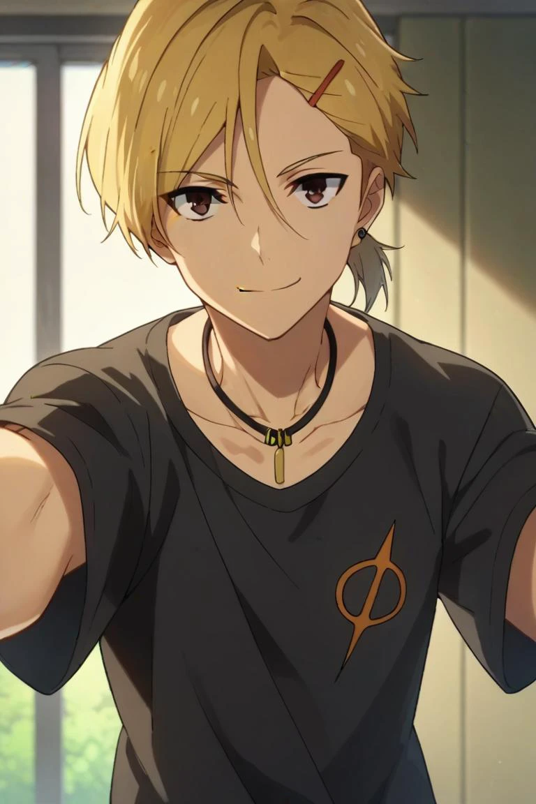 Akatsuki,blonde hair,brown eyes,Short ponytail,hair ornament,hair clip,necklace,jewelry,
