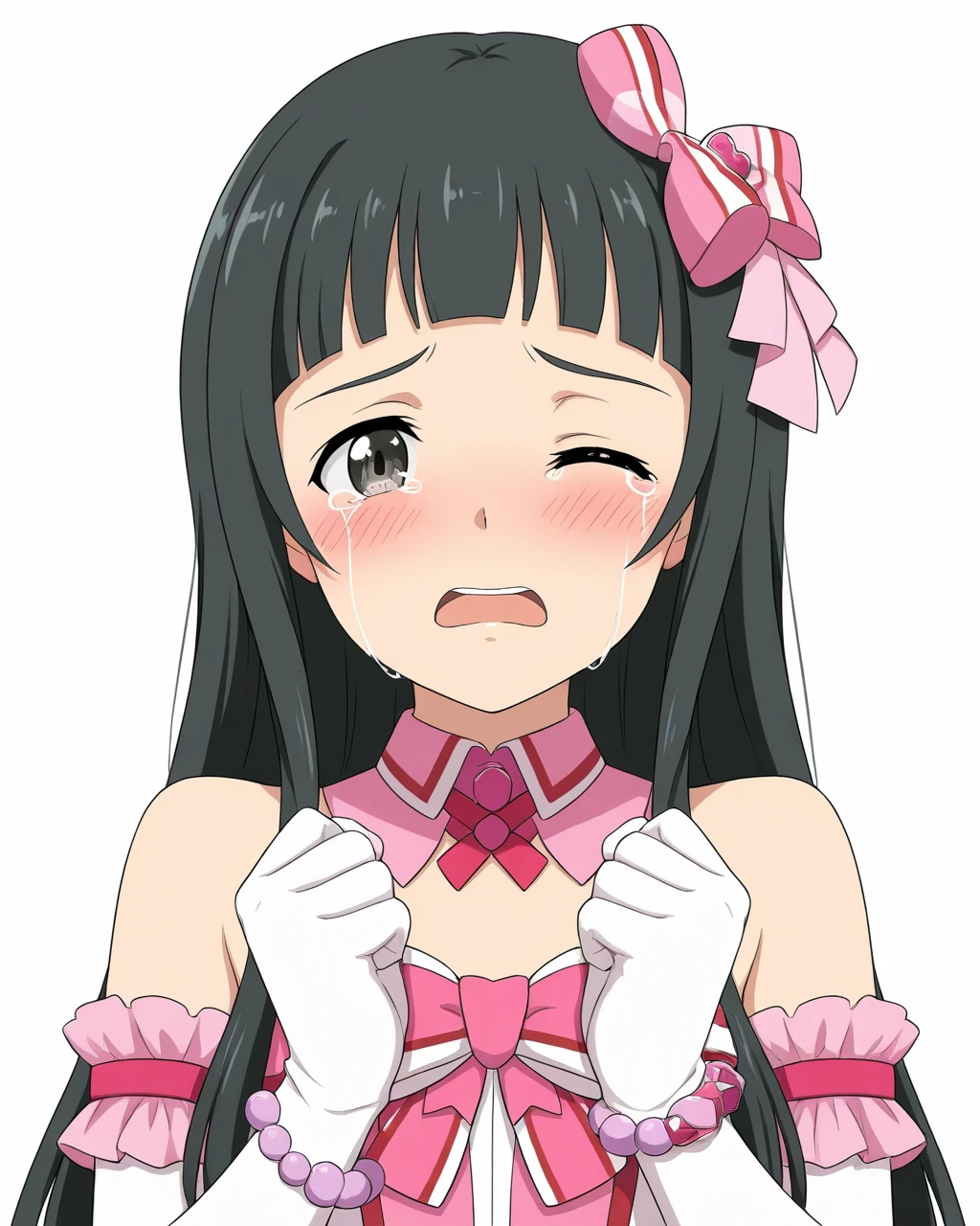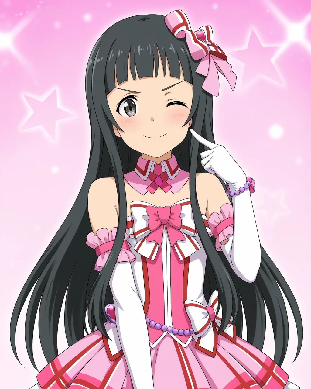 Yui_SAO, Yui_idol, black hair, long hair, bangs, blunt bangs, black eyes, hair ribbon, pink hair ribbon,