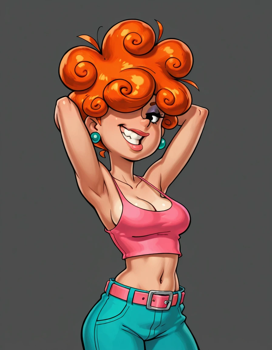 orange hair, curly hair, jewelry, freckles, hoop earrings, pink belt, blue pants, shoes, polka dot shirt, sleeveless shirt, print shirt, ring, jeans, hair covering eyes,