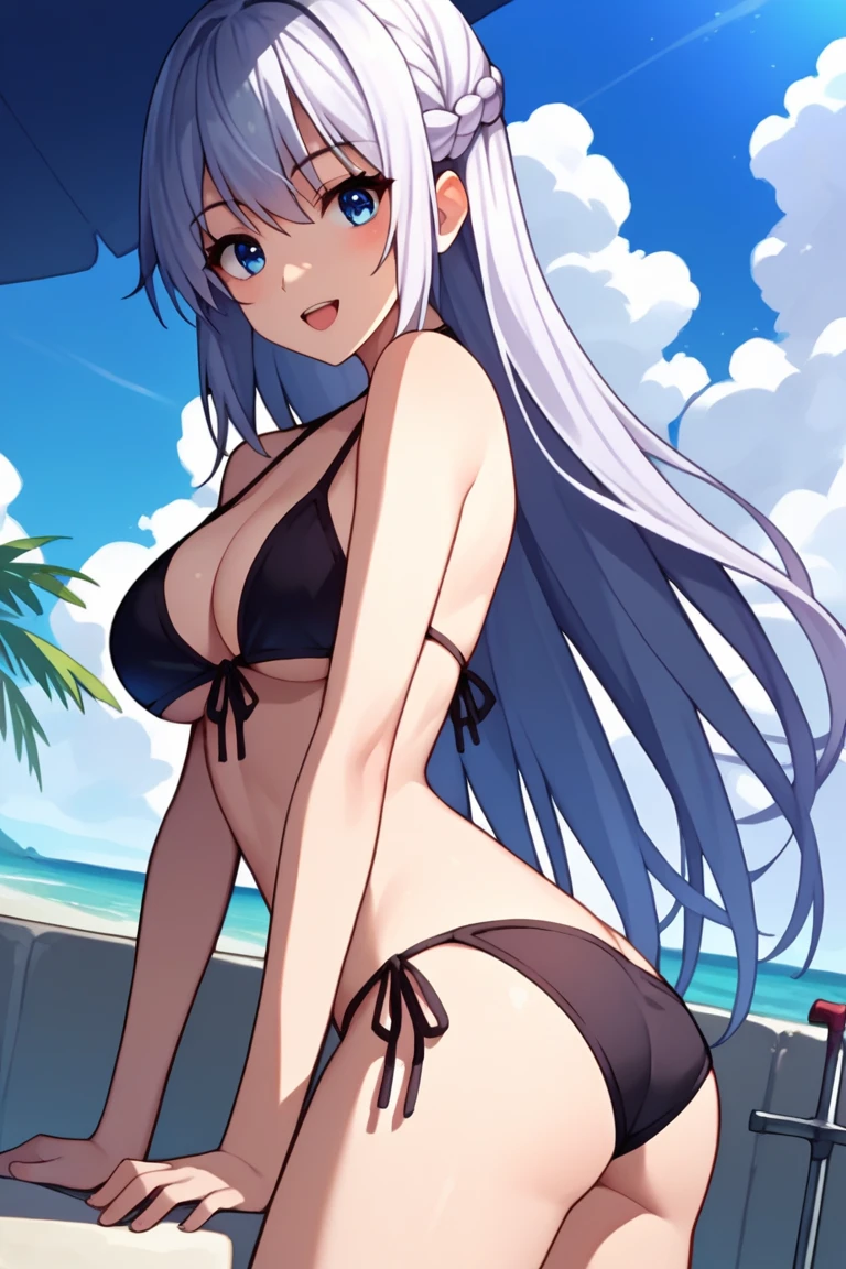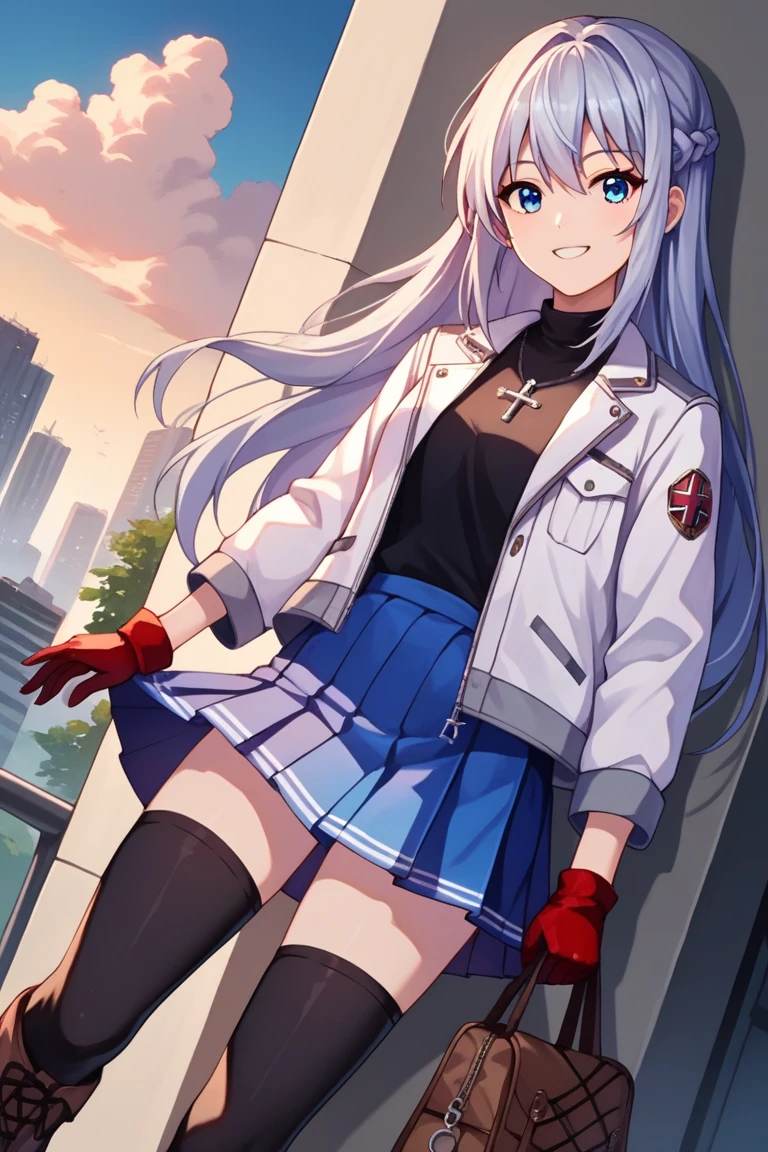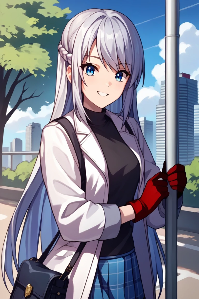 long hair, grey hair, french braid, bangs, blue eyes, Official outfit: