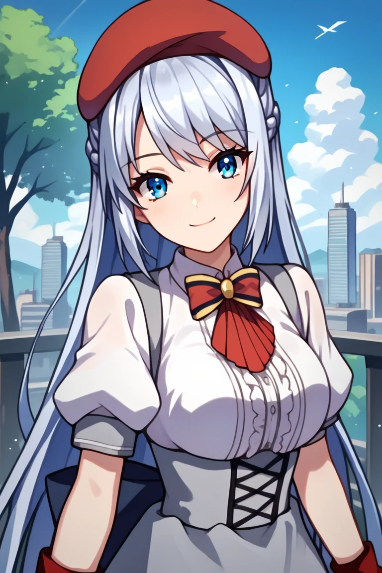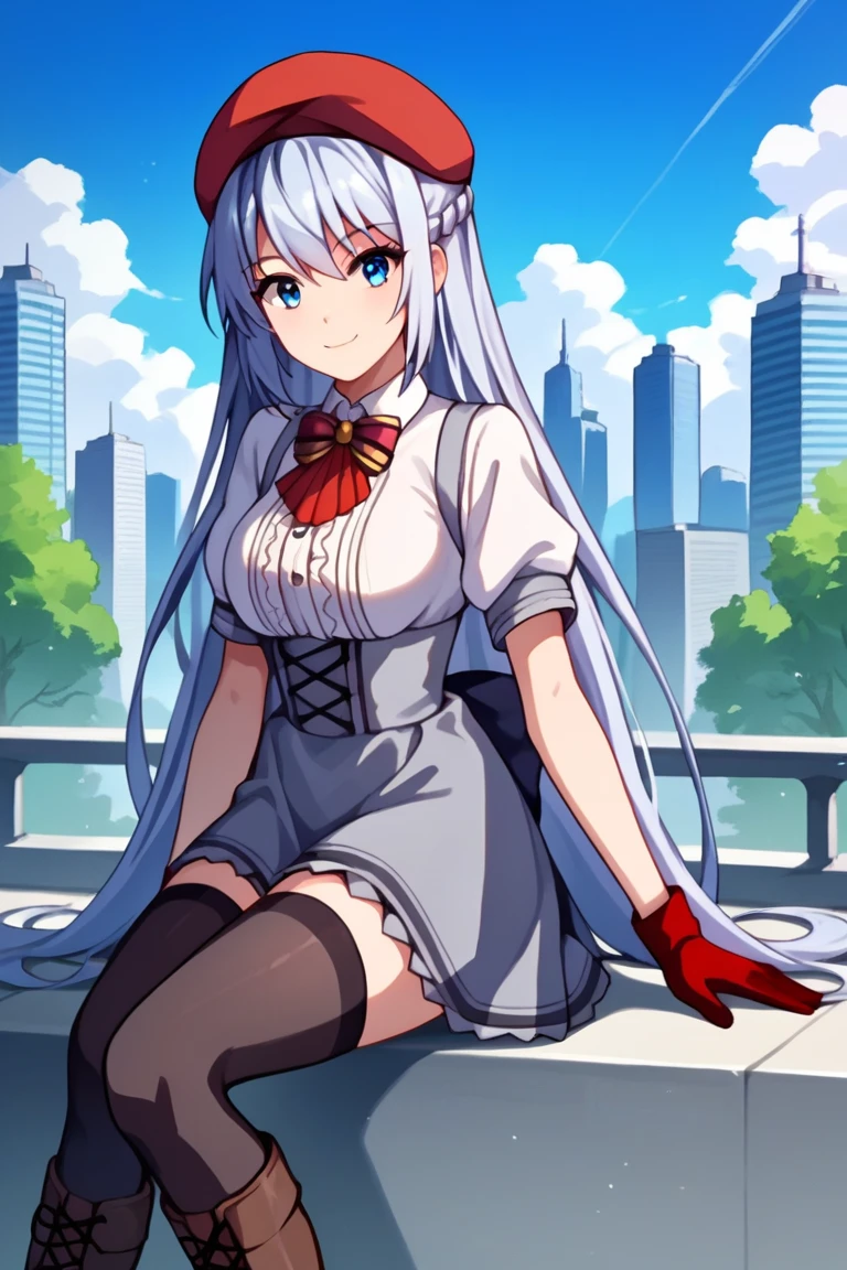 red beret, white shirt, center frills, short sleeves, puffy sleeves, red gloves, red bowtie, ascot, suspenders, grey skirt, high-waist skirt, black thighhighs, brown footwear, boots, cross-laced footwear,Tips to save you some time: