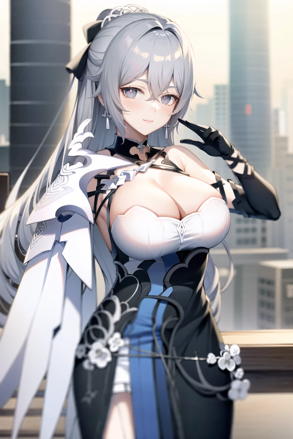 bronya zaychik, red pupils, breasts, long hair, grey hair, bangs, grey eyes, earrings, drill hair, twin drills, hair between eyes, large breasts, hair ornament, [Explain in detail what clouthes you would like to trigger......]