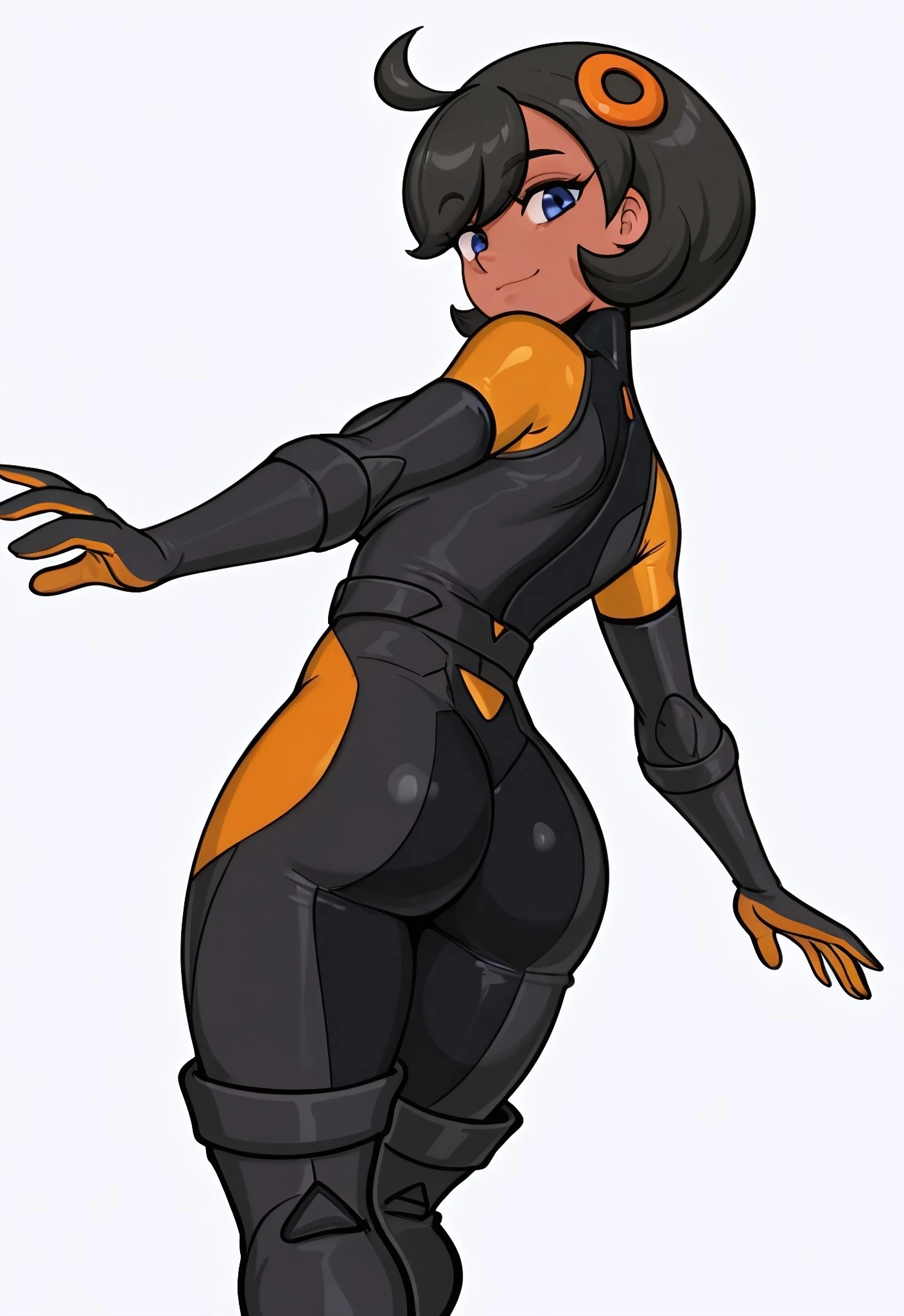 black bodysuit, orange shoulders, elbow gloves, thigh boots,