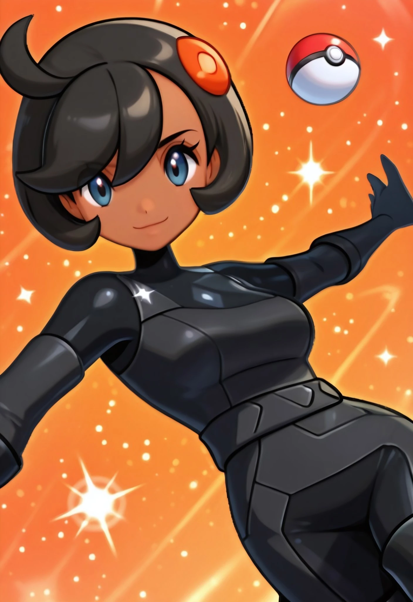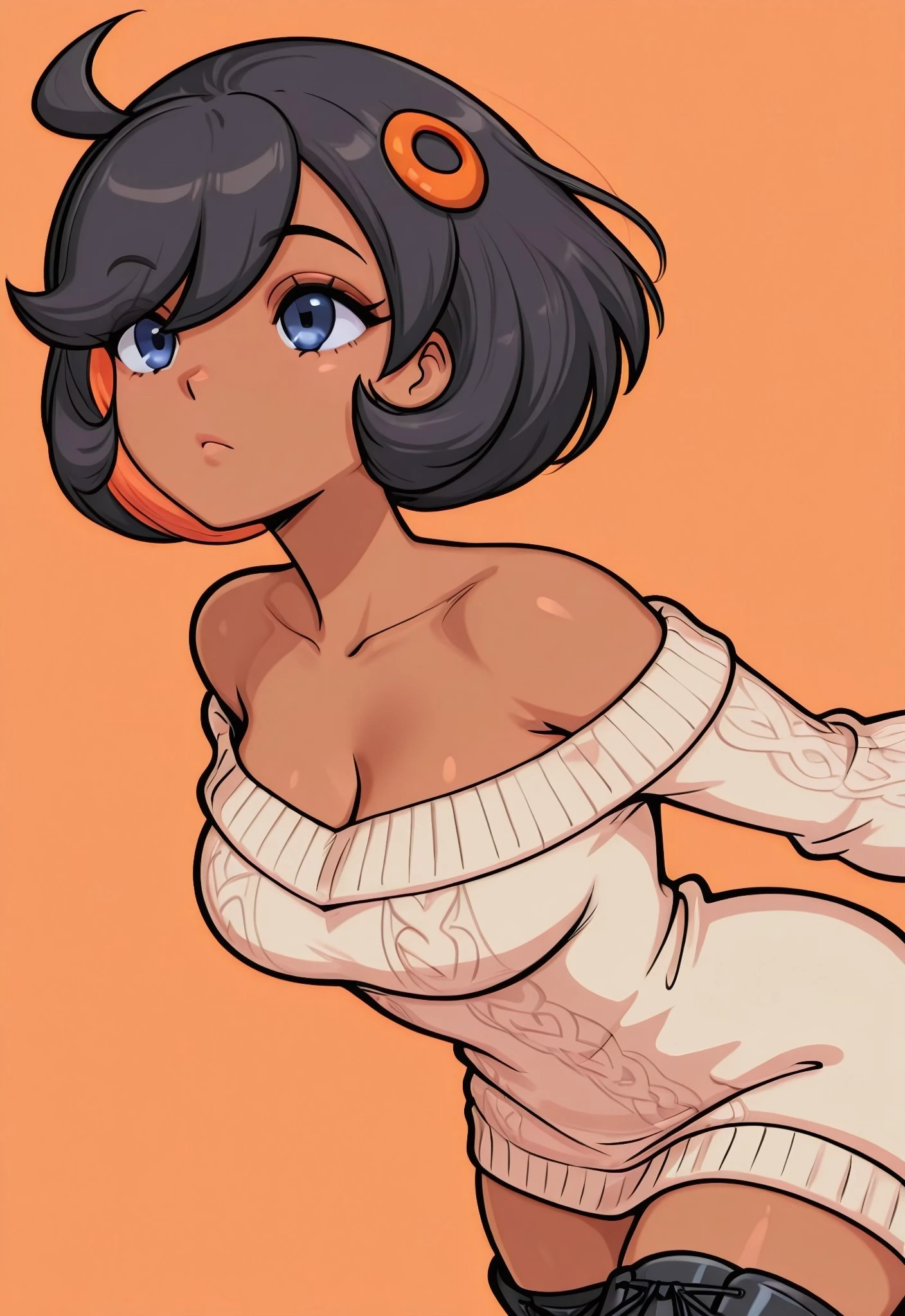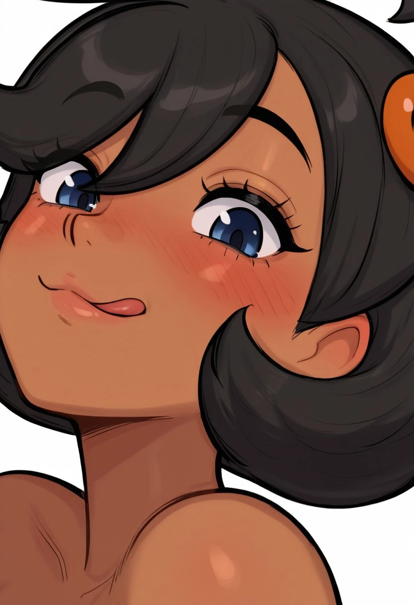 Emma_ZA, dark-skinned female, blue eyes, black hair, short hair, ahoge, orange hair ornament, medium breasts,