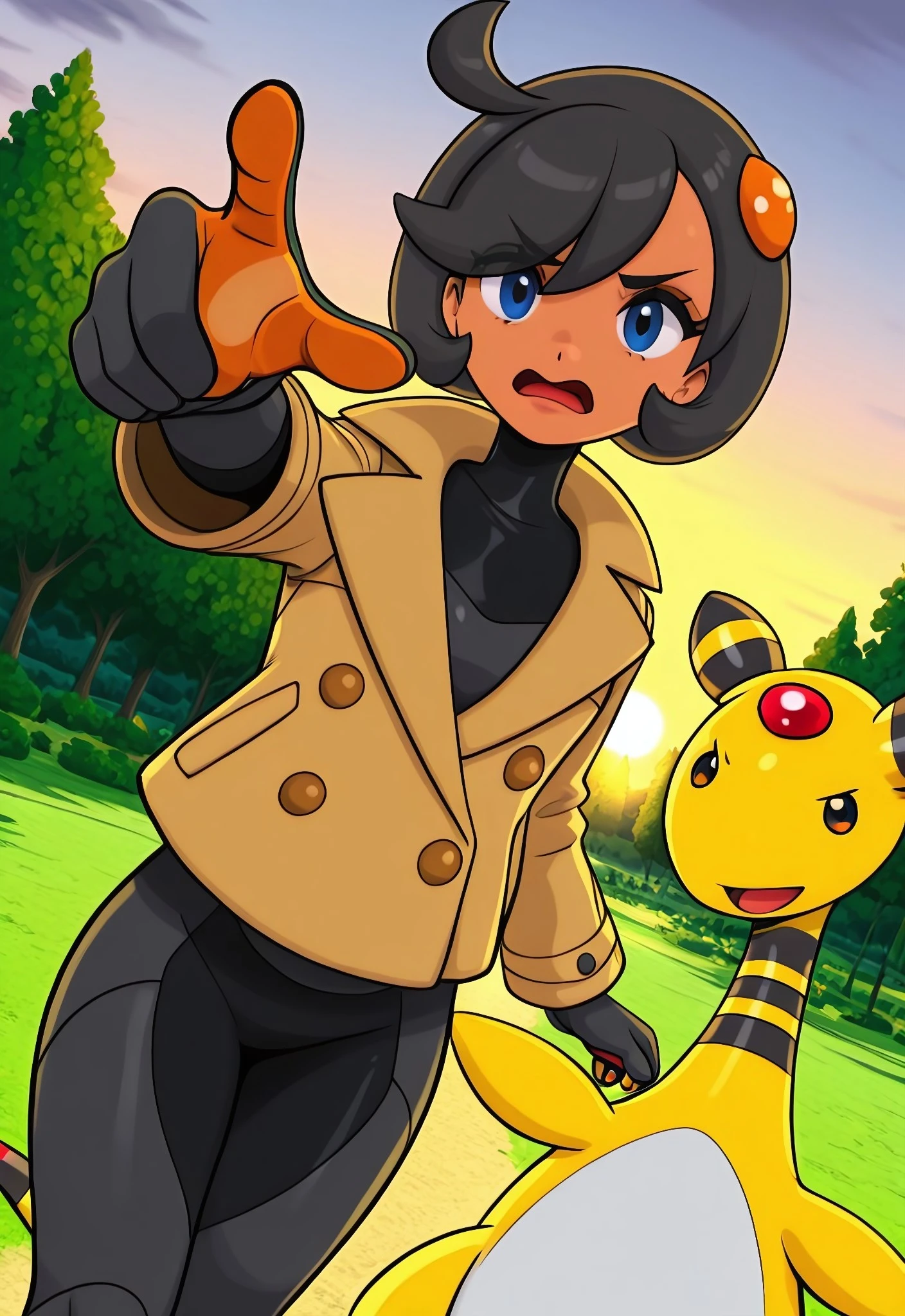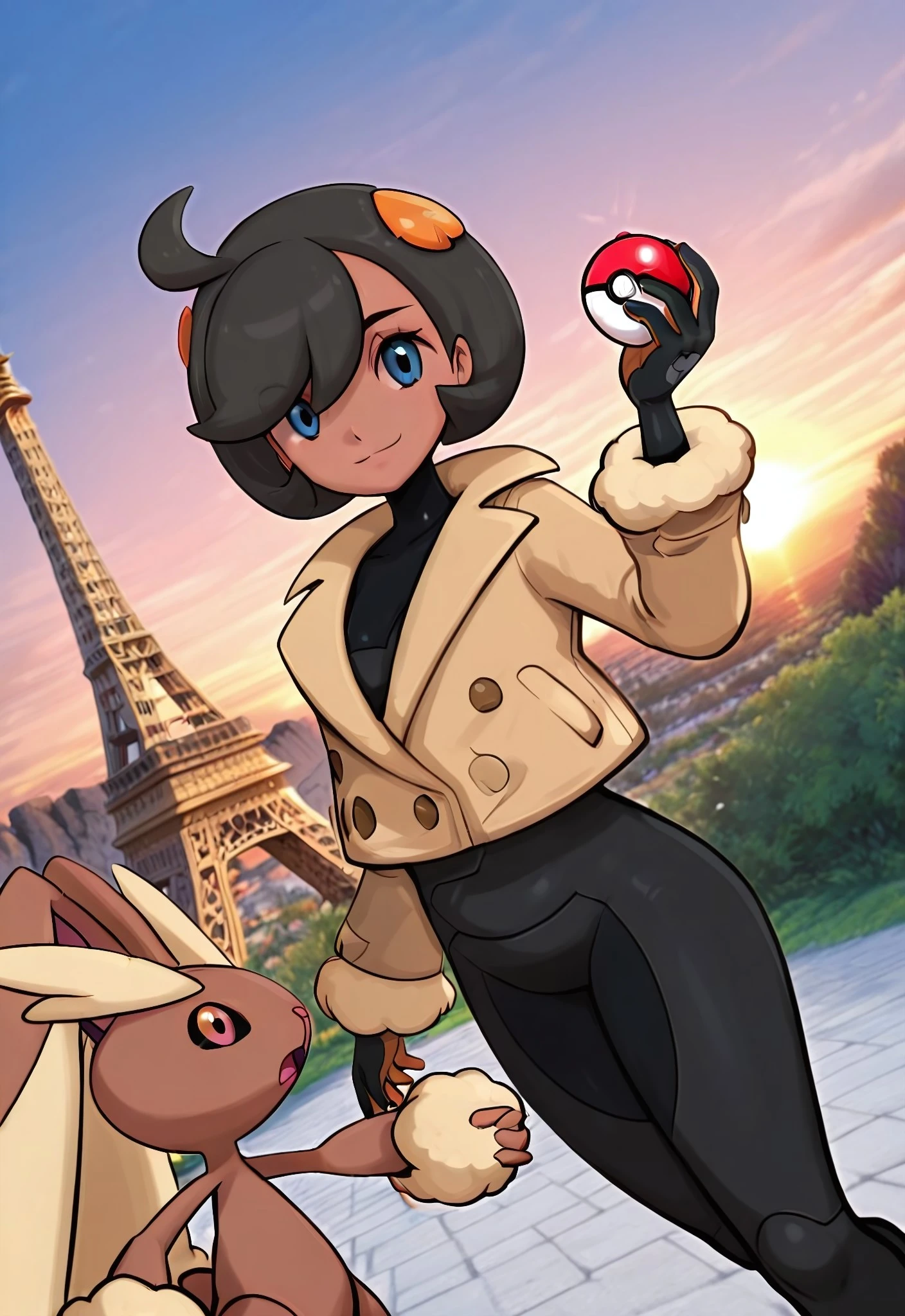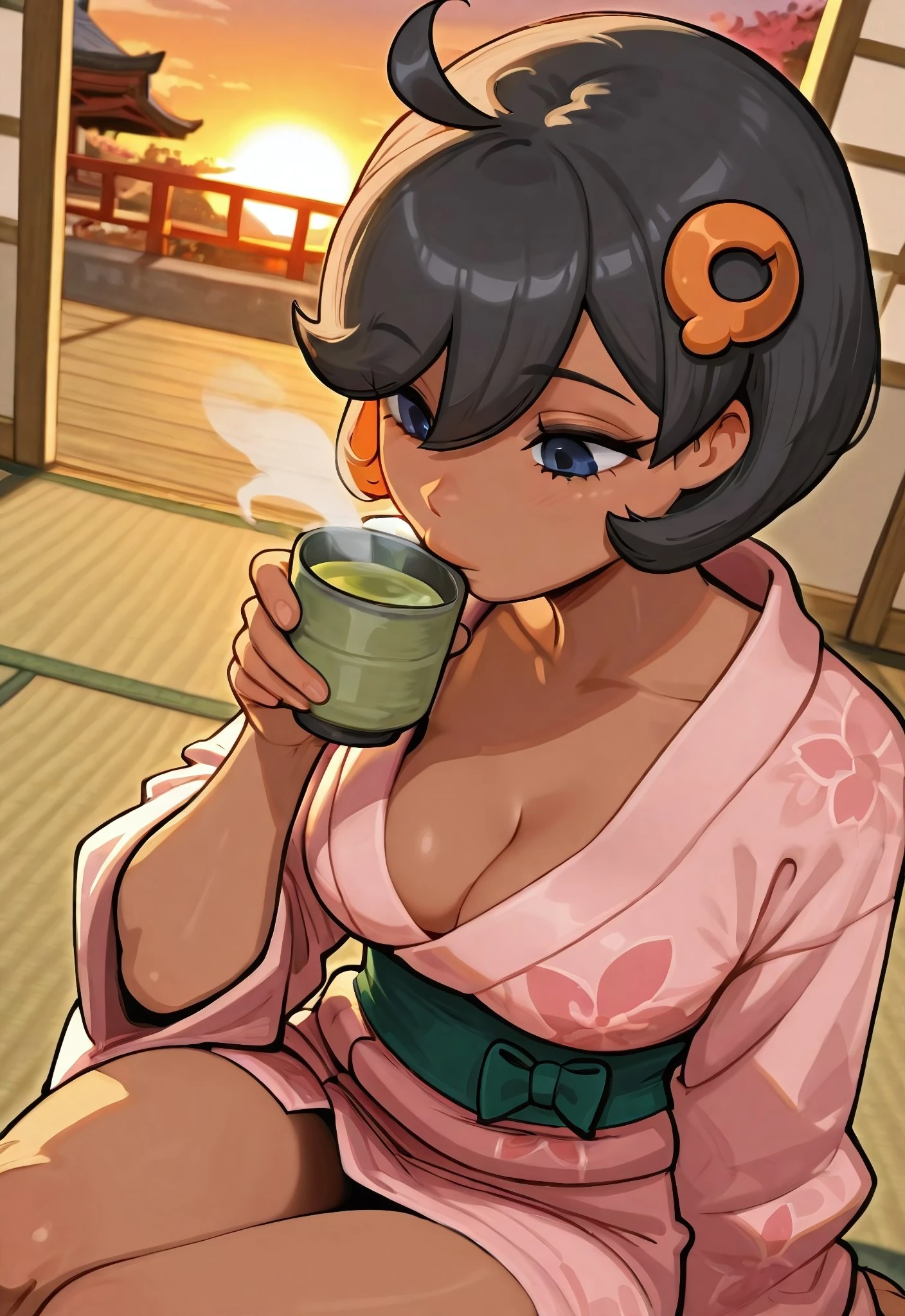 Emma_ZA, dark-skinned female, blue eyes, black hair, short hair, ahoge, orange hair ornament, medium breasts,