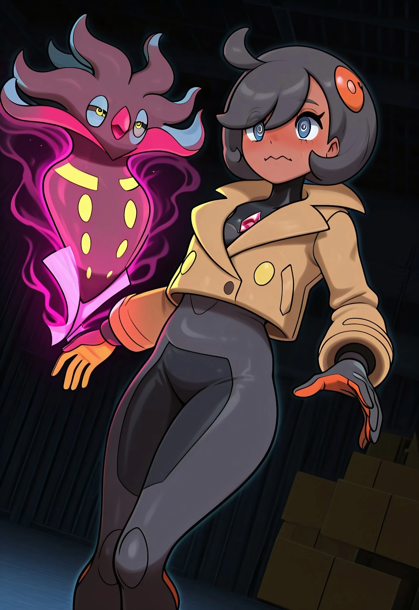 brown jacket, black bodysuit, gloves,