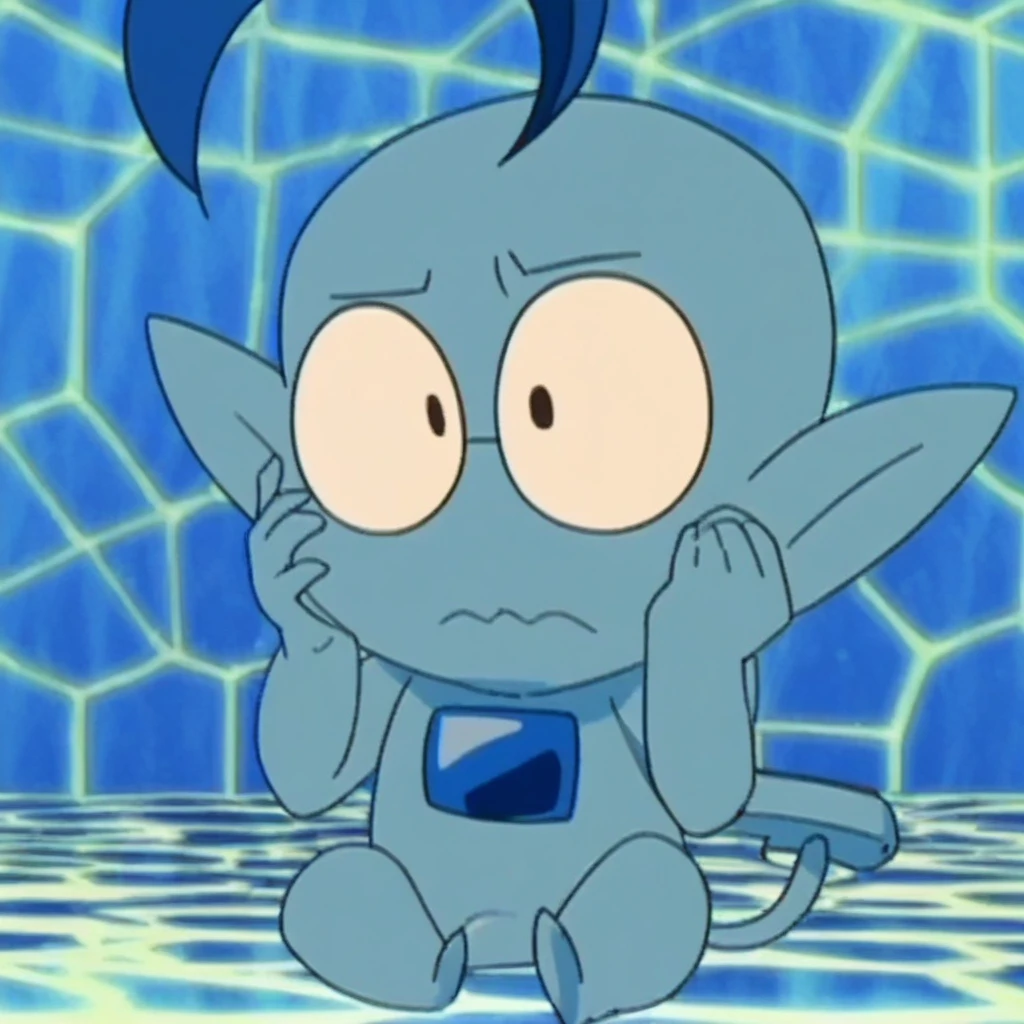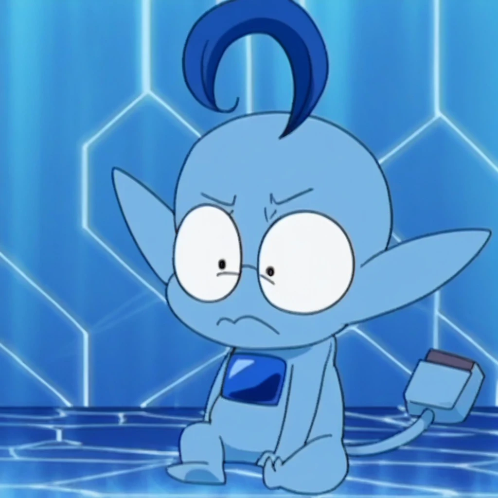 no humans, solo, pokemon(creature), blue theme, wide-eyed, black eyes, constricted pupils, glasses, ahoge, 1boy, blue skin, male focus, tail, pointy ears, full body