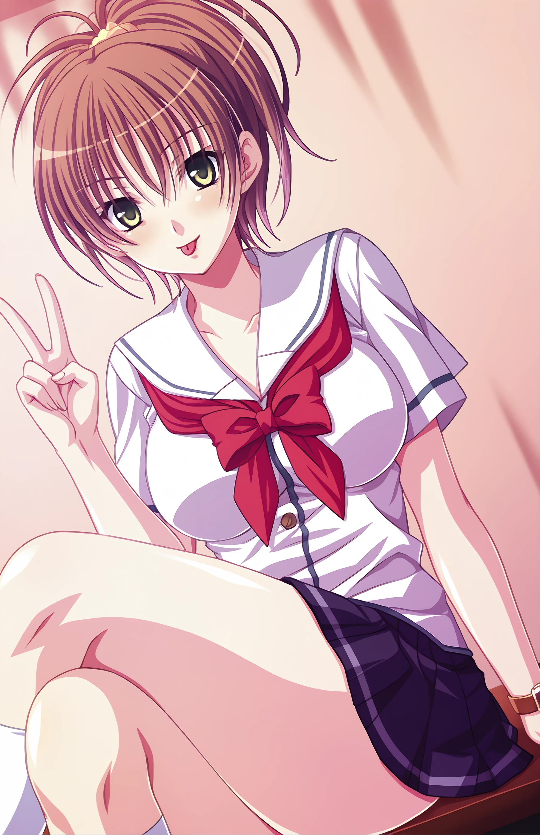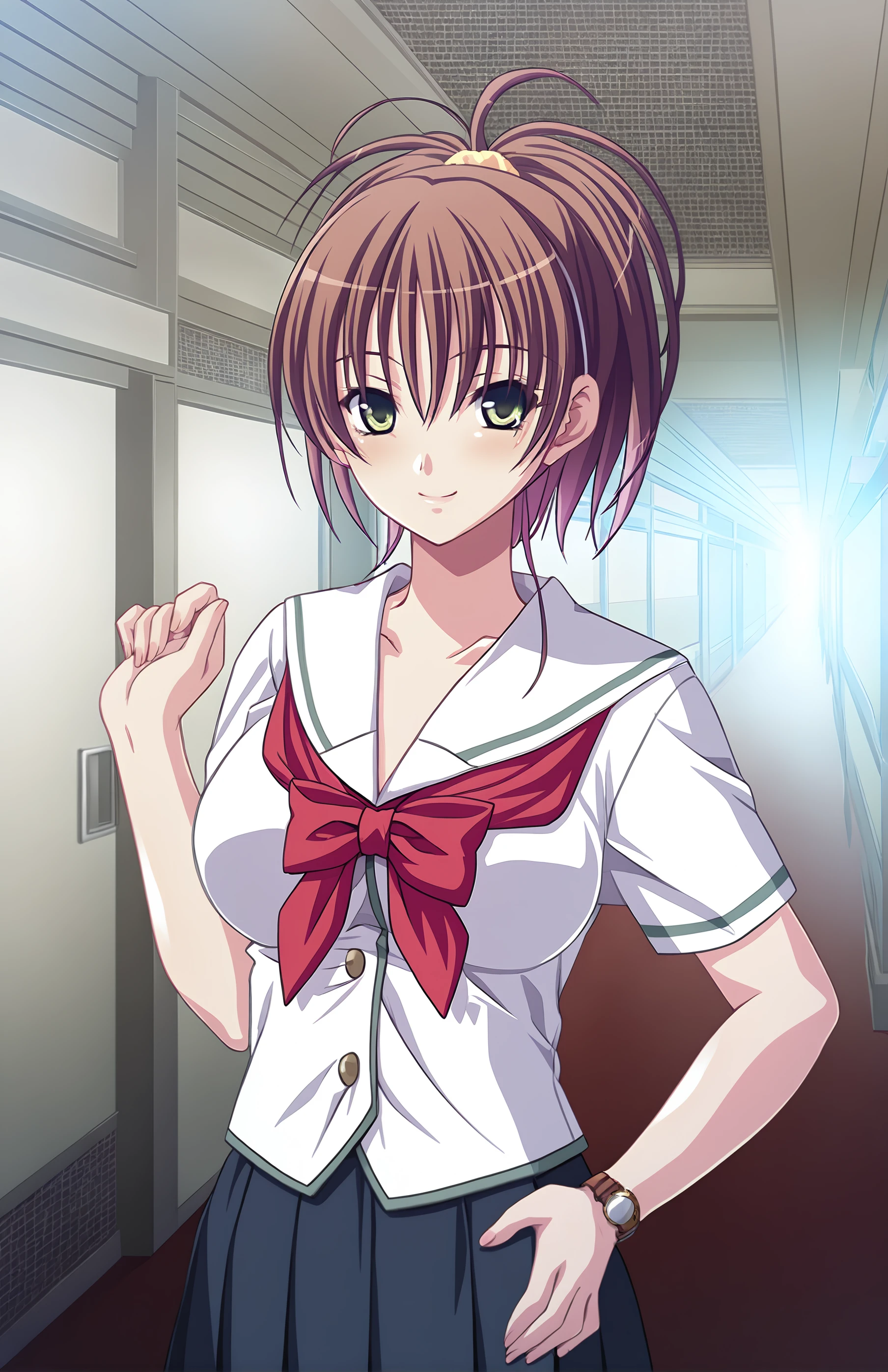 NatsunoMisaki, , skirt, brown hair, school uniform, green eyes, ponytail, pleated skirt, serafuku, wristwatch