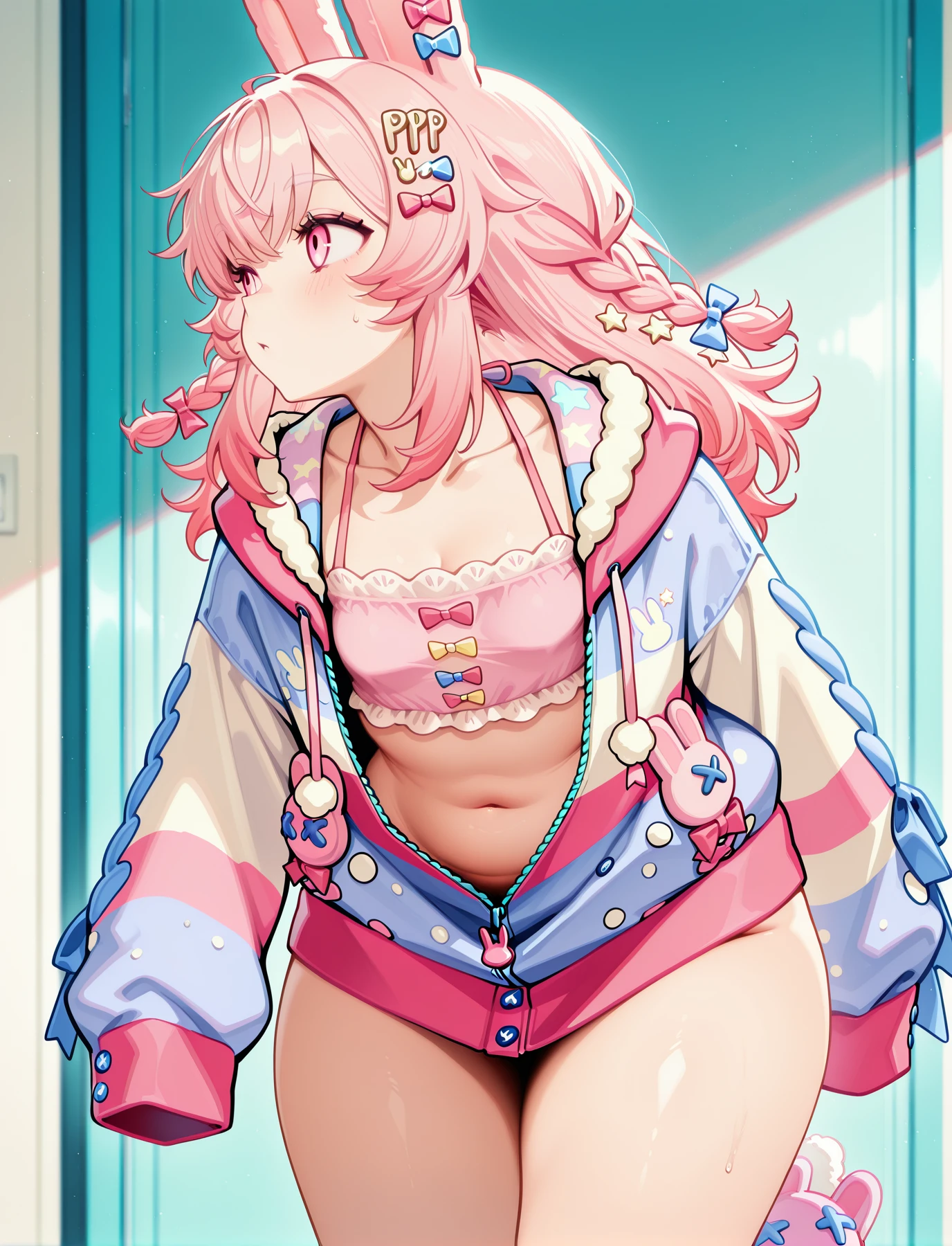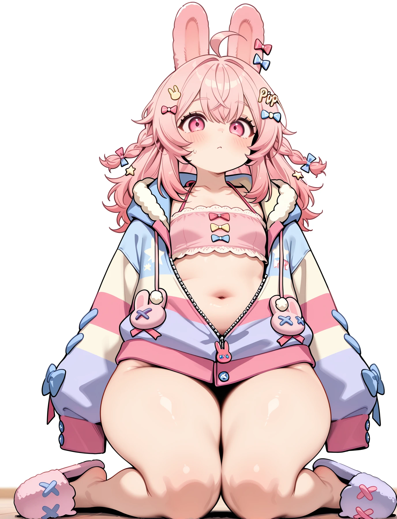 PipPip, pink eyes, pink hair, long hair, side locks, braids, rabbit ears, hair ornaments,