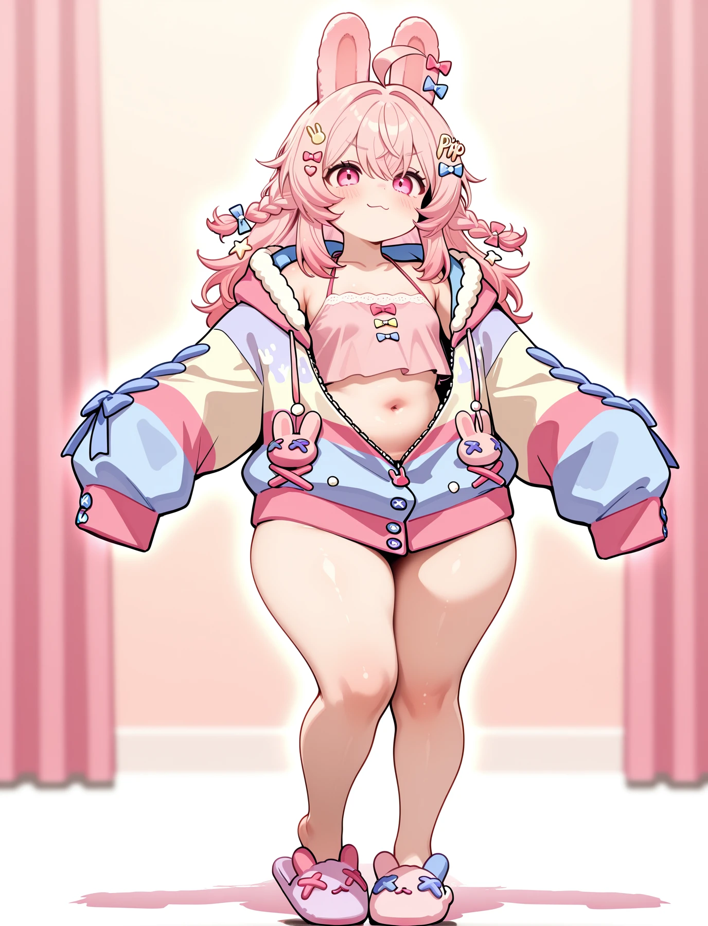 collarbone, fur trim, hood down, partially unzipped jacket, pastel jacket, multicolor jacket, sleeves past fingers, halterneck pink frilled croptop, navel, midriff, bare legs, mismatched slippers,