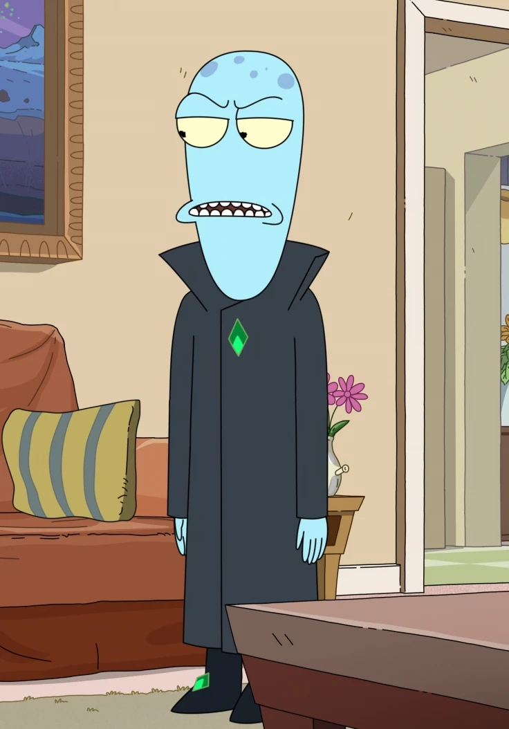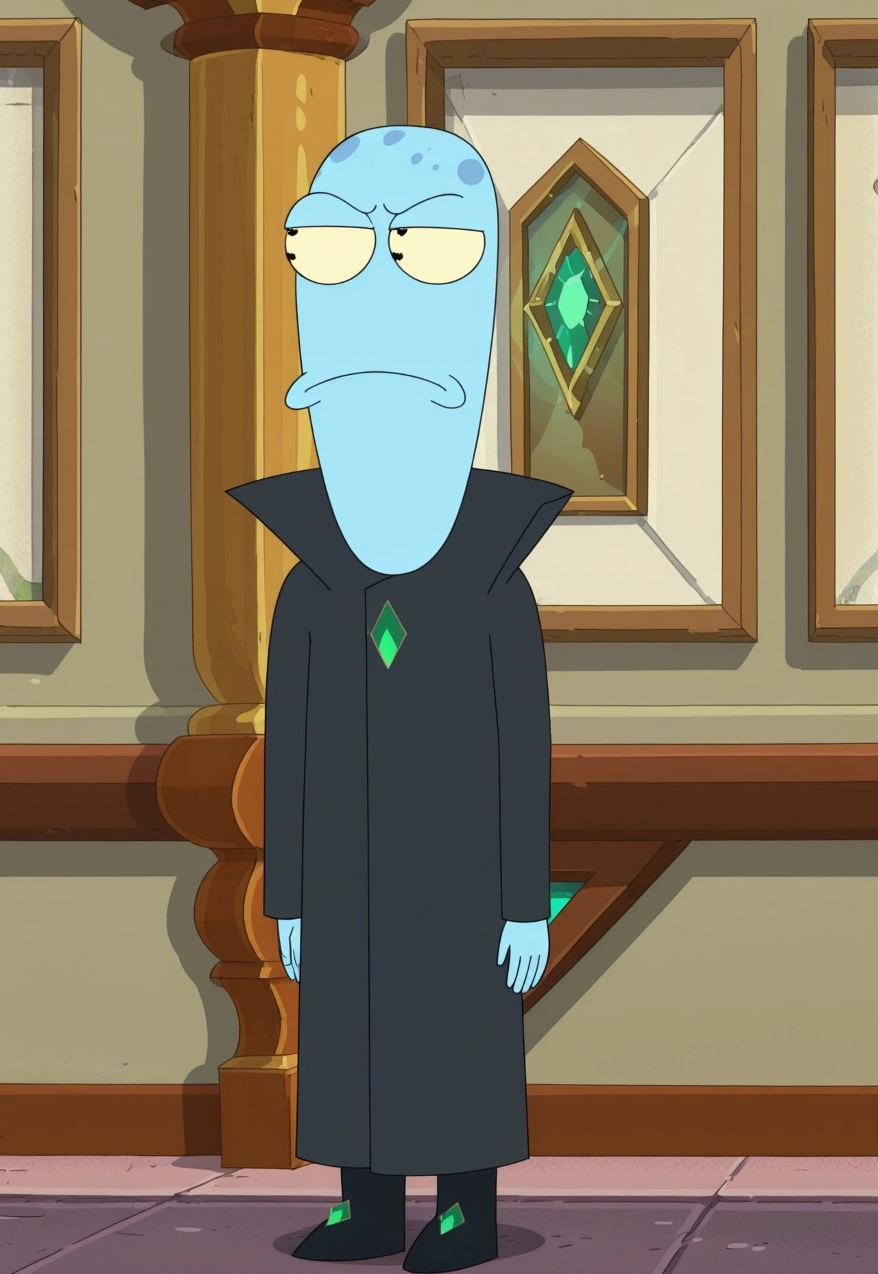 Korvo, 1man, blue alien, blue skin, black coat with green gem, black boots with green gem