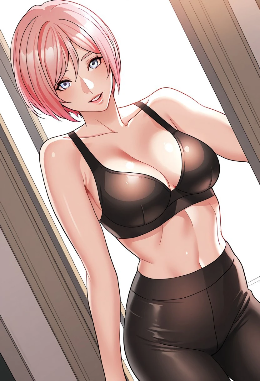 Jung Da-Bin: jung_da-bin, piercing light blue eyes, beautiful pink hair, beautiful short hair, bangs, big and shaggy breasts,