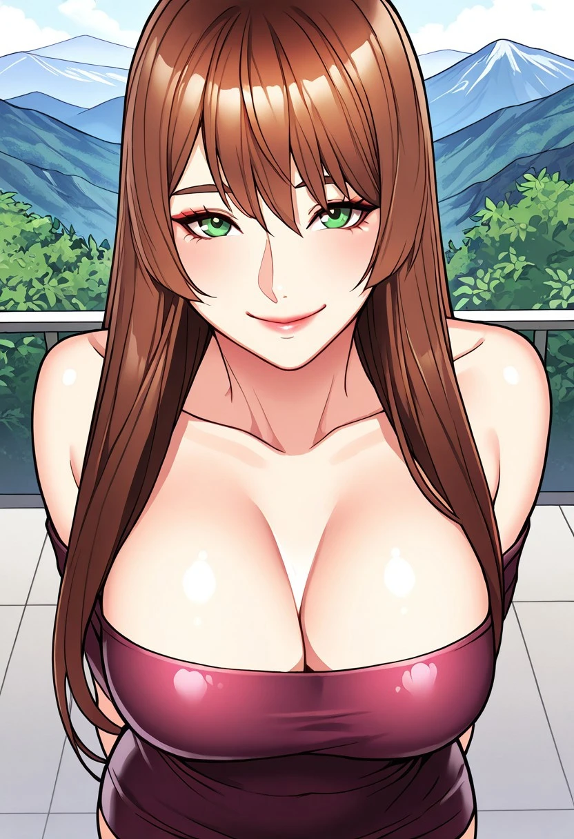 Cho Yun-Kyung: cho_yun-kyung, beautiful green eyes, beautiful brown hair, beautiful long hair, bangs, huge and shaggy breasts,