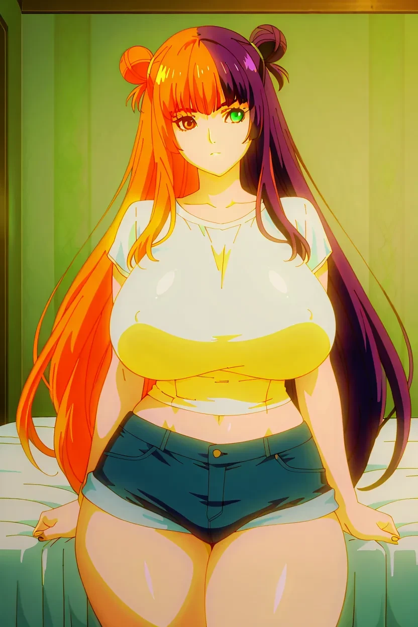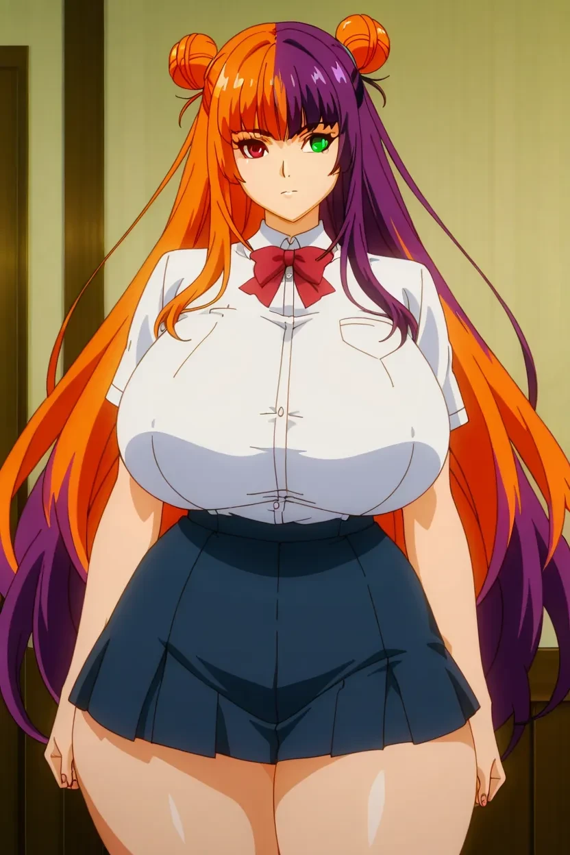 1woman, Apple, heterochromia, green eyes, red_eyes, multi colored hair, two toned hair color, orange hair, purple hair, double bun, side locks, very long hair, hot body, very endowed, huge_breasts, voluptuous, curvy, wide hips, thick thighs, tall, anime drawn, anime coloring, HD, 4k, superb quality, no-flaws, 2020 anime style