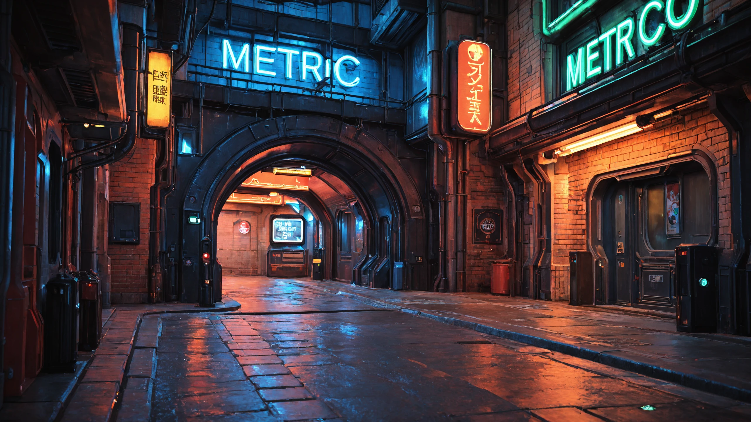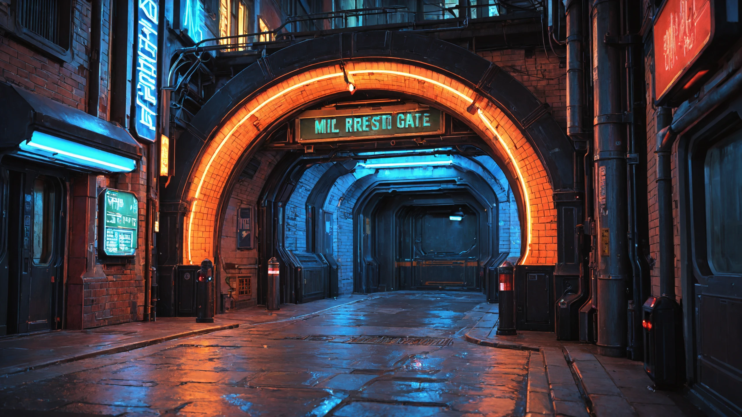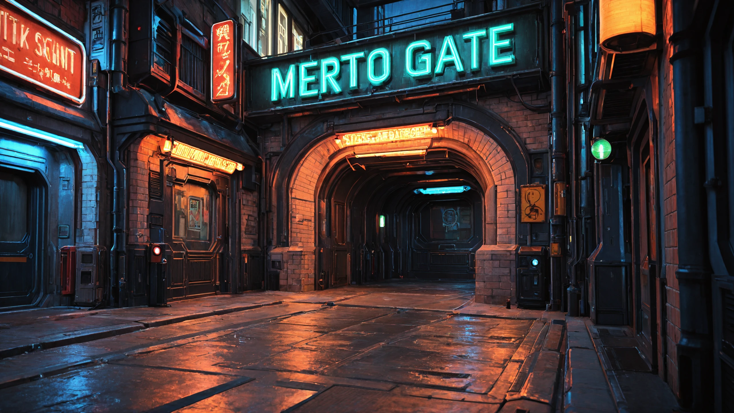 cityscape, street, giant ring gate, metro entrance, urban architecture, brick wall, industrial pipe, cable, air conditioner, street light, traffic light, signboard, eon glow, neon lights,
