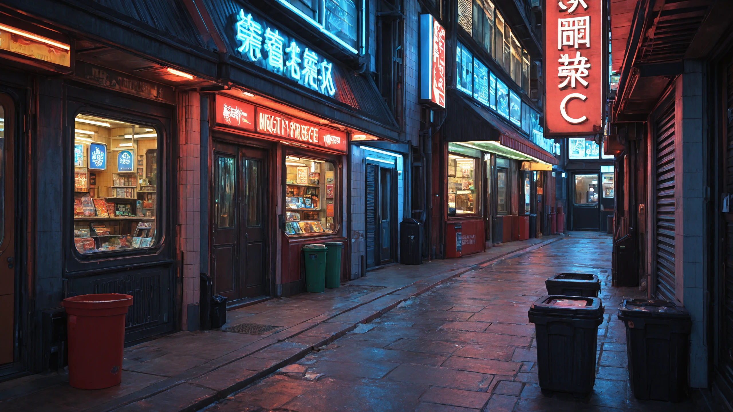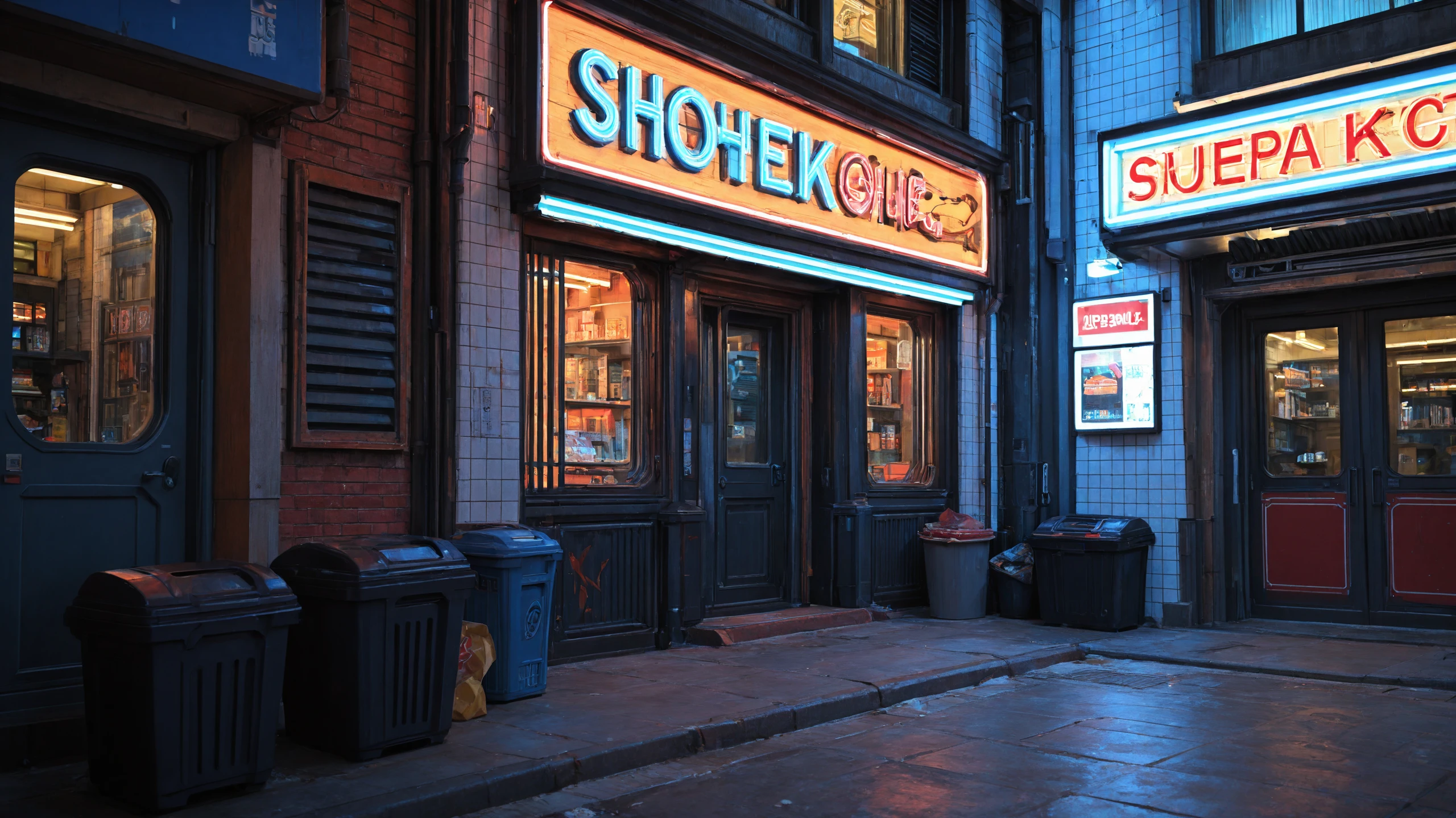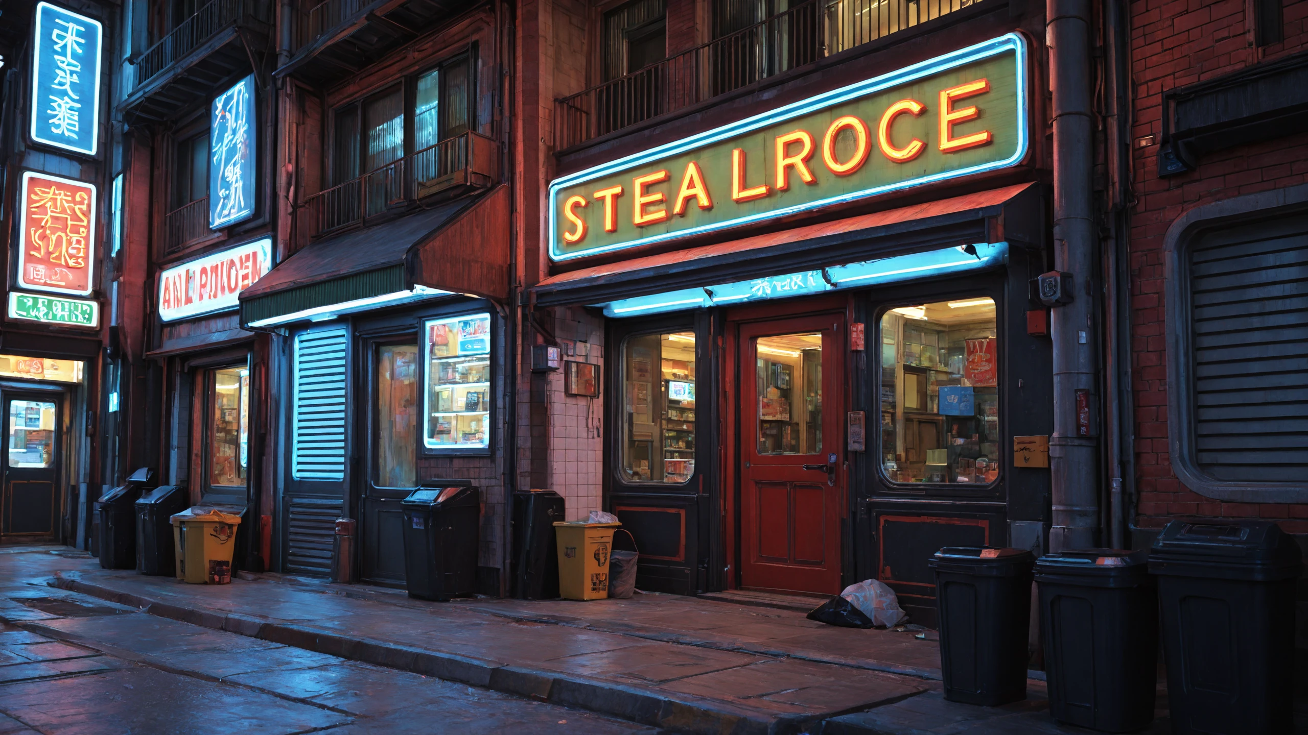 city street, dense buildings, storefronts,neon sign, shop sign, illuminated billboard, neon shopfront,convenience store, shop entrance, metal shutter door, storefront awning, stairs, small staircase, doorway entrance, garbage pile, trash can, street clutter,