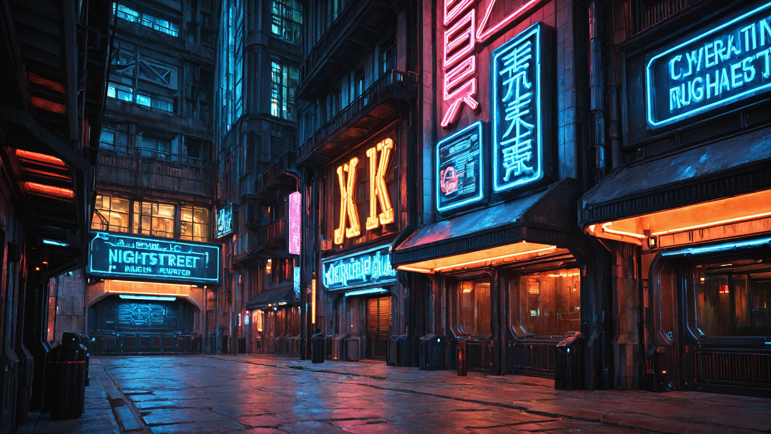 NightStreetC, Night Street, Cyberpunk, science fiction, no humans, night, outdoors,