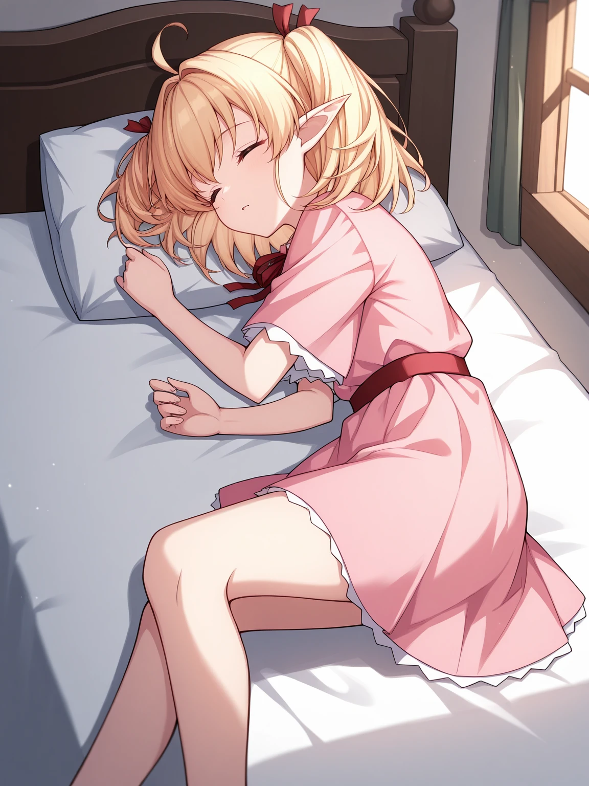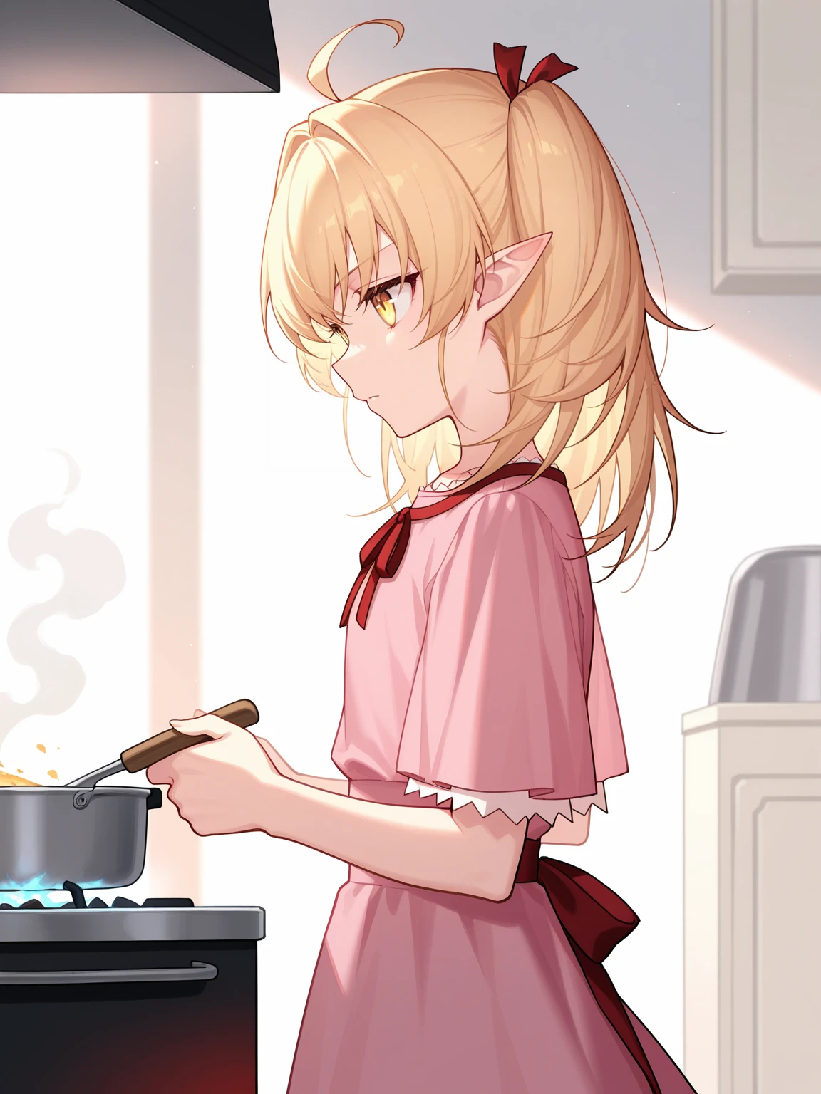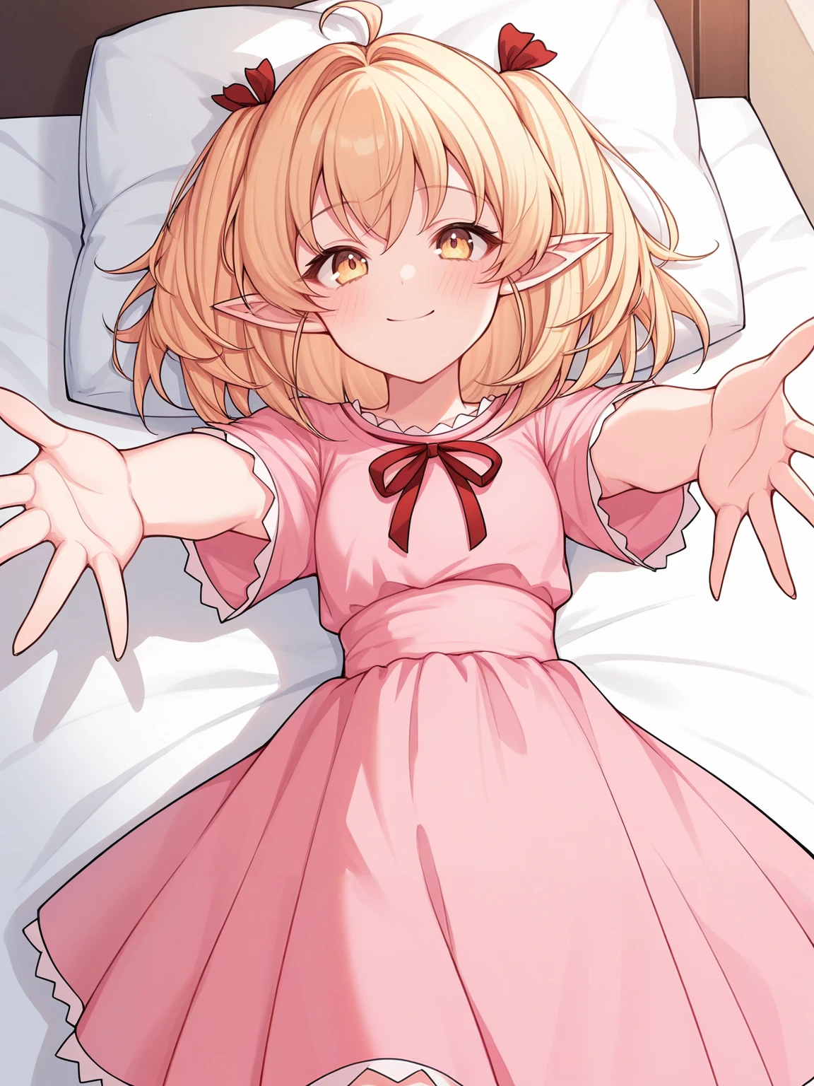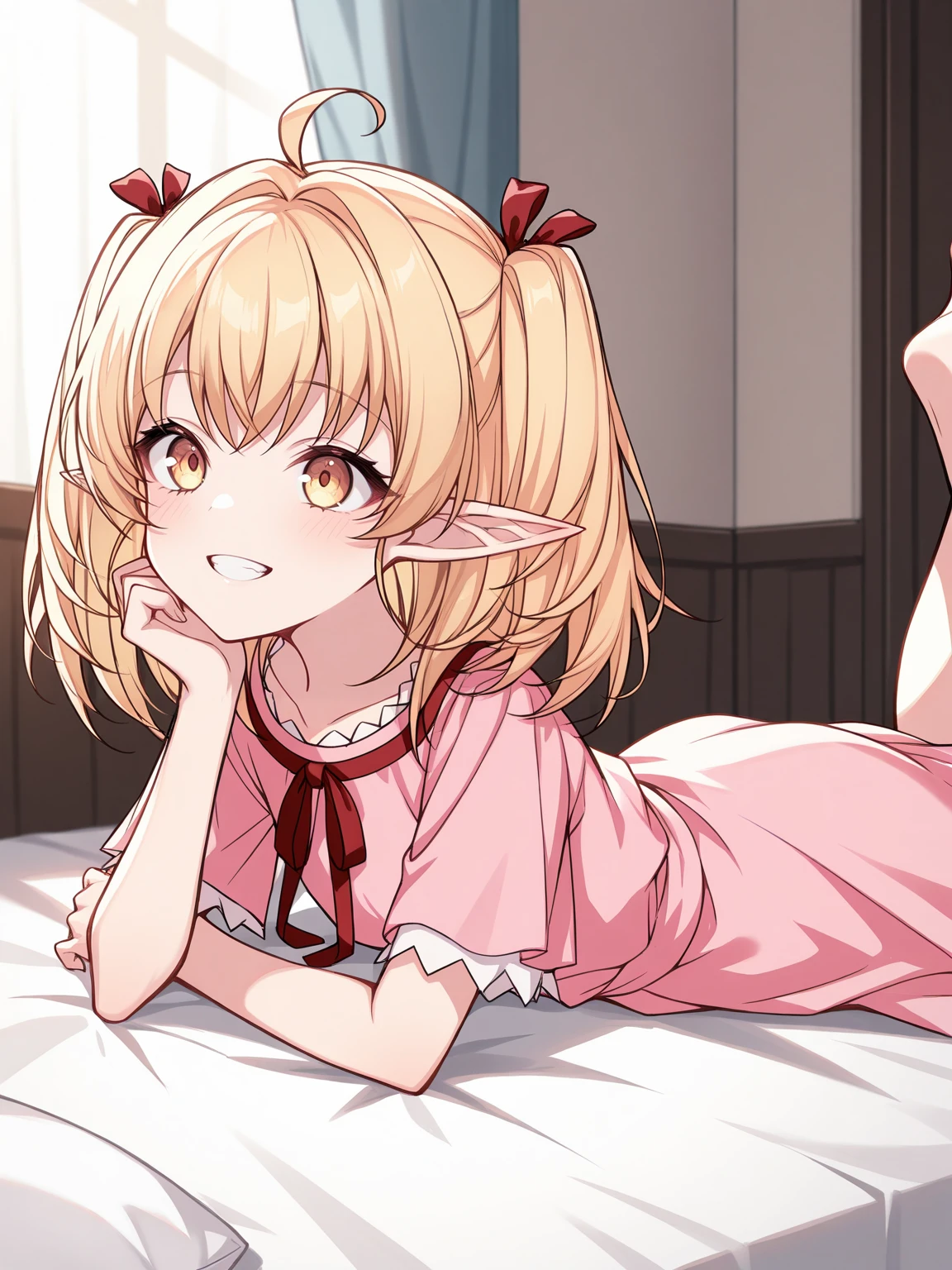 lilyhl, blonde hair, yellow eyes, two side up, hair ribbons, pointy ears, ahoge