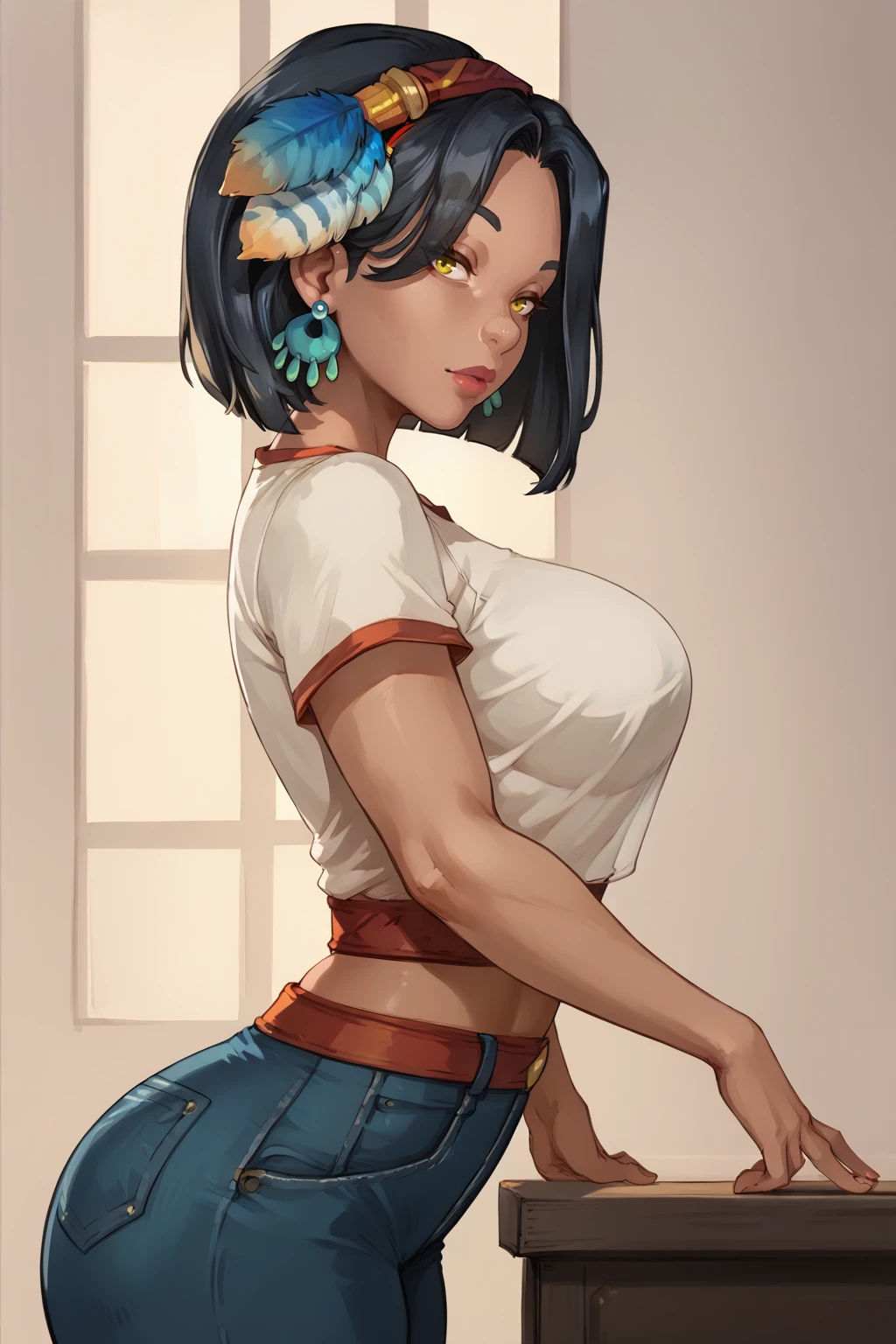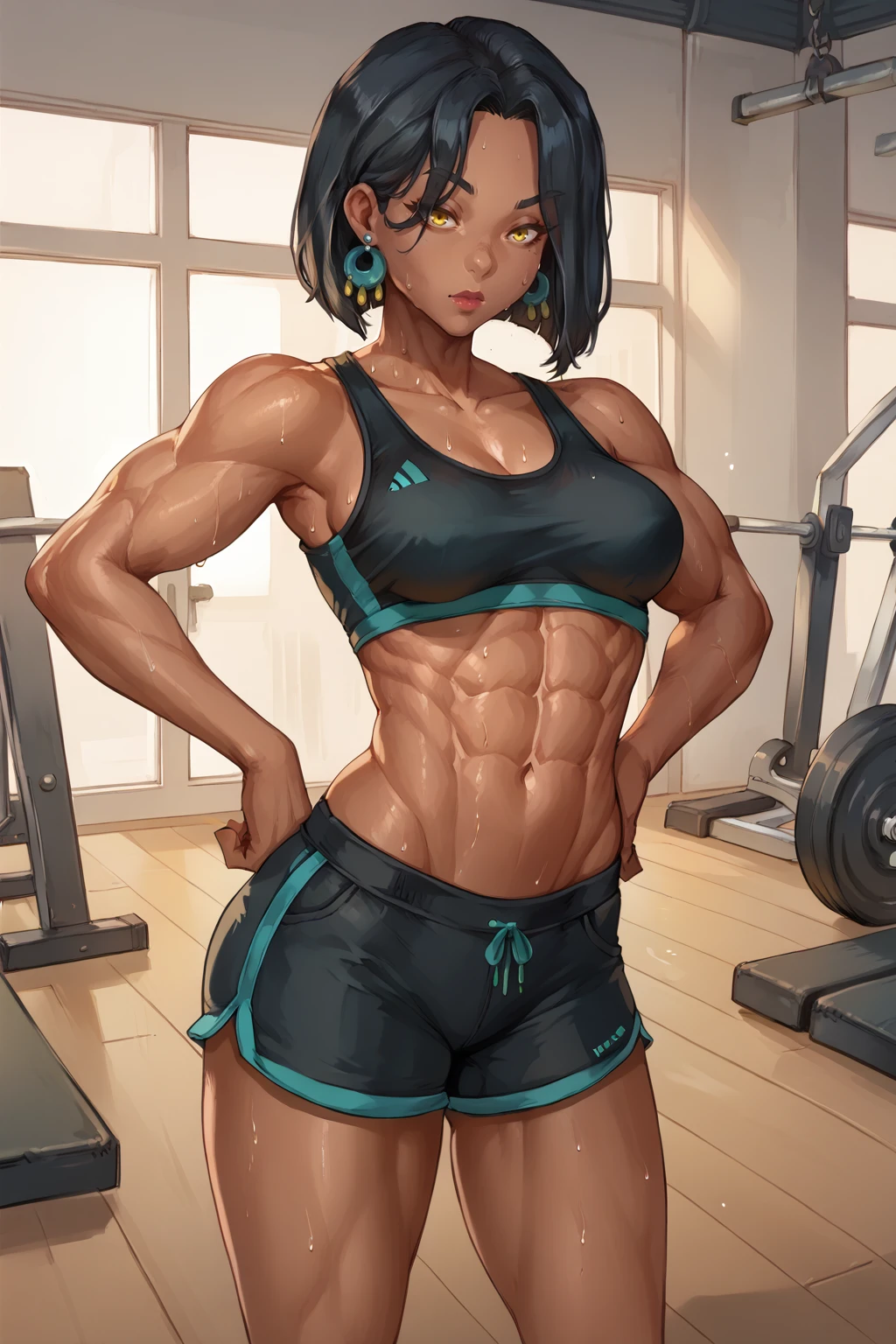 Main prompts: NSSoniaPortia, dark-skinned female, black hair, medium hair, yellow eyes, teal dangle earrings,