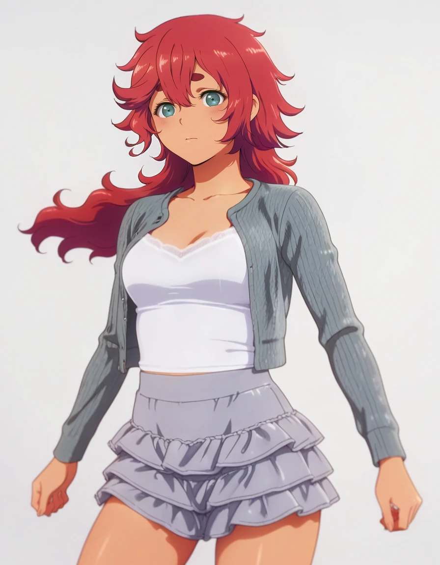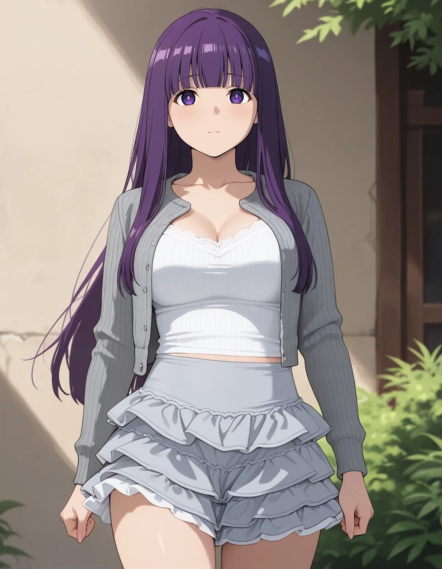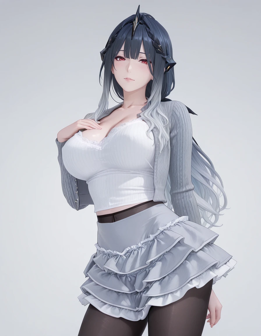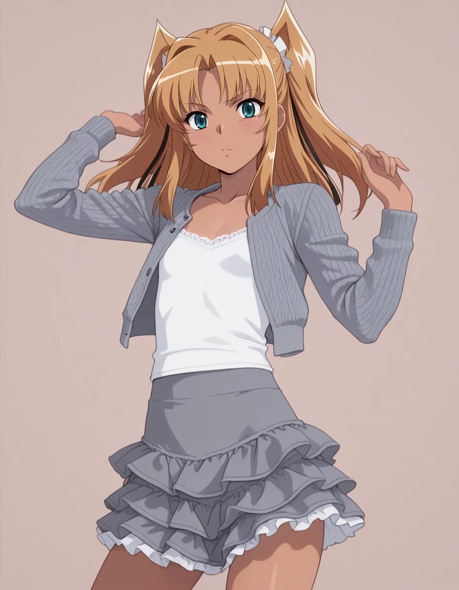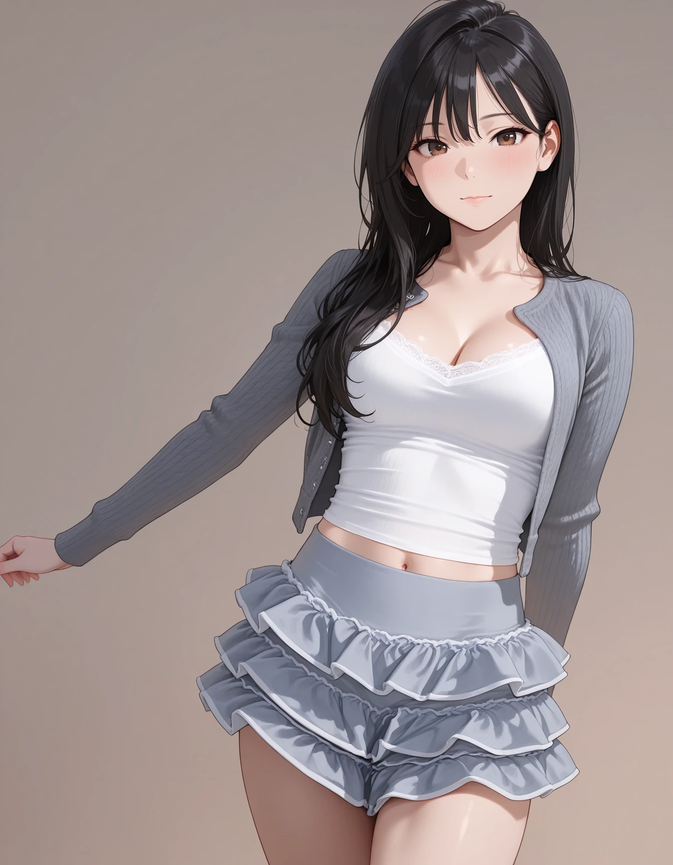 mai_layered_skirt,white_camisole,sweater_jacket,grey_jacket,open_jacket,frilled_skirt,grey_skirt