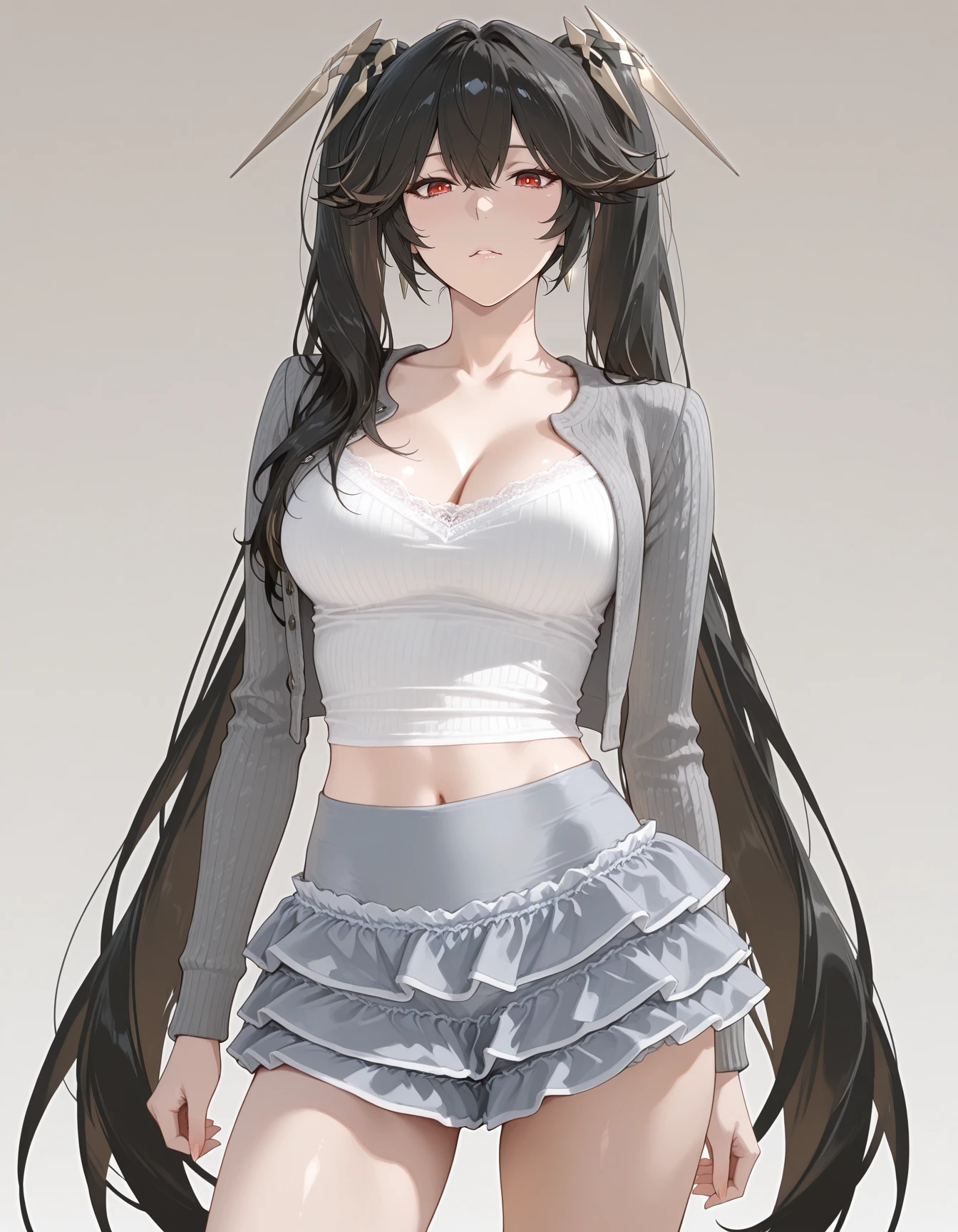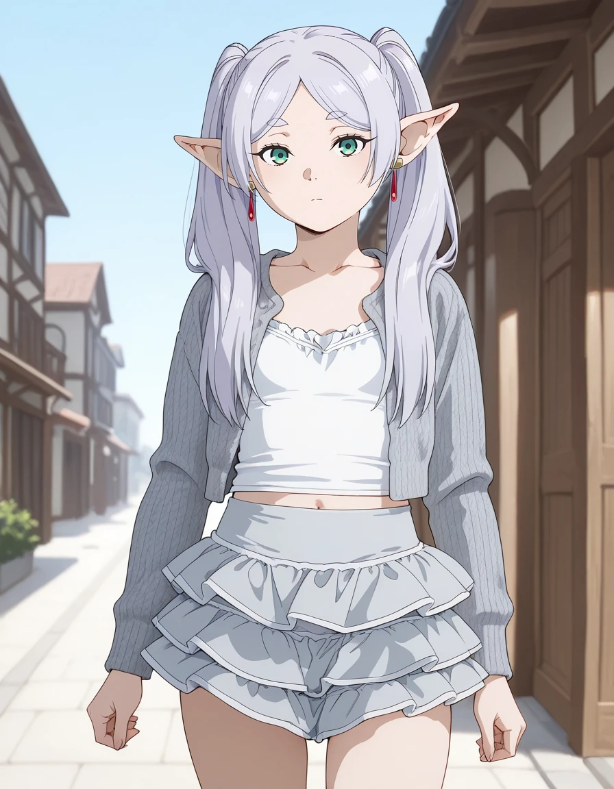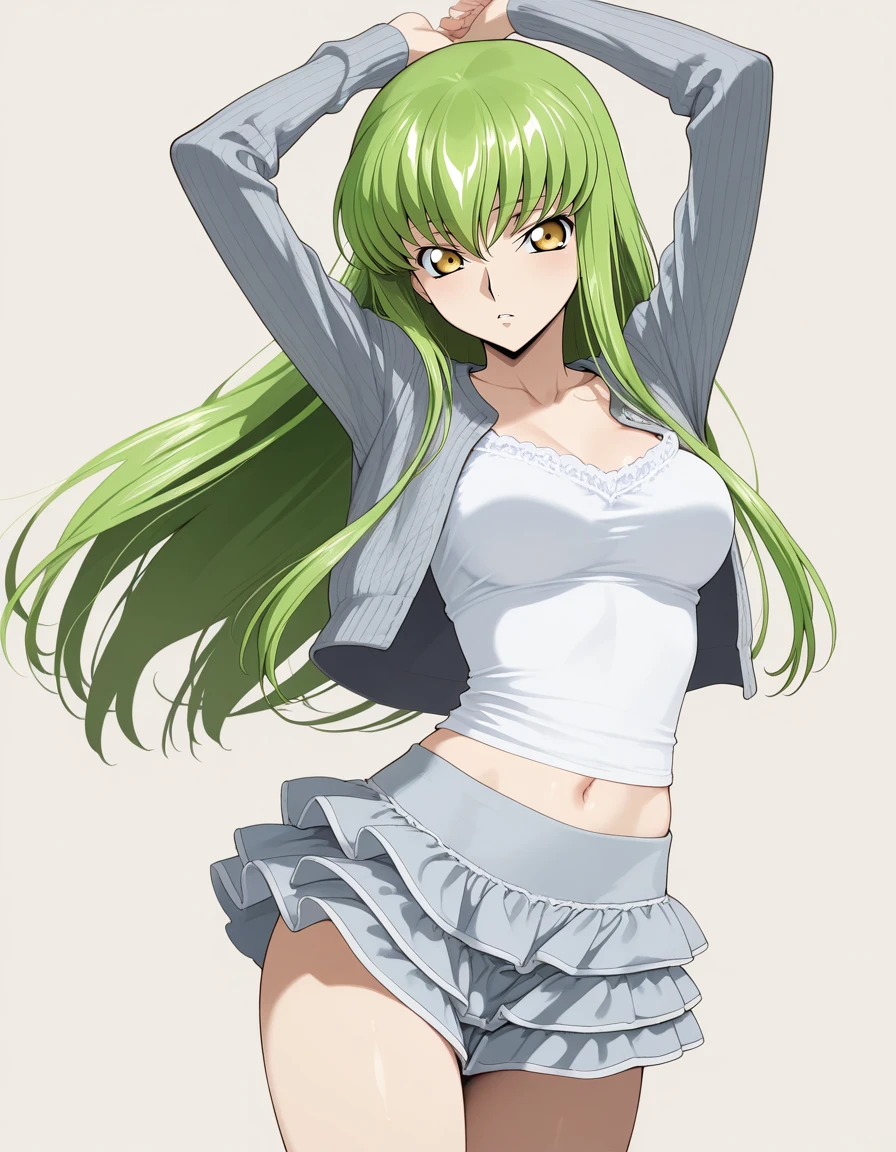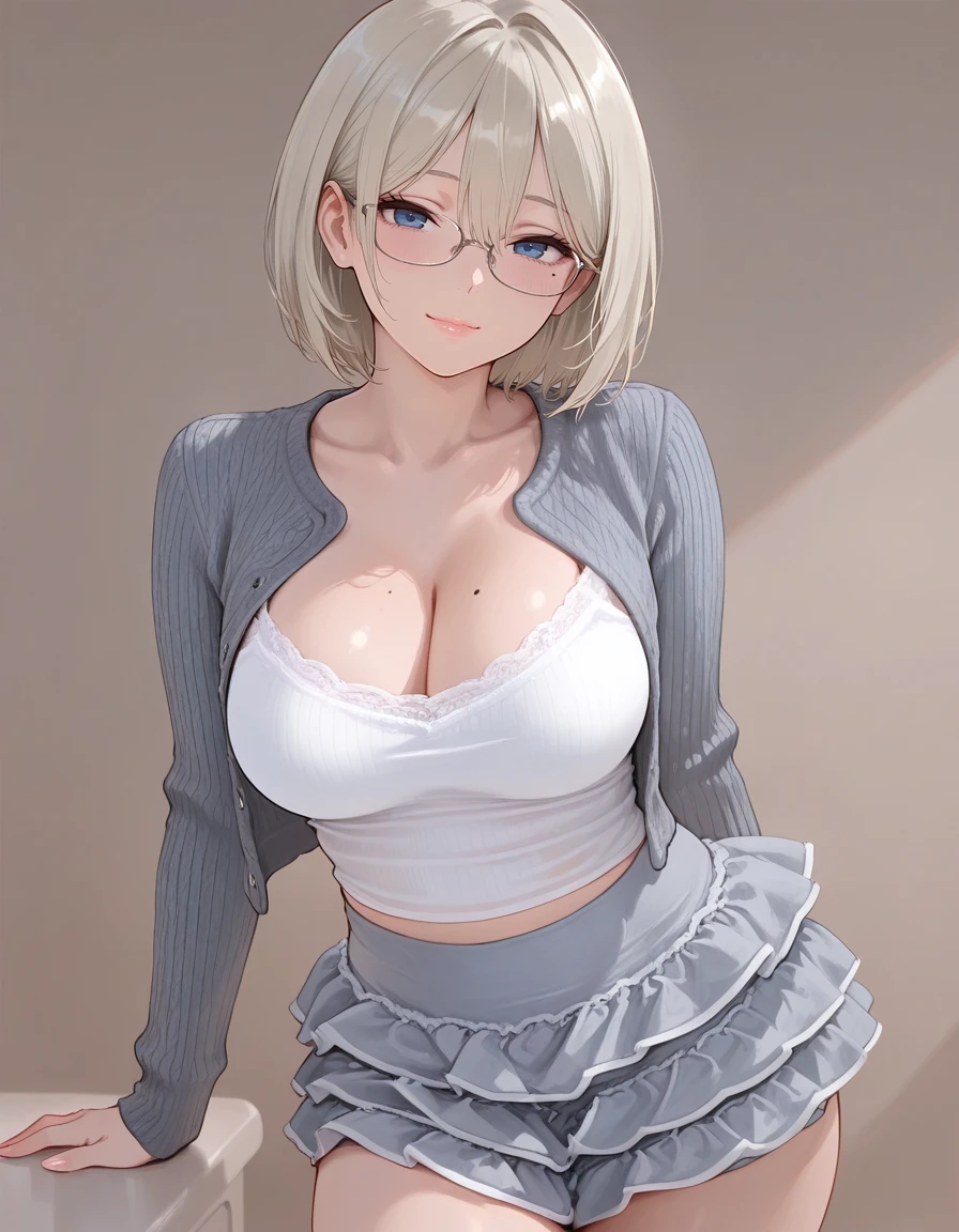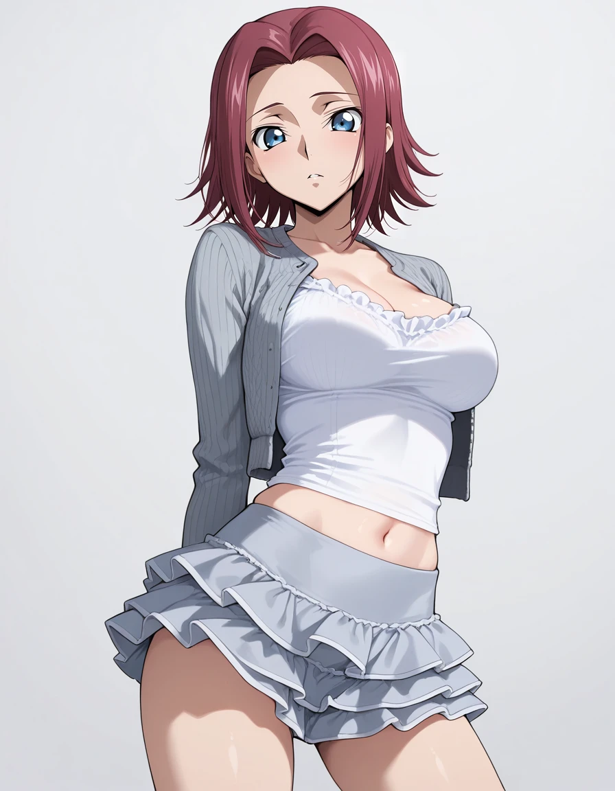 mai_layered_skirt,white_camisole,sweater_jacket,grey_jacket,open_jacket,frilled_skirt,grey_skirt