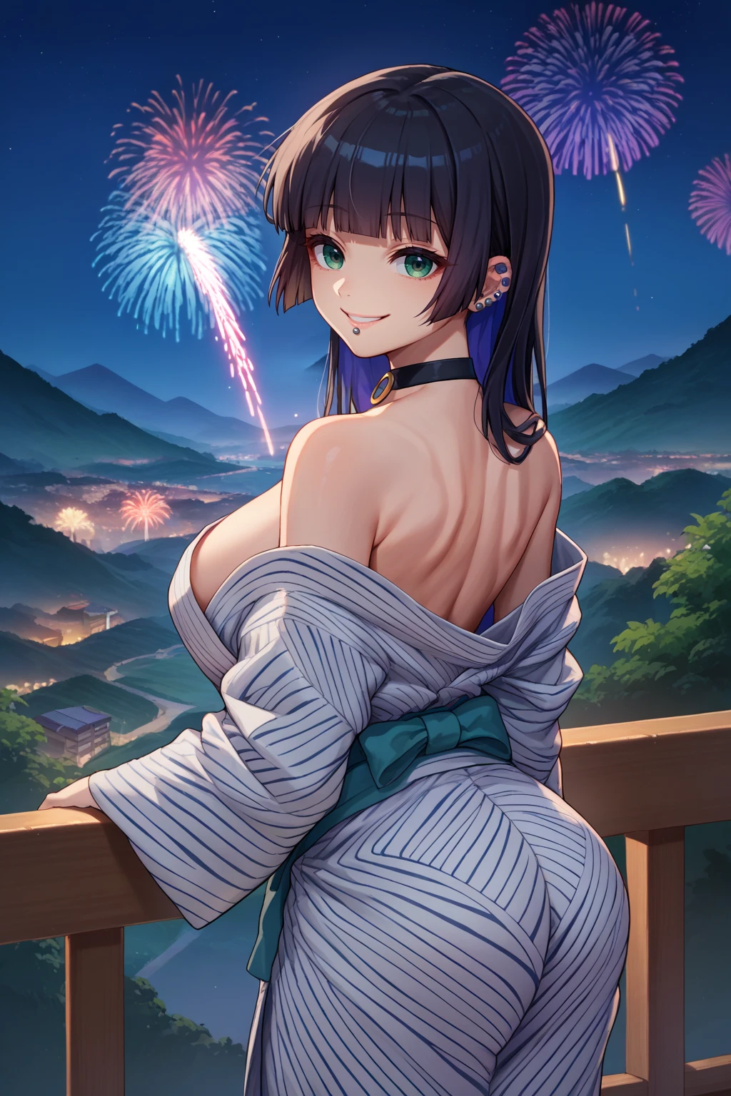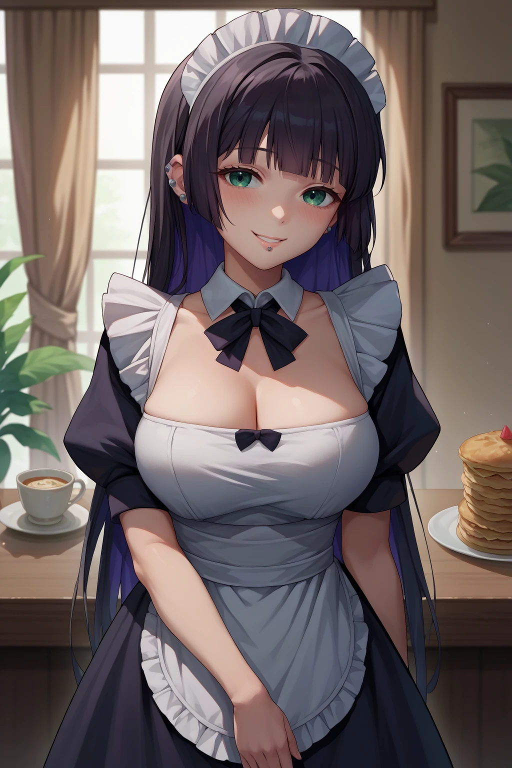Appearance : pasan, colored inner hair, large breasts, ear piercing, chin piercing, hime cut