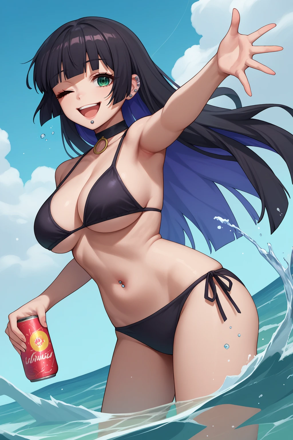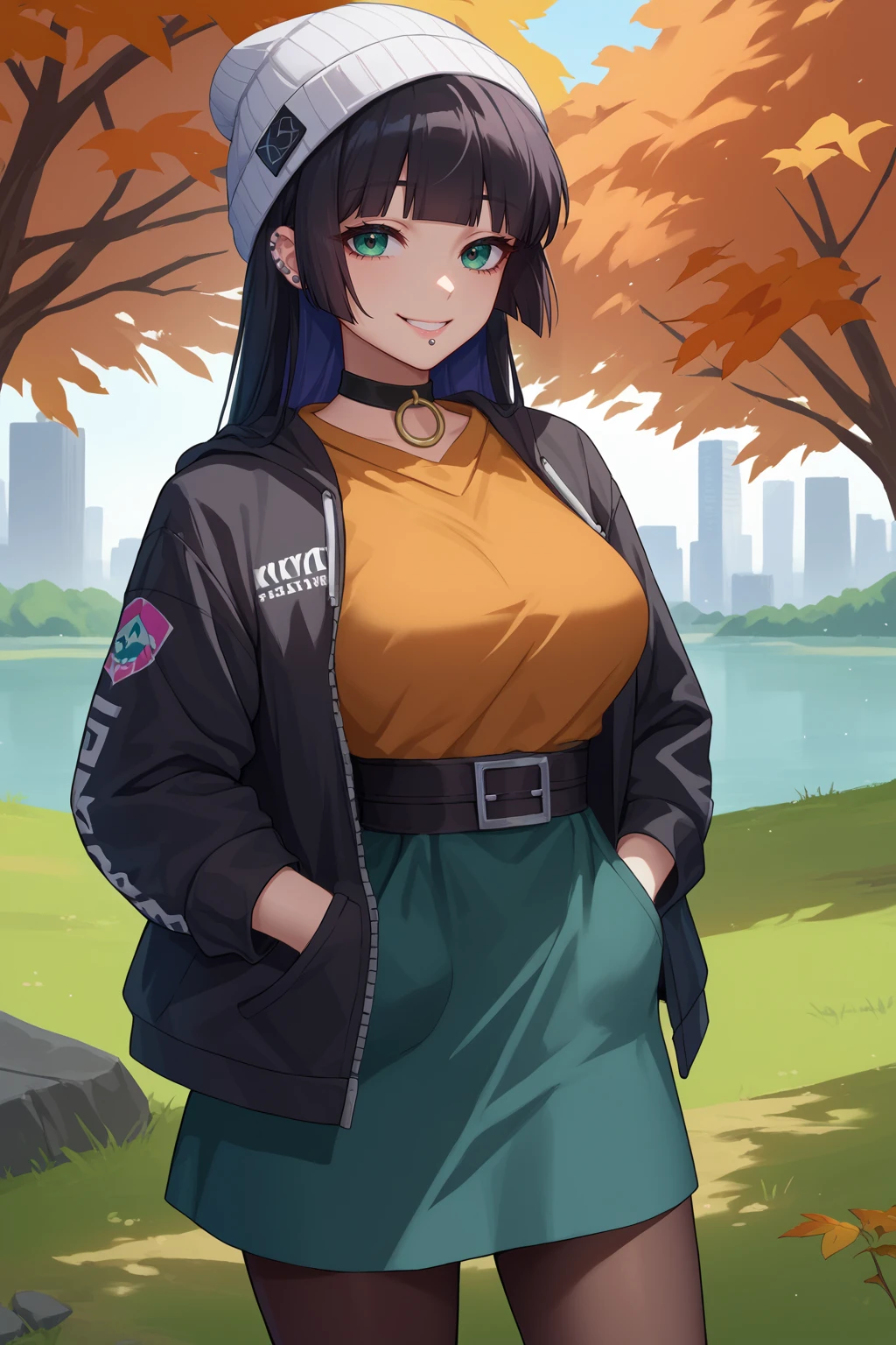 pasan, colored inner hair, large breasts, ear piercing, chin piercing, hime cut