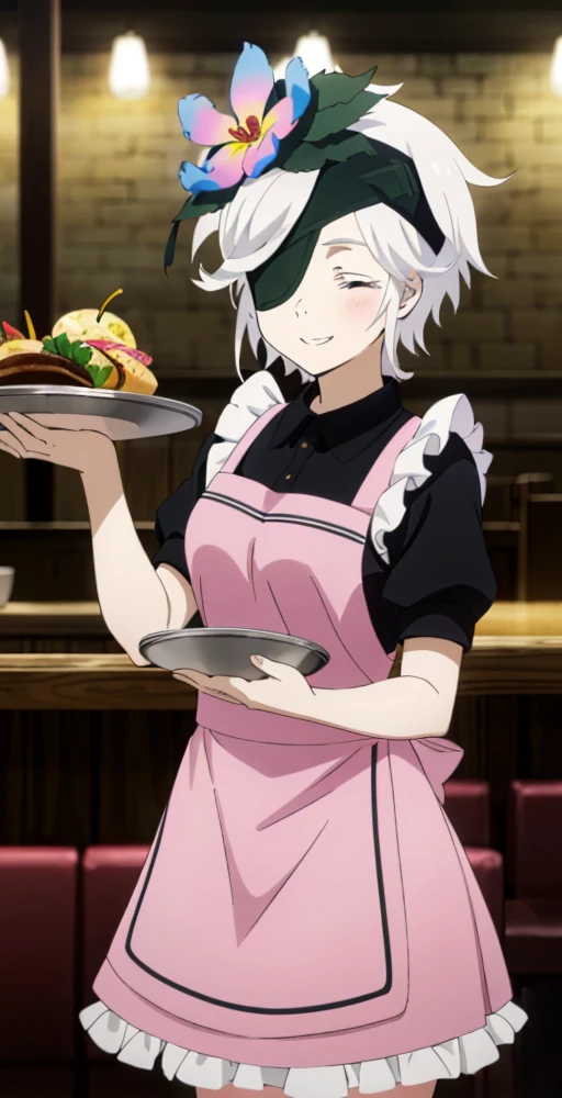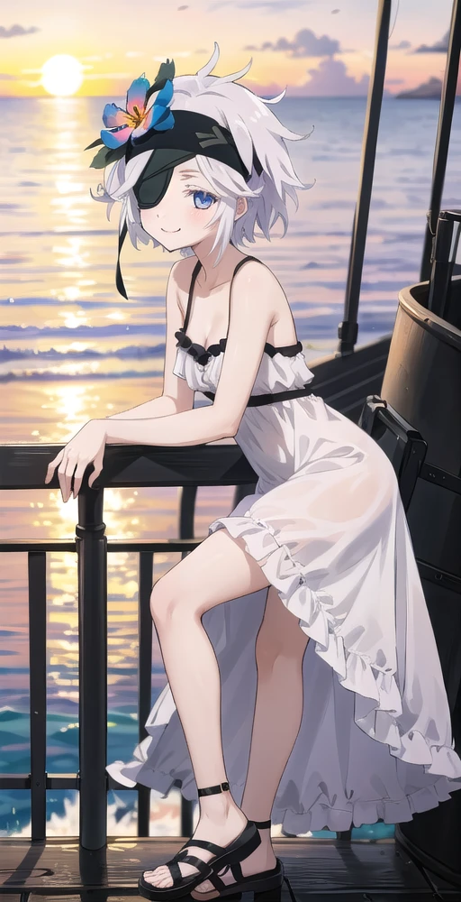 Main outfit-'hair ornament, pantyhose, thigh boots, gloves, eyepatch, cape, bandeau, flower, navel,'