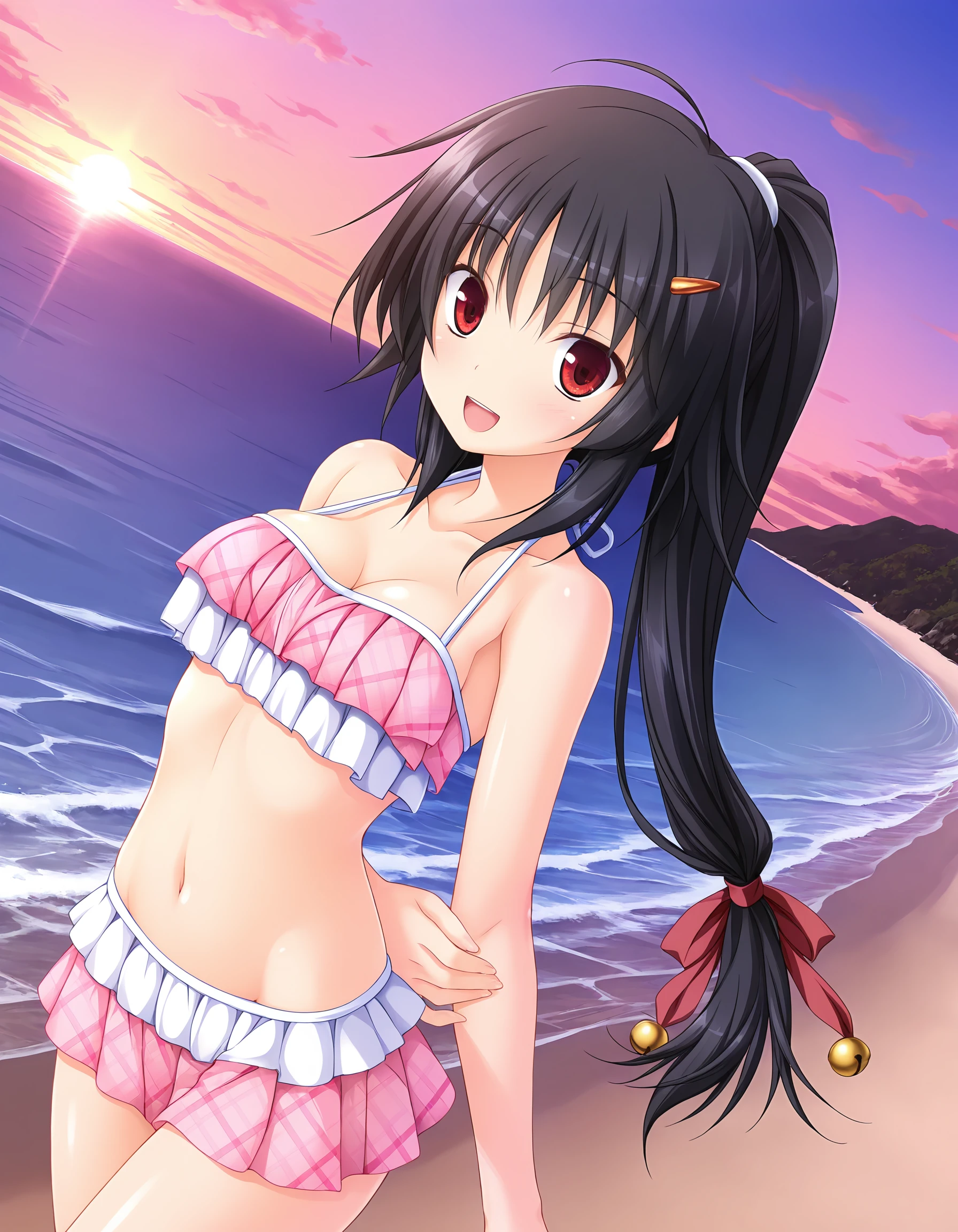outfit07, swimsuit, pink swimsuit, plaid swimsuit, 2-piece swimsuit, frill swimsuit, halter neck swimsuit, high ponytail, low tied hairbow, red hairbow, bell with hairbow,