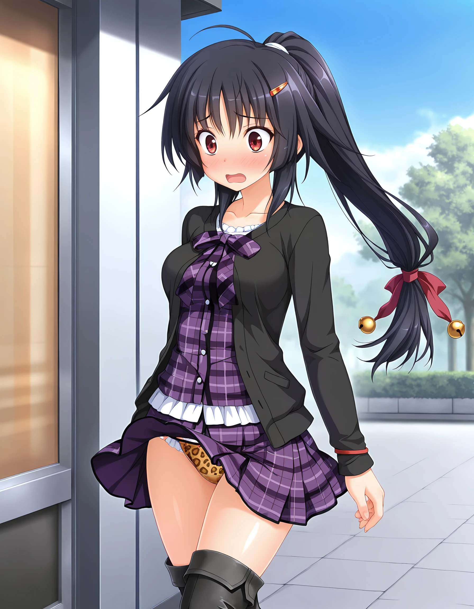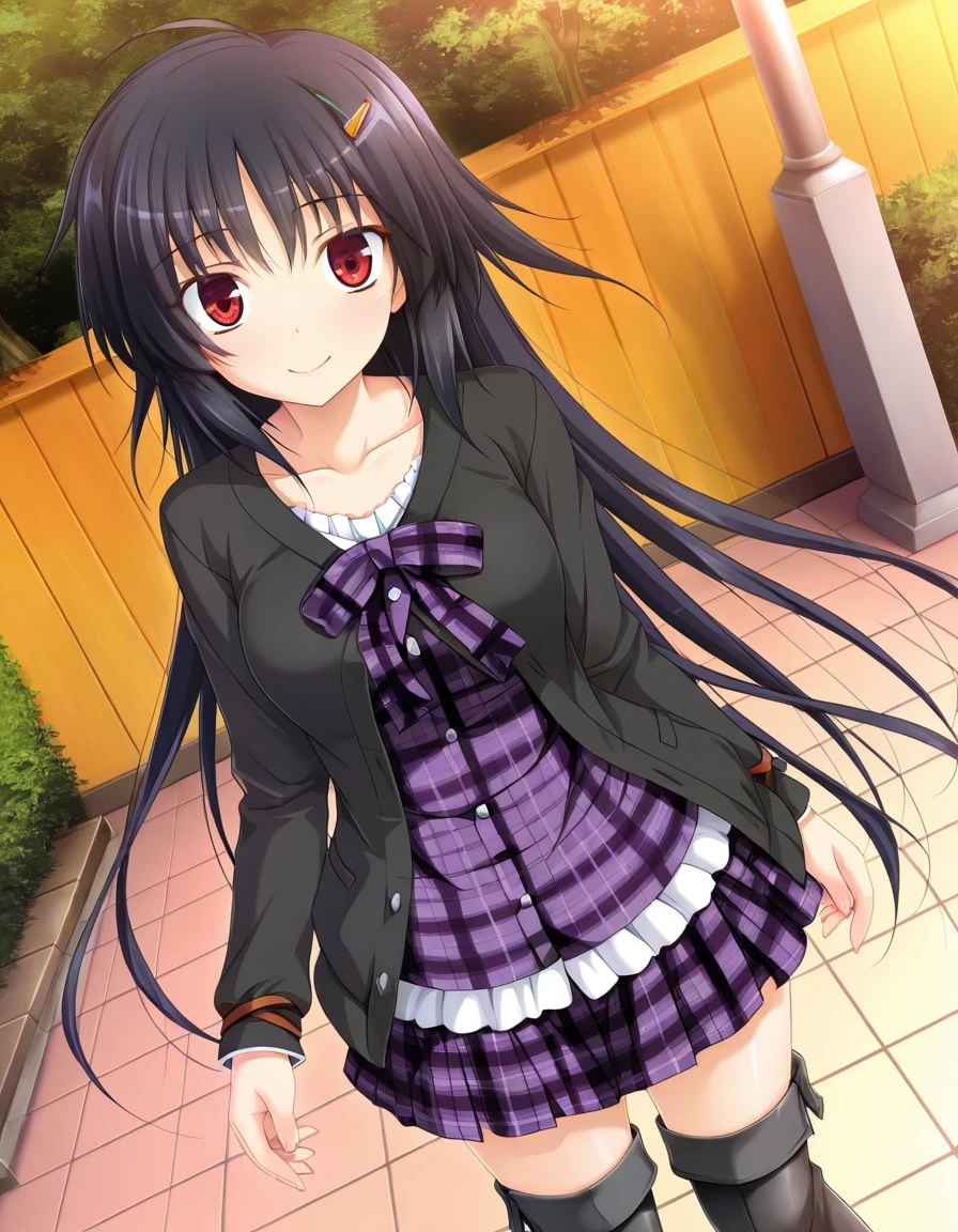 outfit02, cardigan, black cardigan, half open clothes, half open cardigan, shirt, purple shirt, plaid shirt, frill shirt, buttons, long sleeves, bowtie, purple bowtie, plaid bowtie, skirt, purple skirt, plaid skirt, mini skirt, wristbands, cross wristbands, boots, black boots, thighhigh boots, hairclip