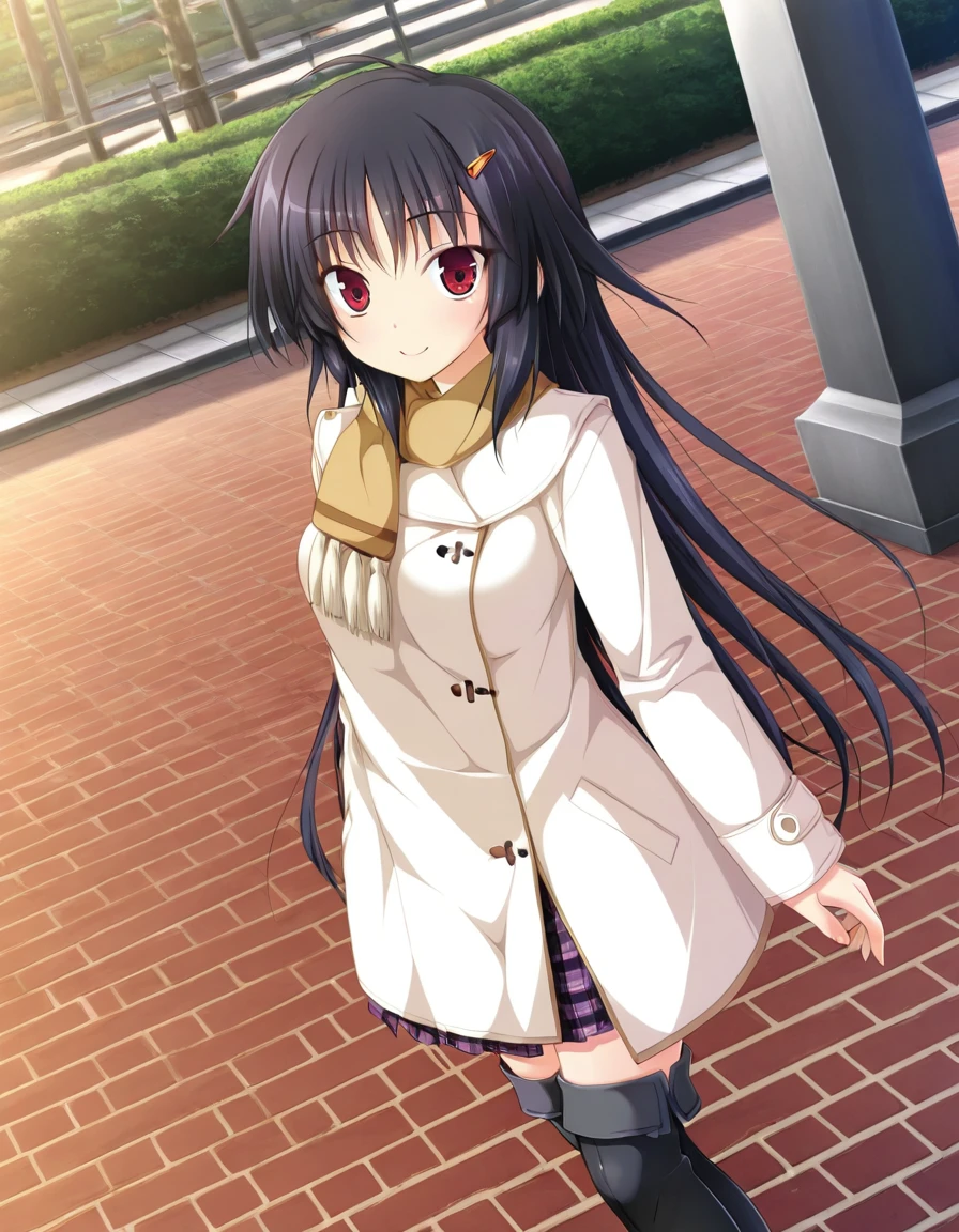 outfit03, coat, duffle coat, white coat, close clothes, close coat, scarf, scarf around neck, beige scarf, skirt, purple skirt, plaid skirt, mini skirt, boots, black boots, thighhigh boots, hairclip