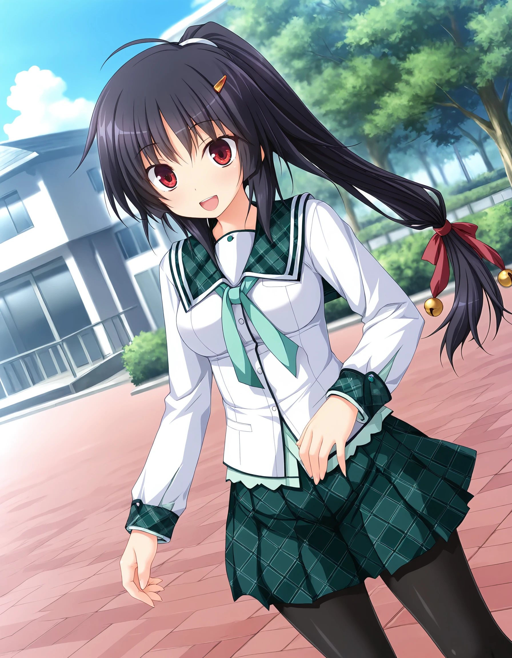 outfit01, green sailor collar, plaid sailor collar, shirt, white shirt, long sleeves, split sleeves, green cuff, plaid cuff, undershirt, light green undershirt, tie, light green tie, skirt, green skirt, plaid skirt, pleated skirt, pantyhose, black pantyhose, high ponytail, low tied hairbow, red hairbow, bell with hairbow,