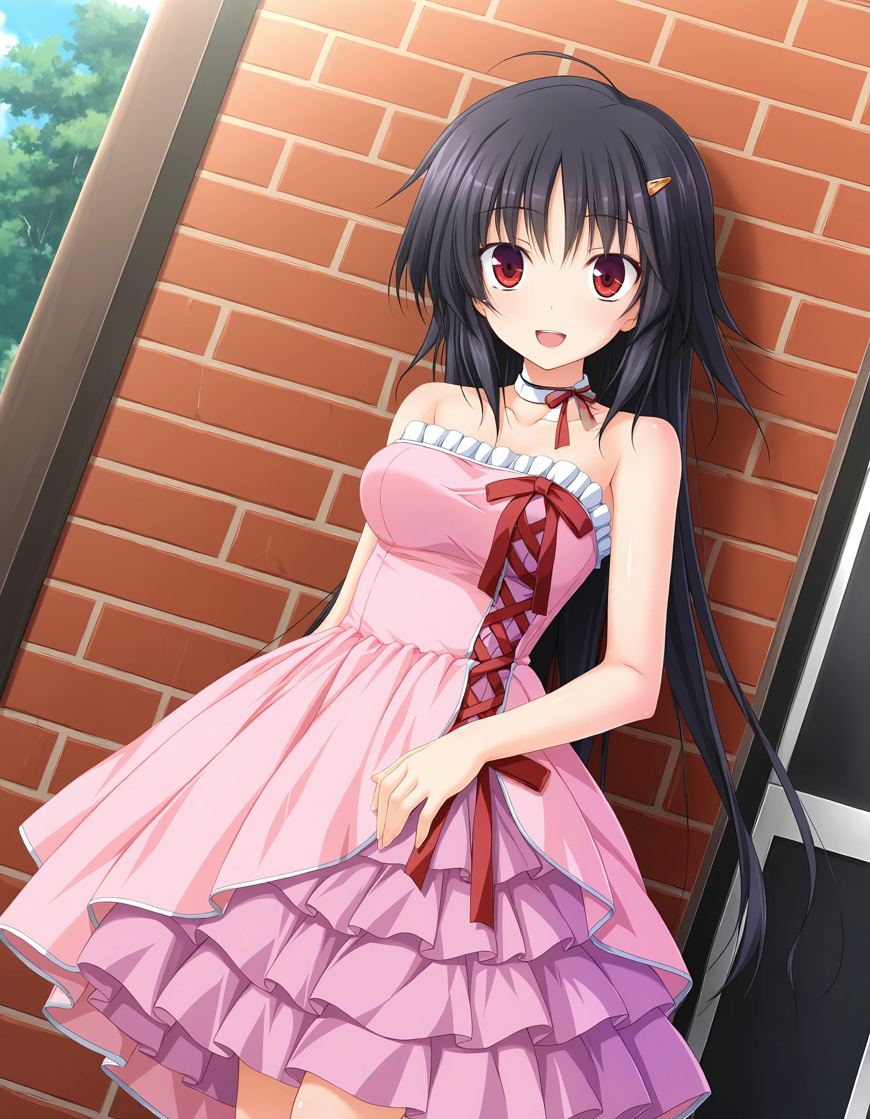 outfit05, dress, frill dress, white frill, short dress, strapless dress, sleeveless dress, pink dress, layered dress, purple layered dress, lace-up dress, red lace-up, choker, white choker, neck ribbon, red ribbon, hairclip