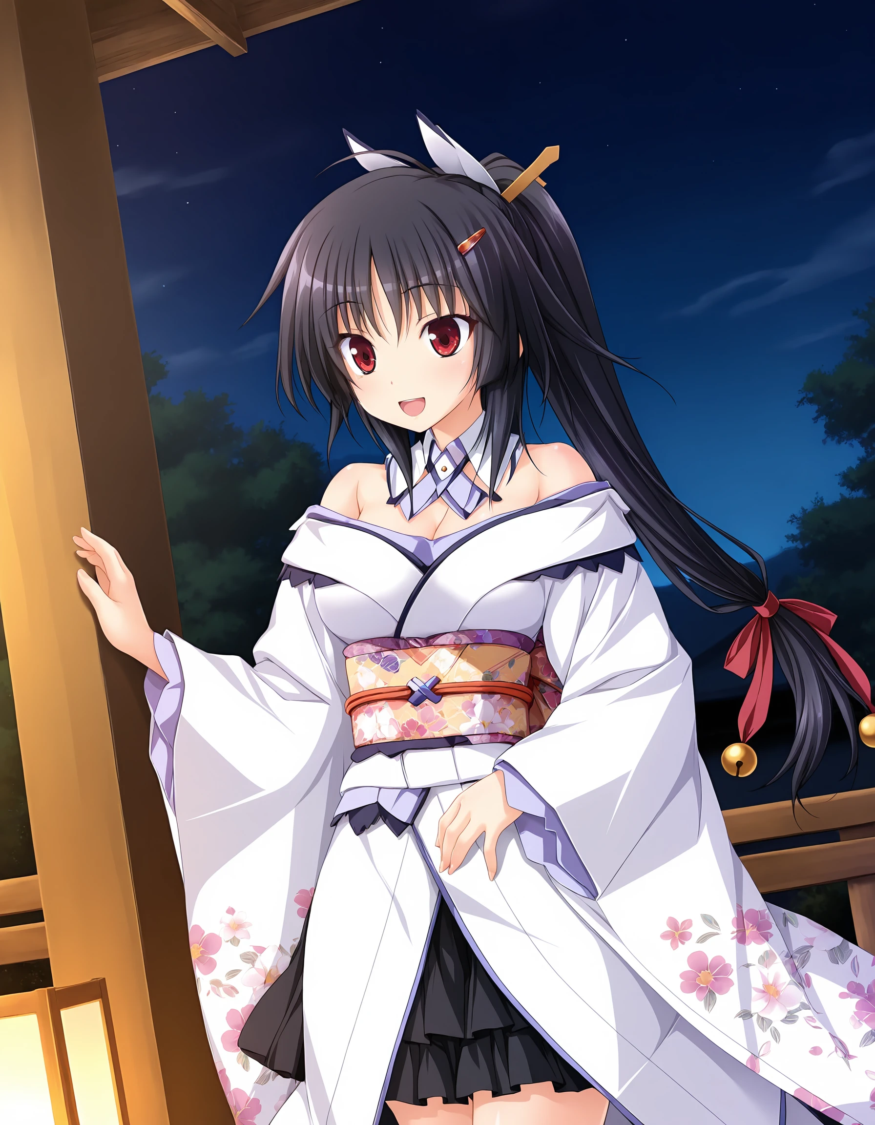 outfit04, Japanese clothes, kimono, white kimono, off shoulders kimono, floral print kimono, obi, floral print obi, sash, detached collar, white collar, tie, character tie, skirt, black skirt, flared skirt, mini skirt, high ponytail, hair ribbon, hair ribbon with ornament, low tied hairbow, red hairbow, bell with hairbow, hairclip