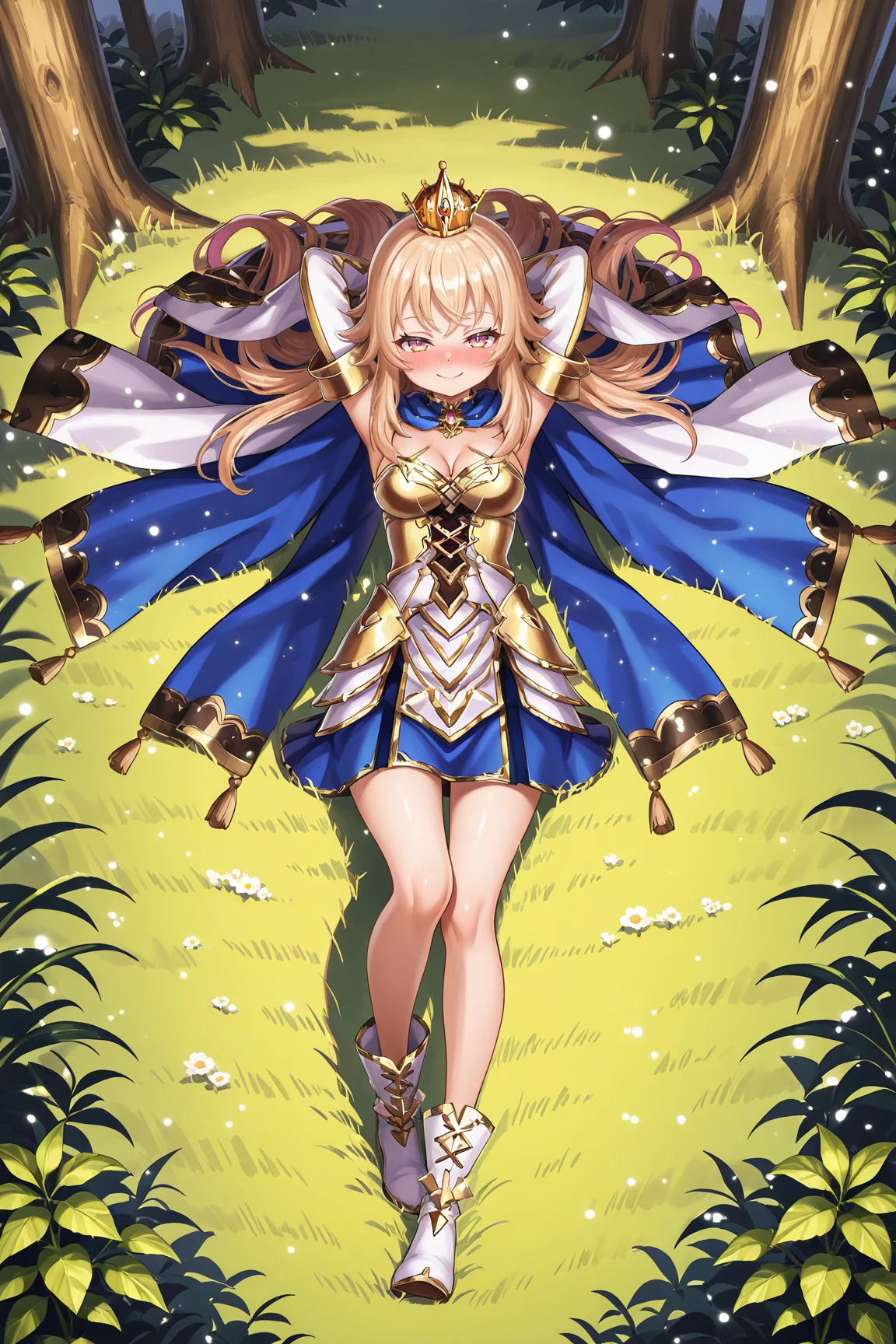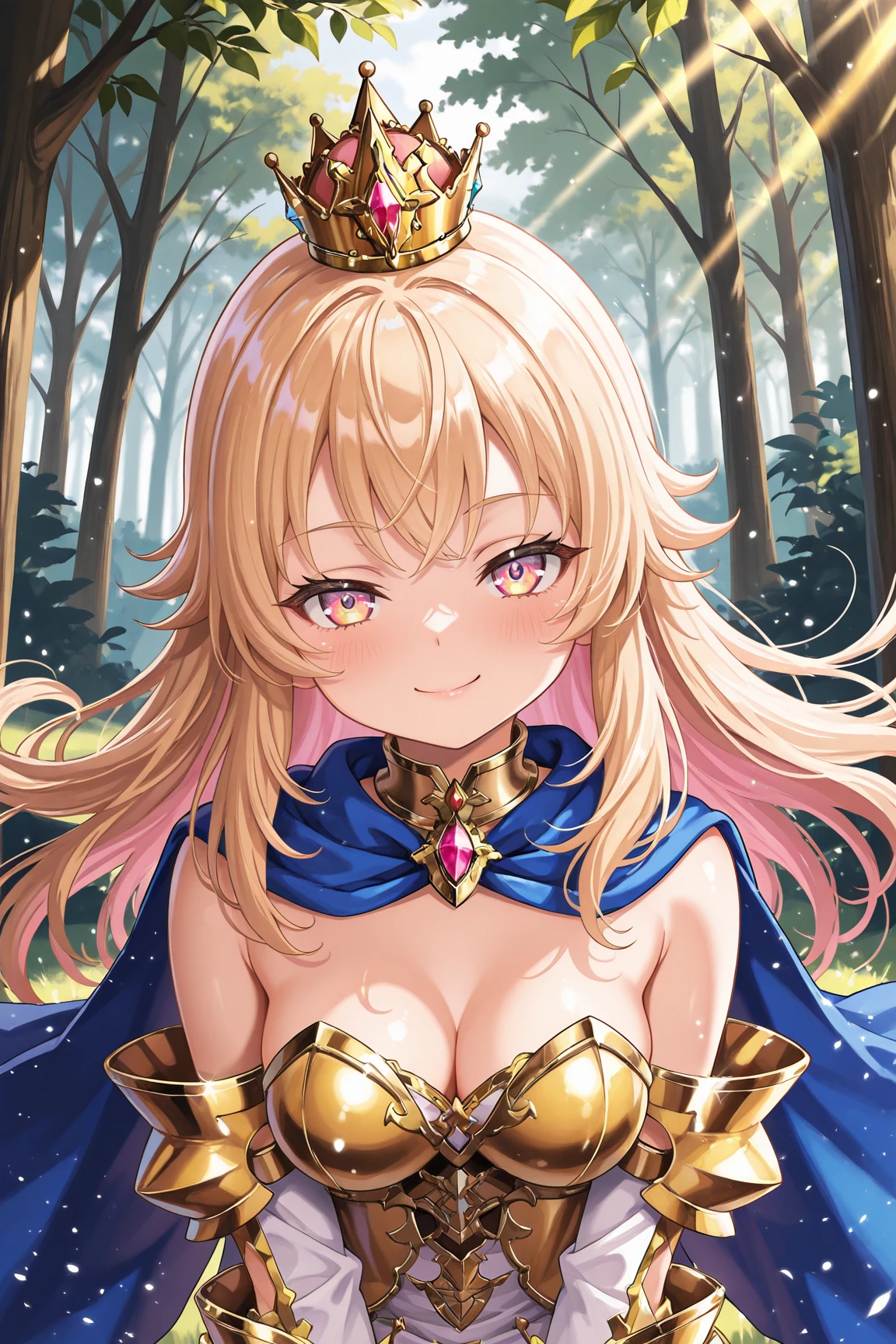 ➜ LizaGSILXL, pink eyes, yellow eyes, multicolored eyes, blonde hair, long hair, bangs, orange crown, medium breasts, golden armor, blue cape, cleavage, white dress, detached sleeves, blue skirt, white boots]--|======[ 💗 My Settings: 💗 ]======|--[