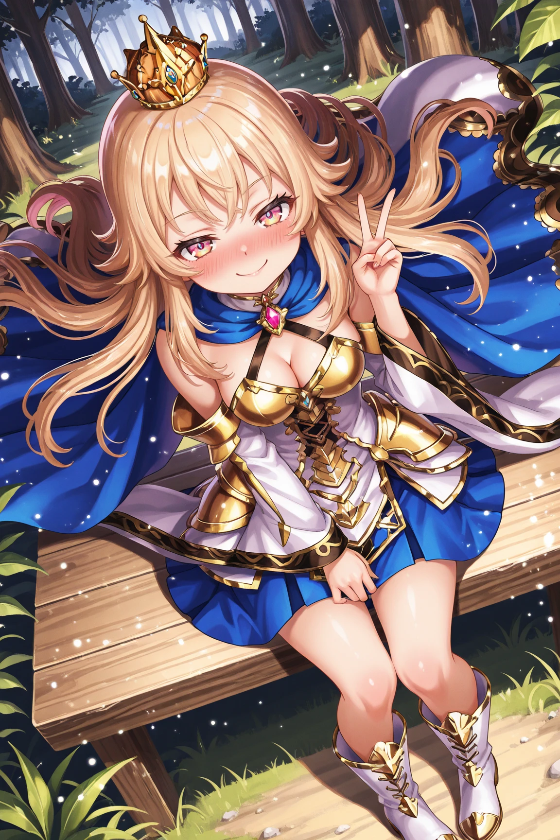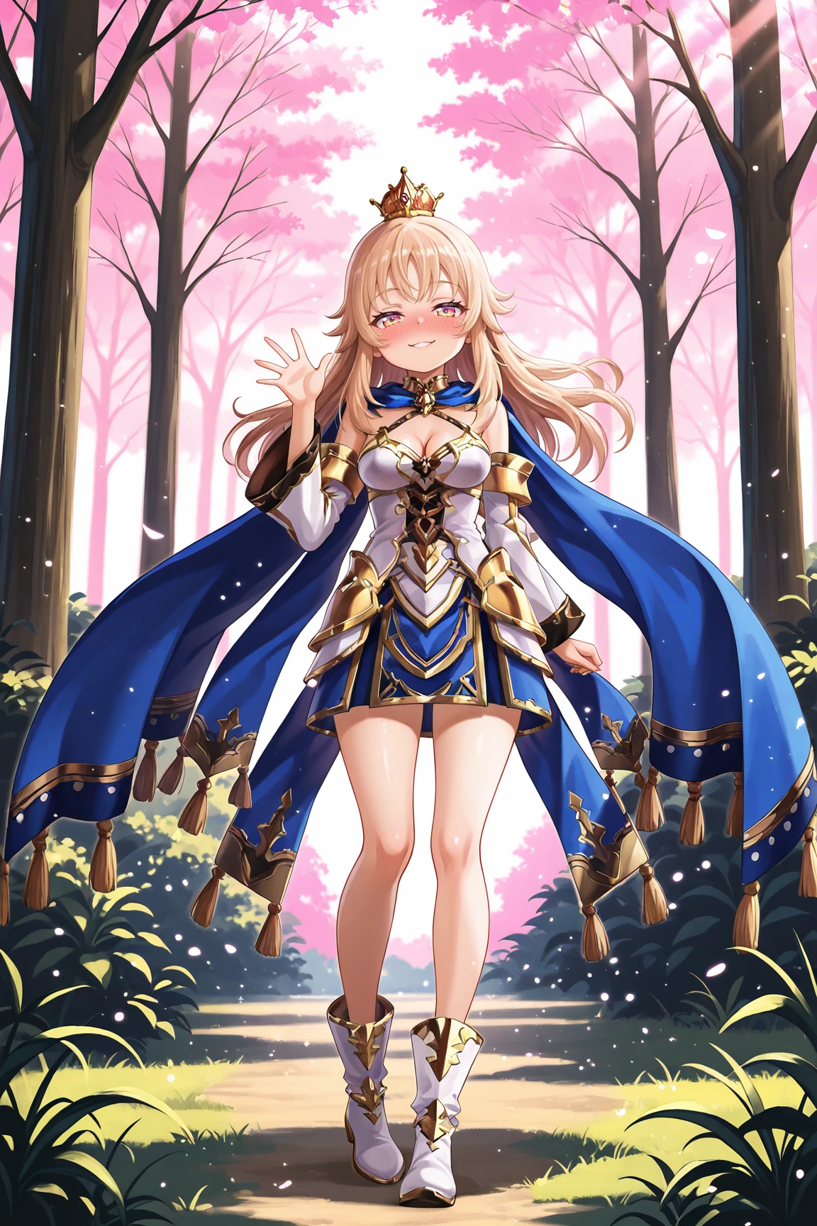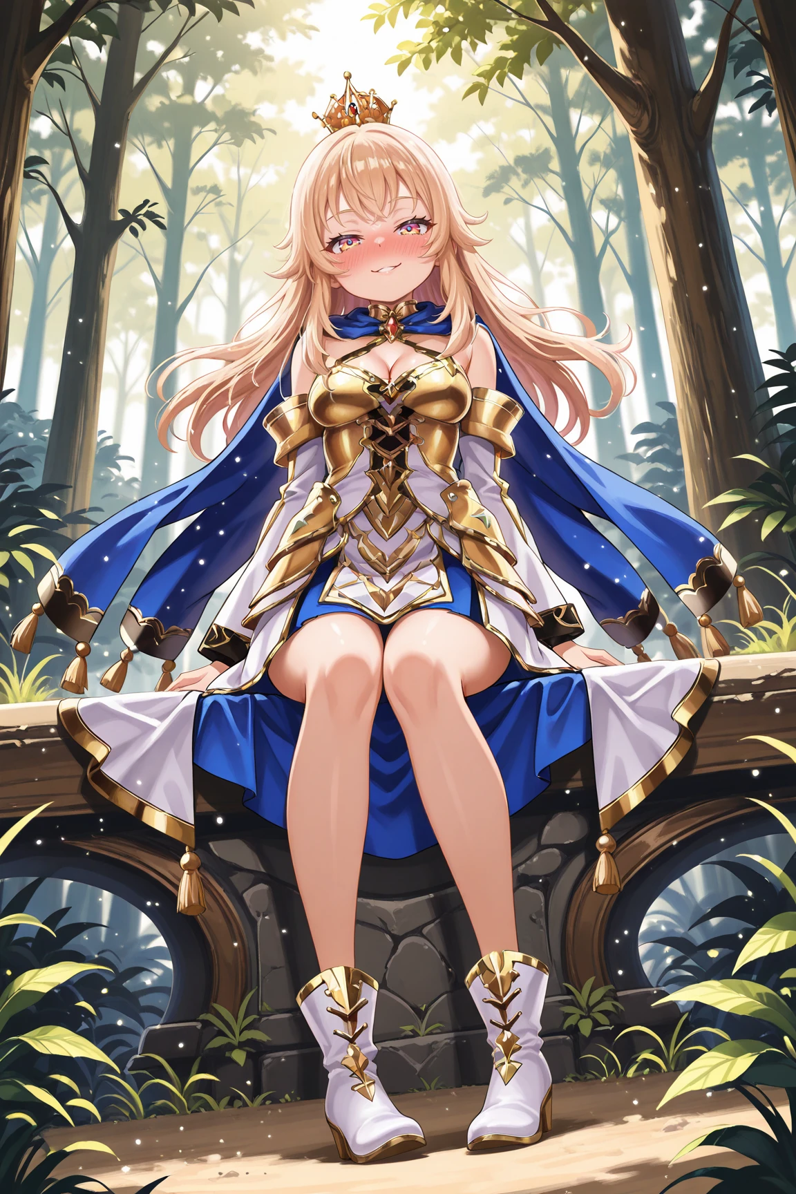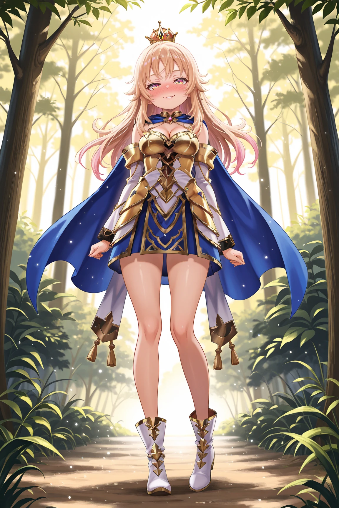 LizaGSILXL, pink eyes, yellow eyes, multicolored eyes, blonde hair, long hair, bangs, orange crown, medium breasts, golden armor, blue cape, cleavage, white dress, detached sleeves, blue skirt, white boots