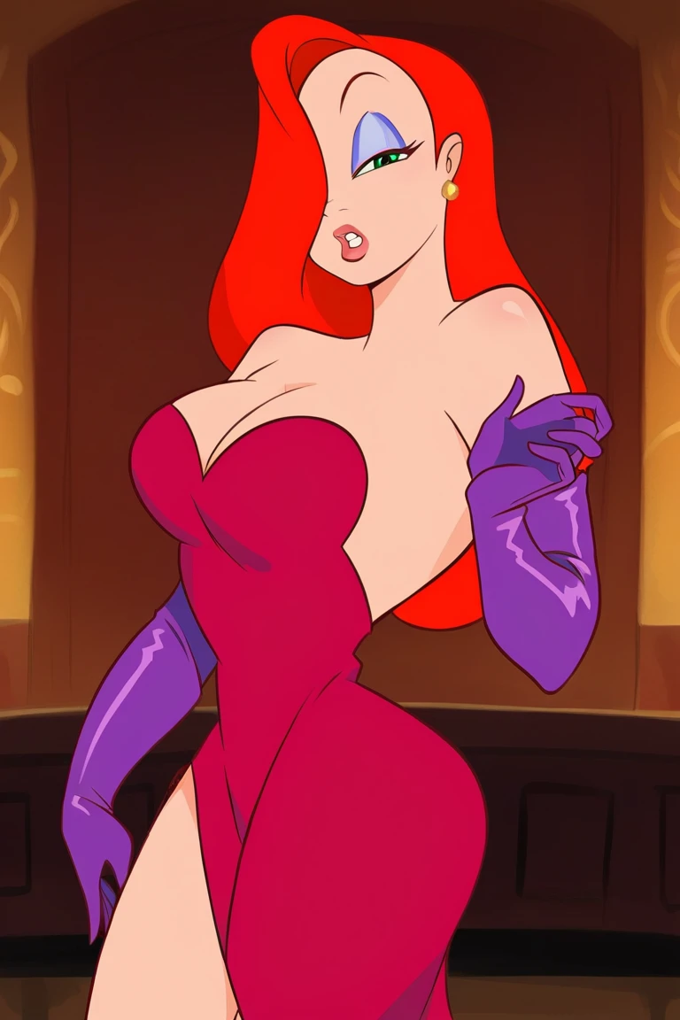 purple elbow gloves, red dress, side slit, red heels