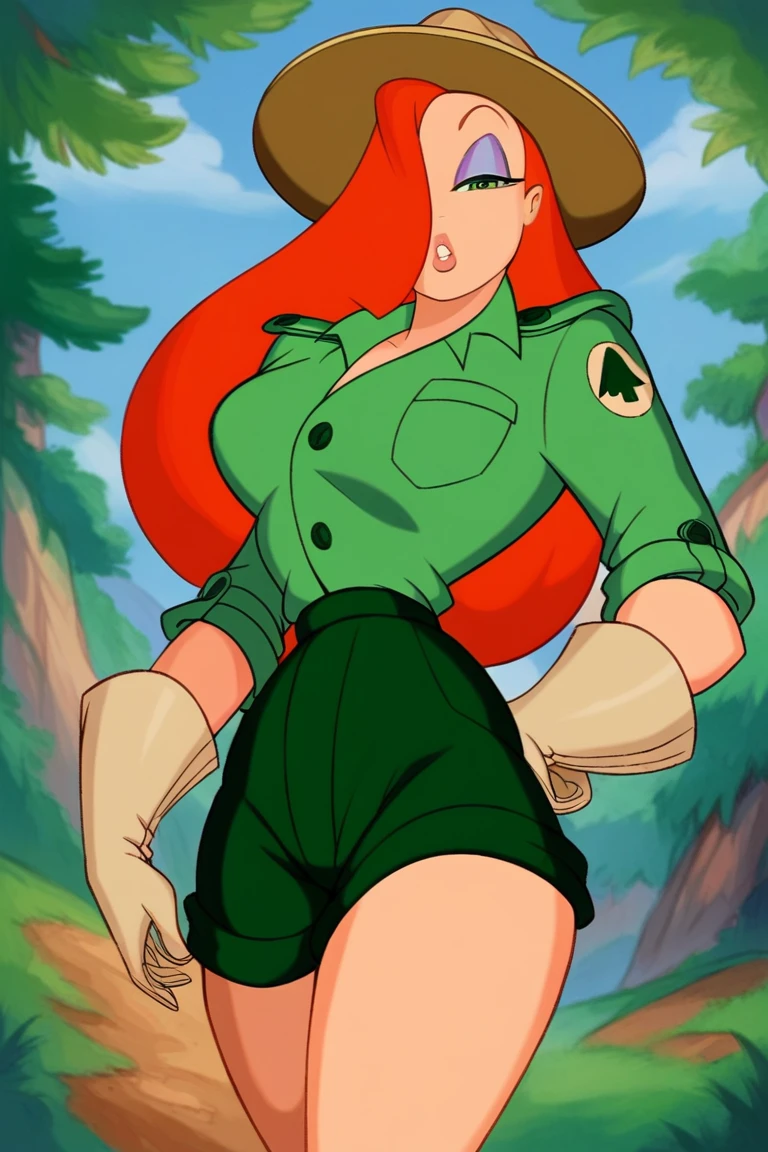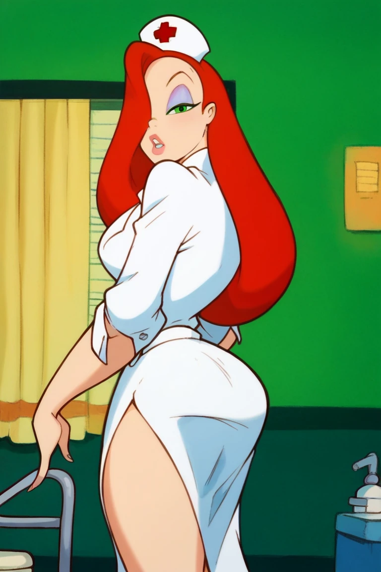 j3ssic4 r4bb1t, red hair, long hair, hair over one eye, eyeshadow, green eyes, earrings, lipstick