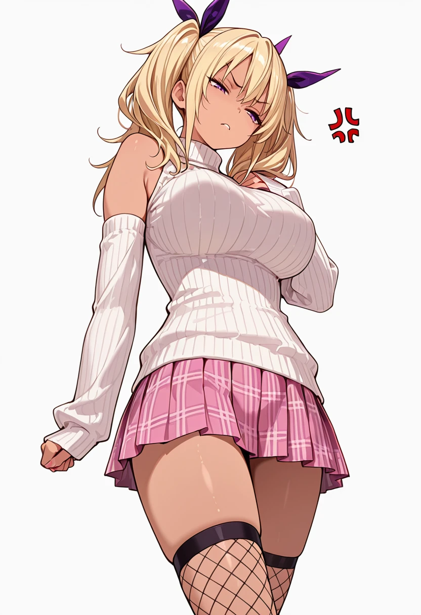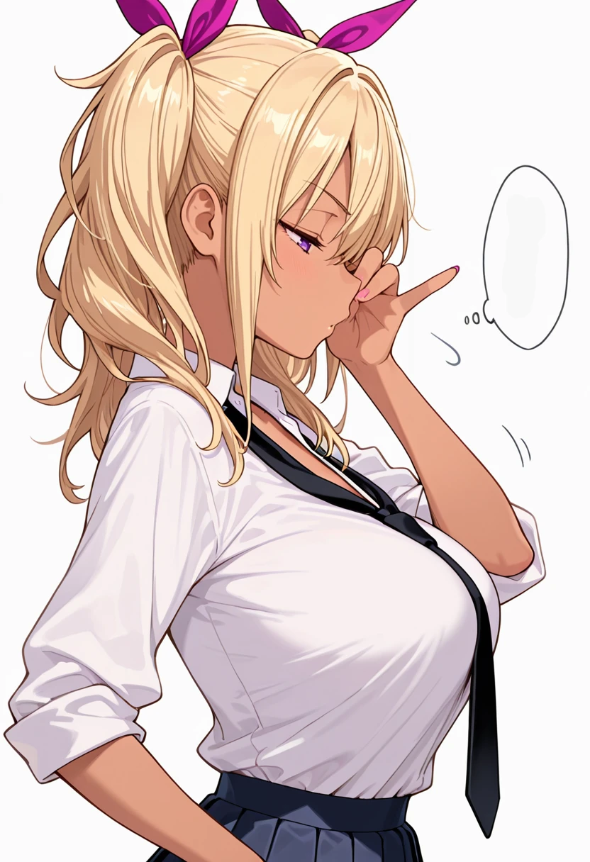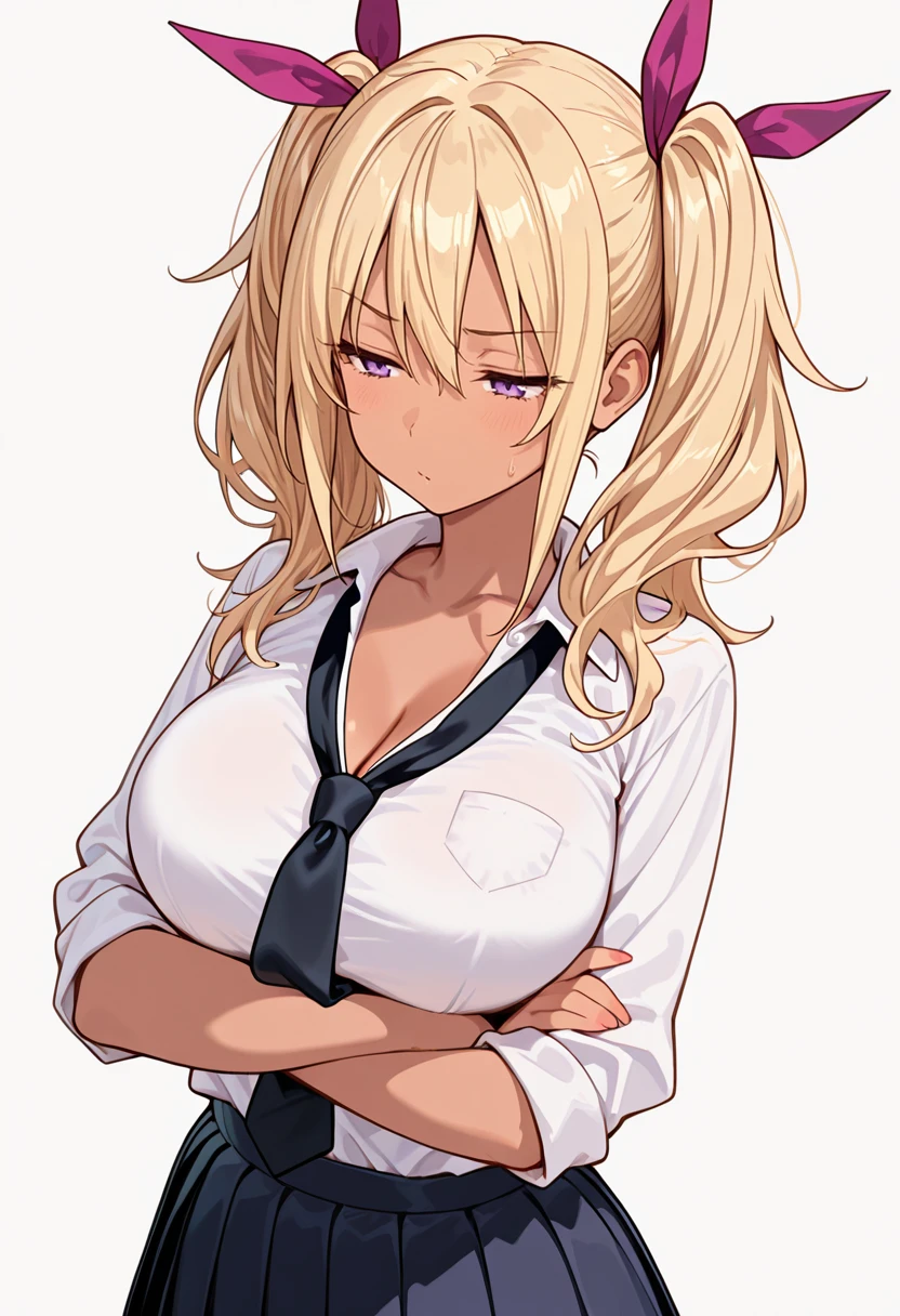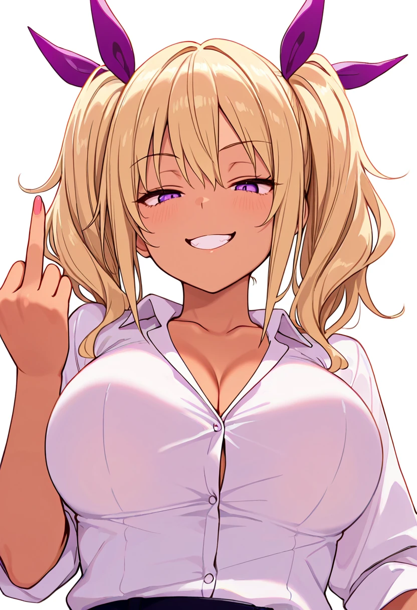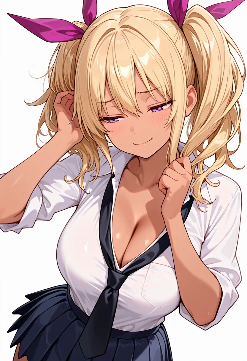 an_cnr, 1girl, blonde hair, long hair, purple eyes, large breasts, dark-skinned female,gyaru, twintails,half-closed eyes,hair ribbon,