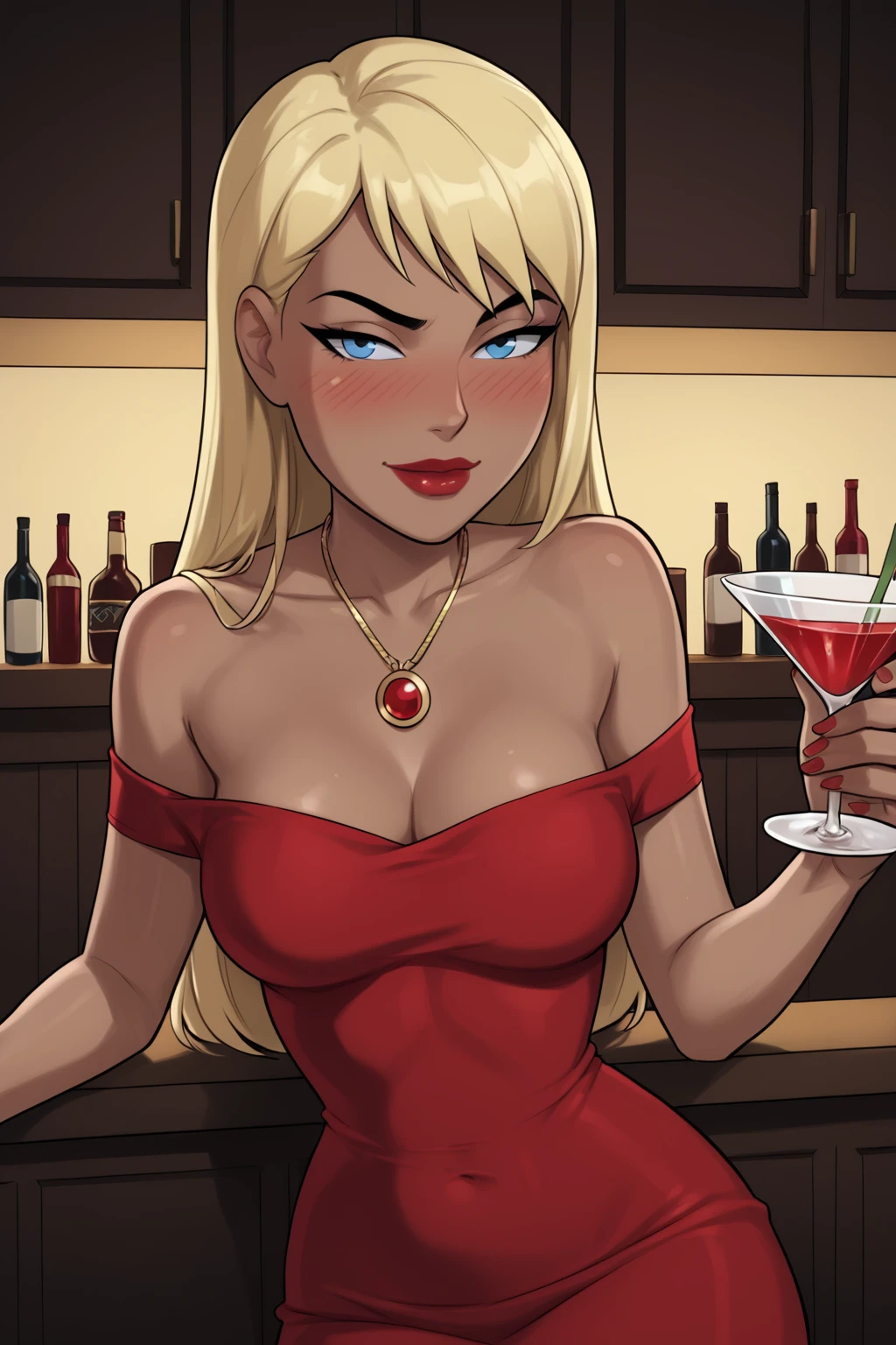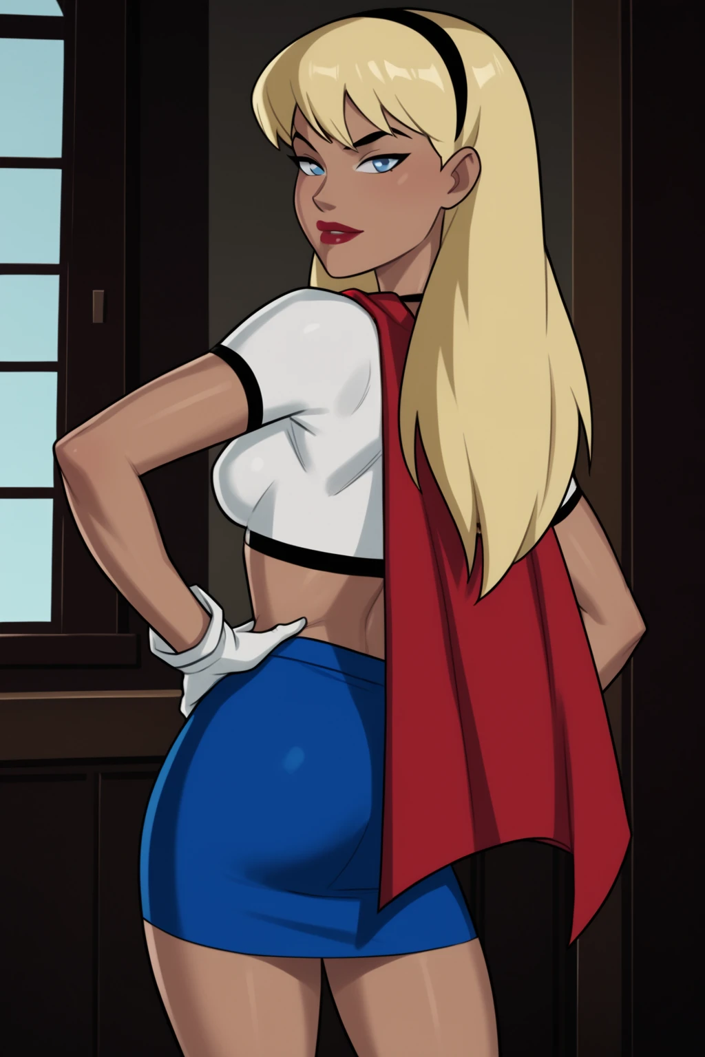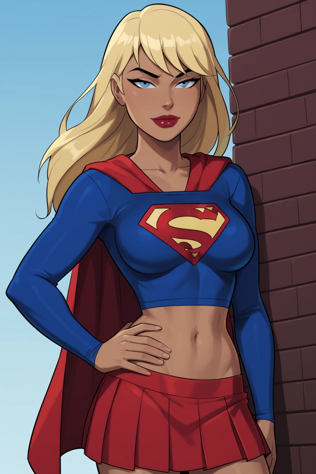 Base Prompt: kara zor-el, long hair, blonde hair, blue eyes, dark-skinned female