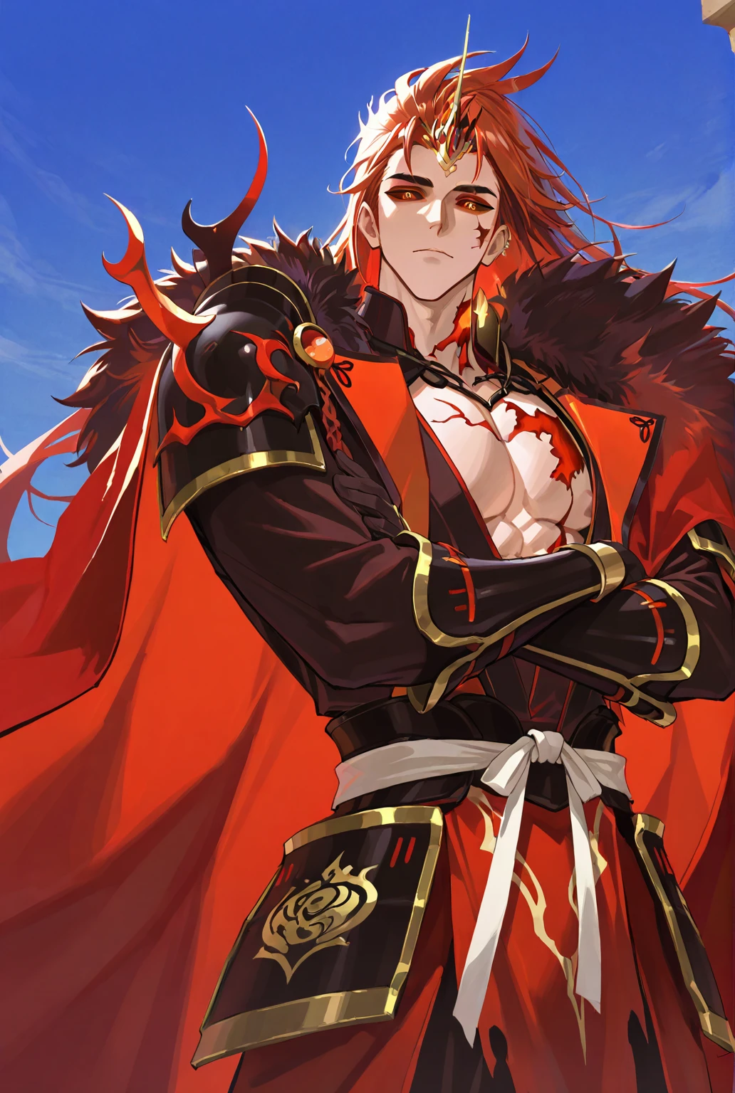 long hair, fur trim, jewelry, armor, pectorals, bare pectorals, red cape, cape,