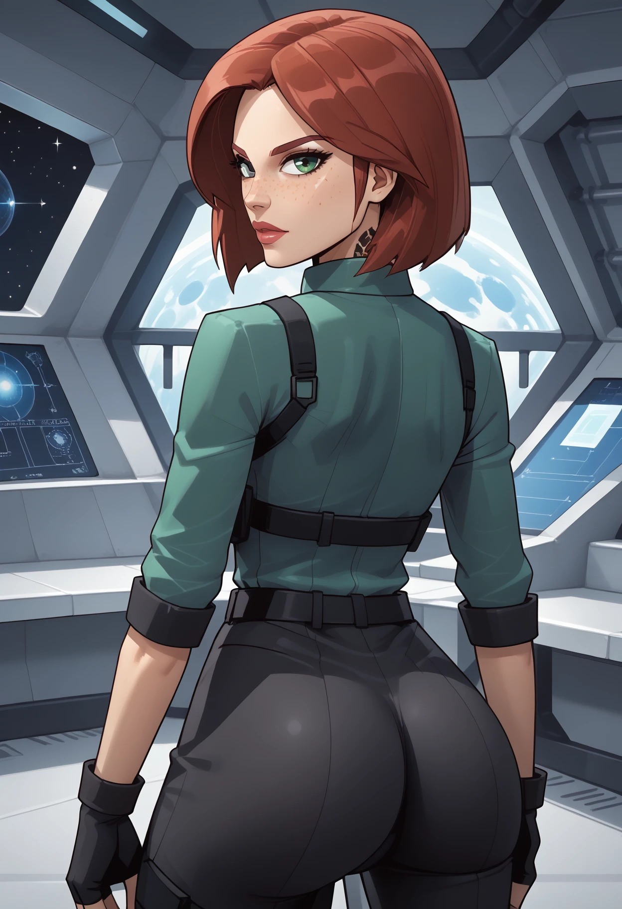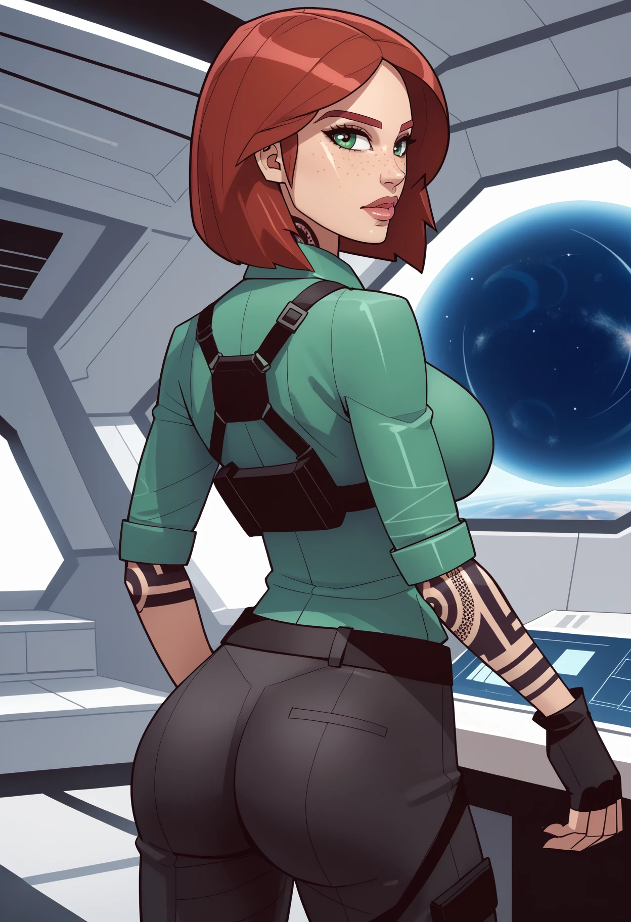 recommended tags: 1girl, solo, green eyes, short hair, red hair, freckles, breasts, medium breasts, tattoo, lips,