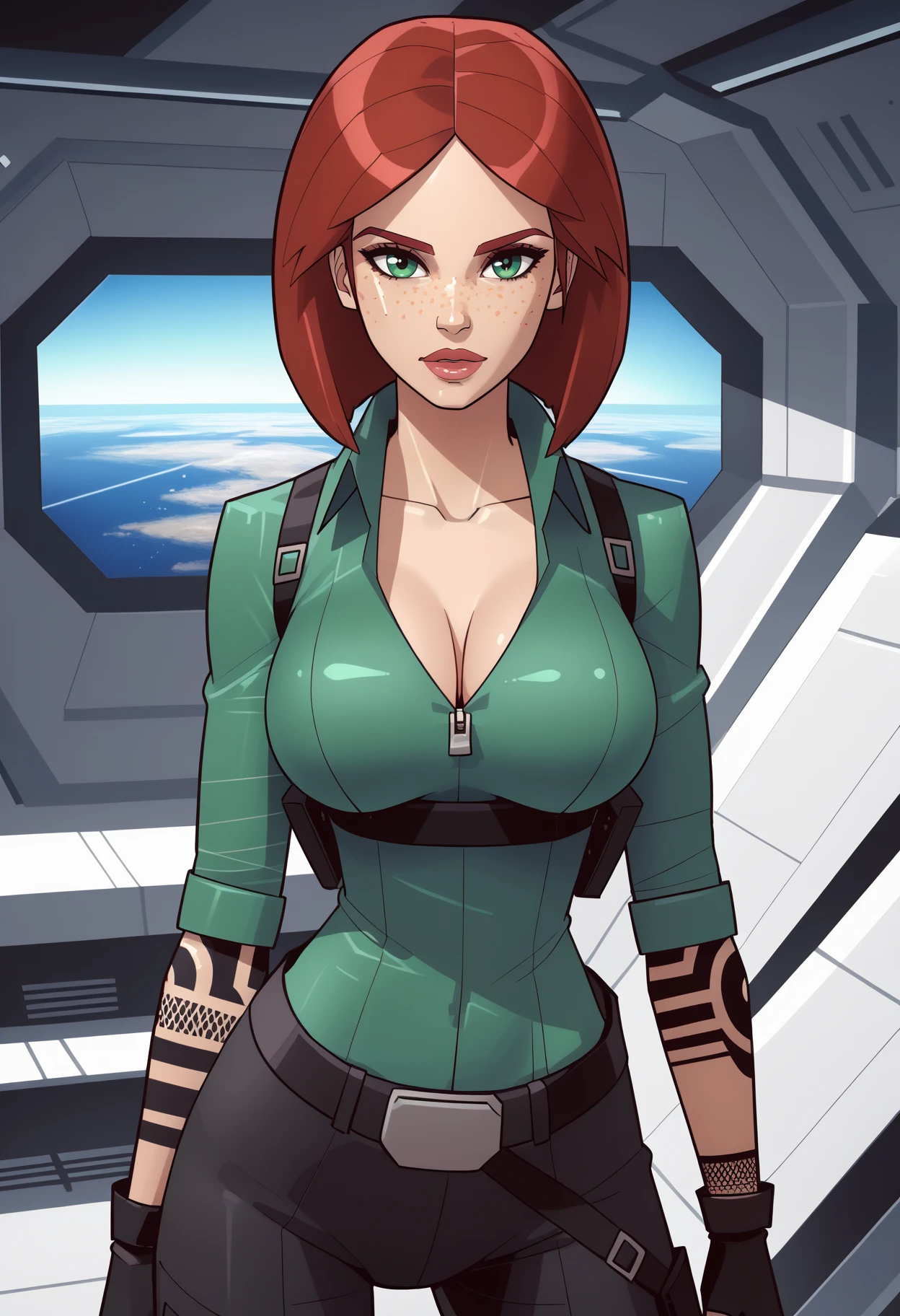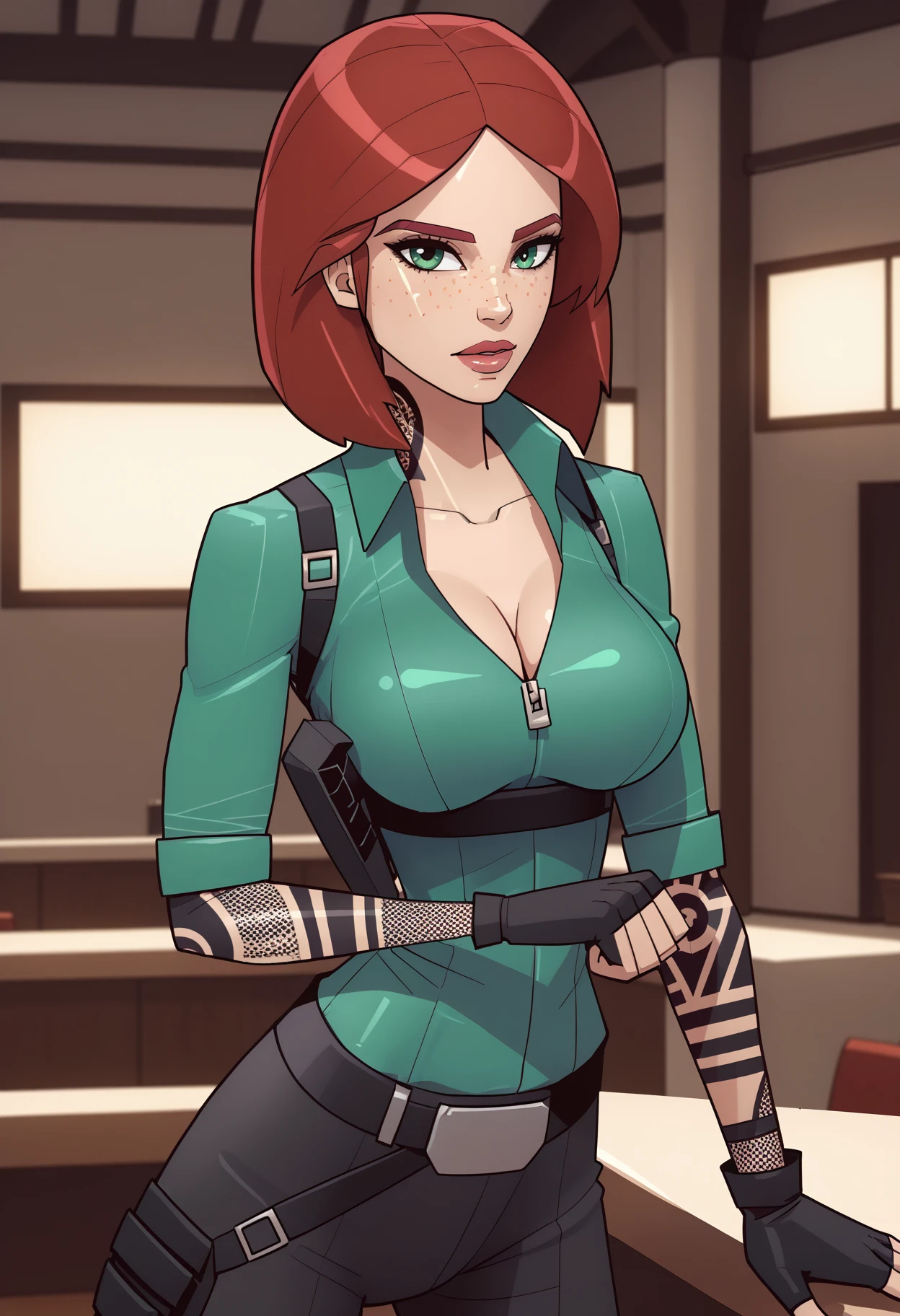 1girl, solo, green eyes, short hair, red hair, freckles, breasts, medium breasts, tattoo, lips,