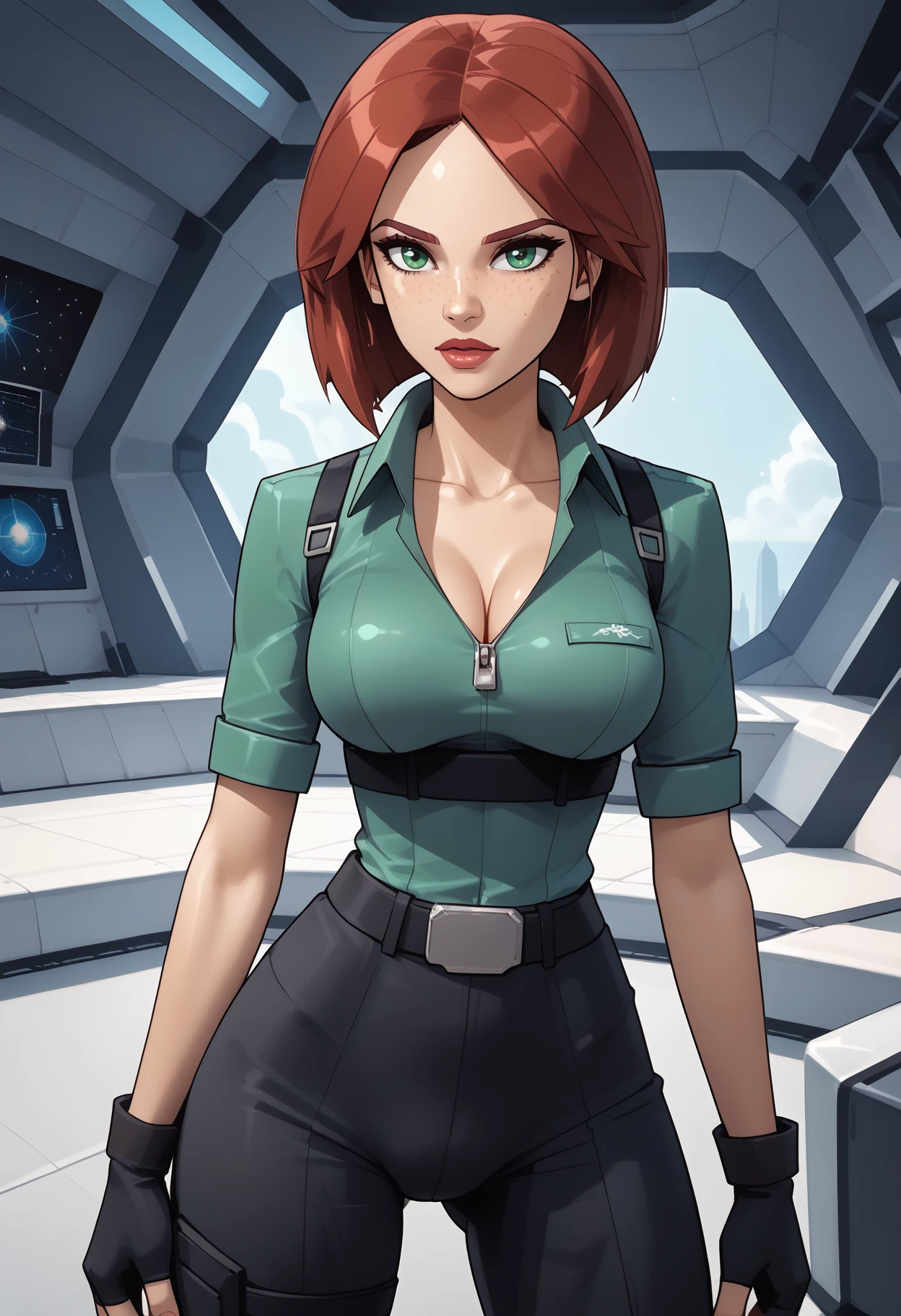 outfit tags: shirt, green shirt, cleavage, gloves, black gloves, fingerless gloves, holster, pants, black pants, belt,