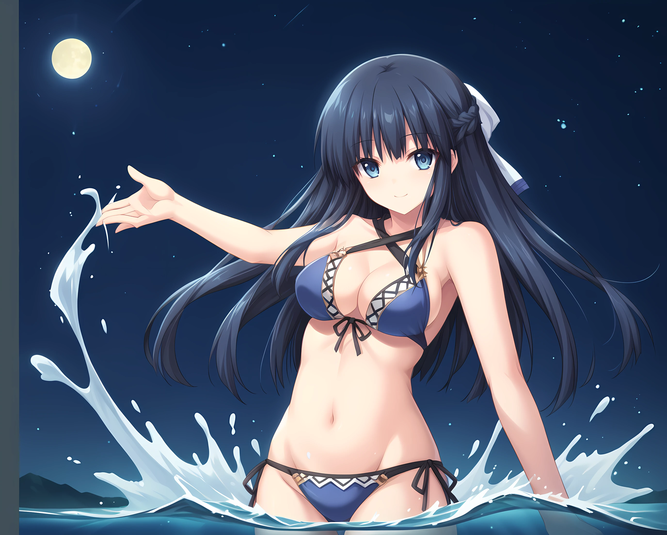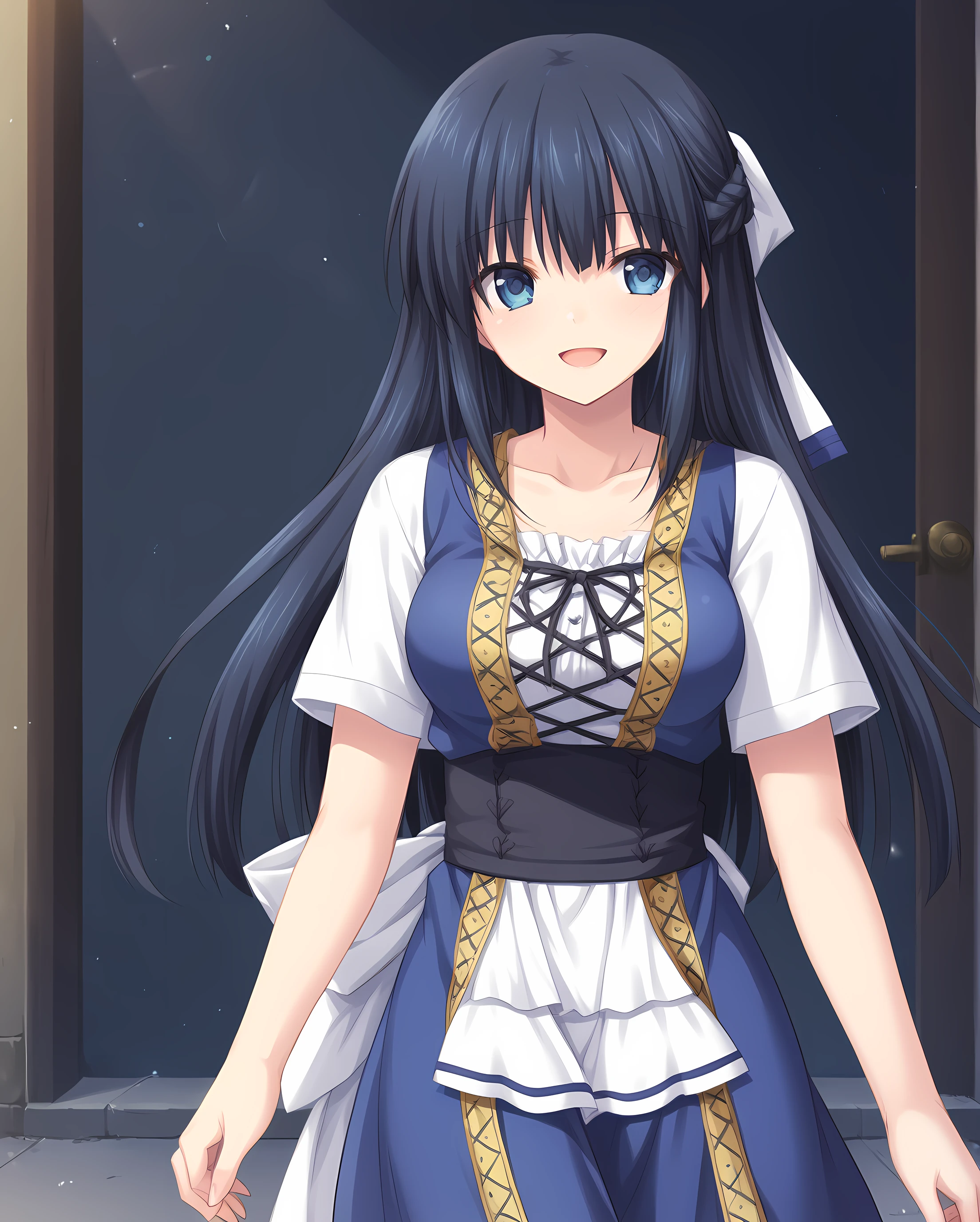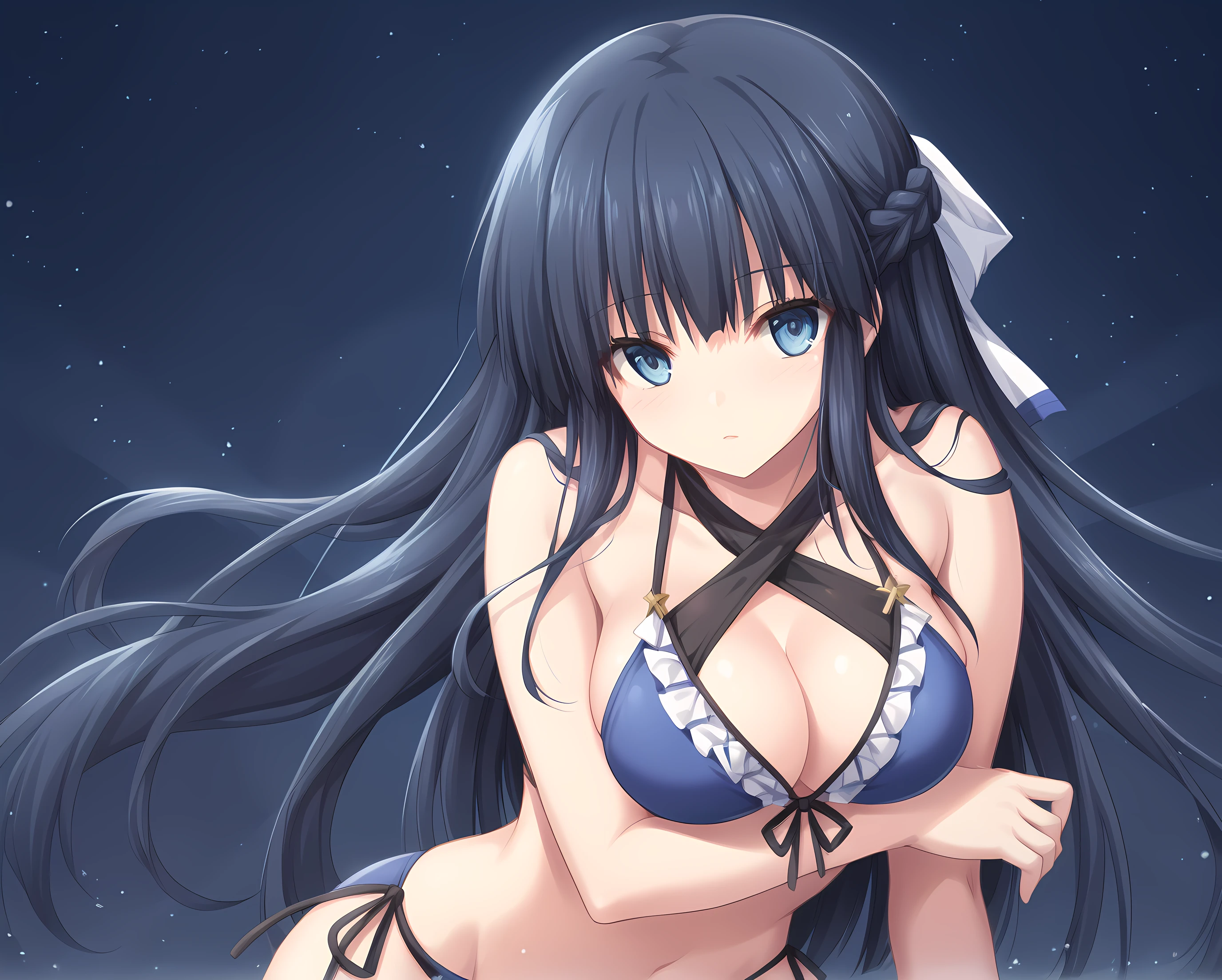 eushully,liselle,long hair,black hair,blue eyes,half updo,ribbon,braid,armor,hair ribbon,pauldrons,boots,blue hair,large breasts,gloves,zettai ryouiki,cross-laced clothes,belt,white thighhighs